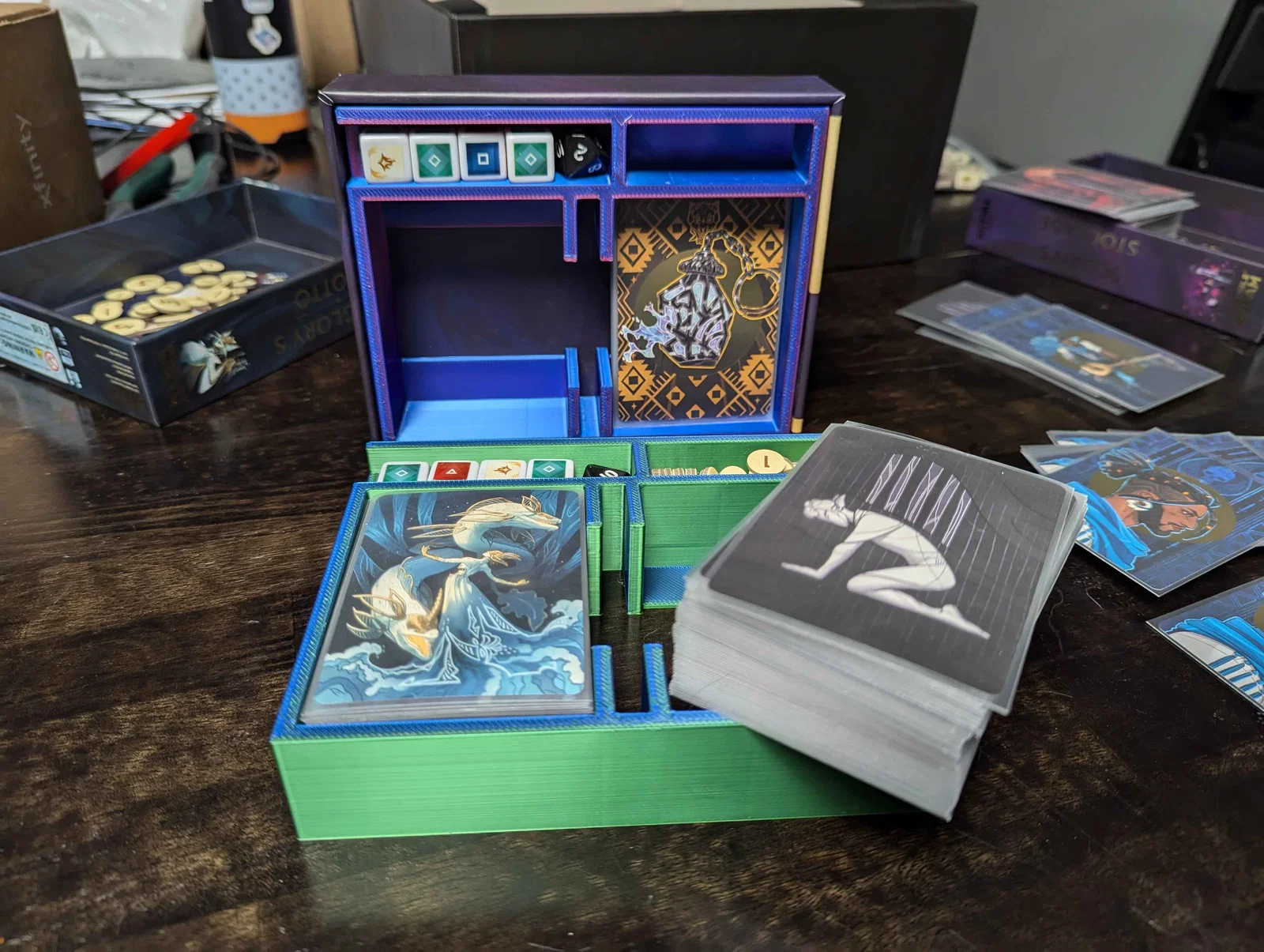 Khay đựng thiết kế riêng cho game Kinfire Delve, giúp sắp xếp gọn gàng các quân bài đã bọc sleeve (loại 100micron). Sản phẩm vừa vặn trong hộp gốc, bền bỉ và tiết kiệm nguyên liệu in nhờ cấu trúc tối ưu.