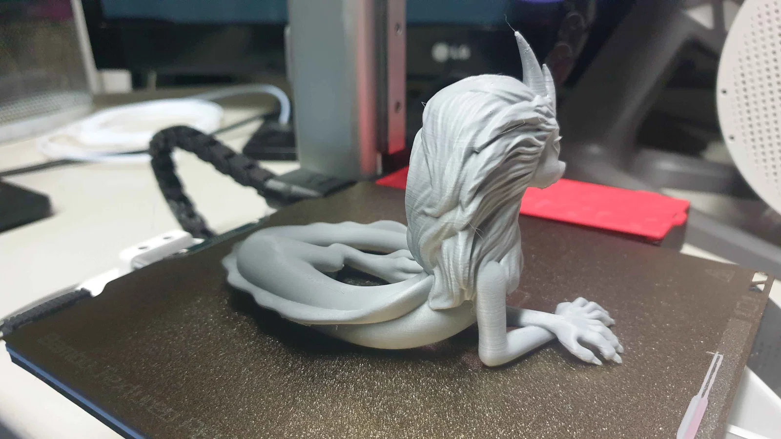 - Mặc dù mô hình có thể đứng vững nhờ tư thế nằm, bạn vẫn nên sử dụng support (vật liệu hỗ trợ) ở những phần như cằm, vây lưng hoặc phần tóc để tránh lỗi in ở những góc nhọn.