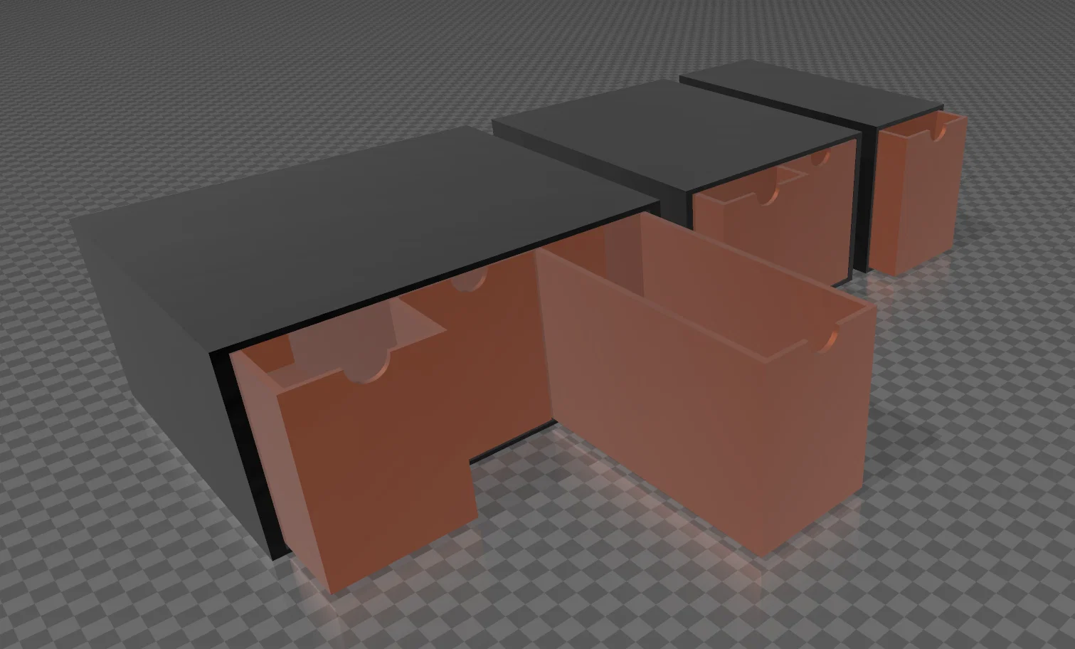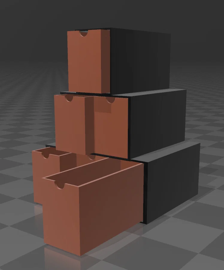 Đây là hệ thống hộp đựng tiện lợi cho các bộ bài của bạn. Mình đã thiết kế với dung sai hợp lý nên hộp sẽ in tốt trên hầu hết các dòng máy in 3D hiện nay. Ban đầu mình có tính thêm cơ chế khớp nối, nhưng mình thấy chắc cũng không cần thiết lắm, nếu thấy cần thì cứ dán keo lại là được. Tuy nhiên, nếu bạn nào muốn, mình có thể bổ sung tính năng đó ở phiên bản tiếp theo.
