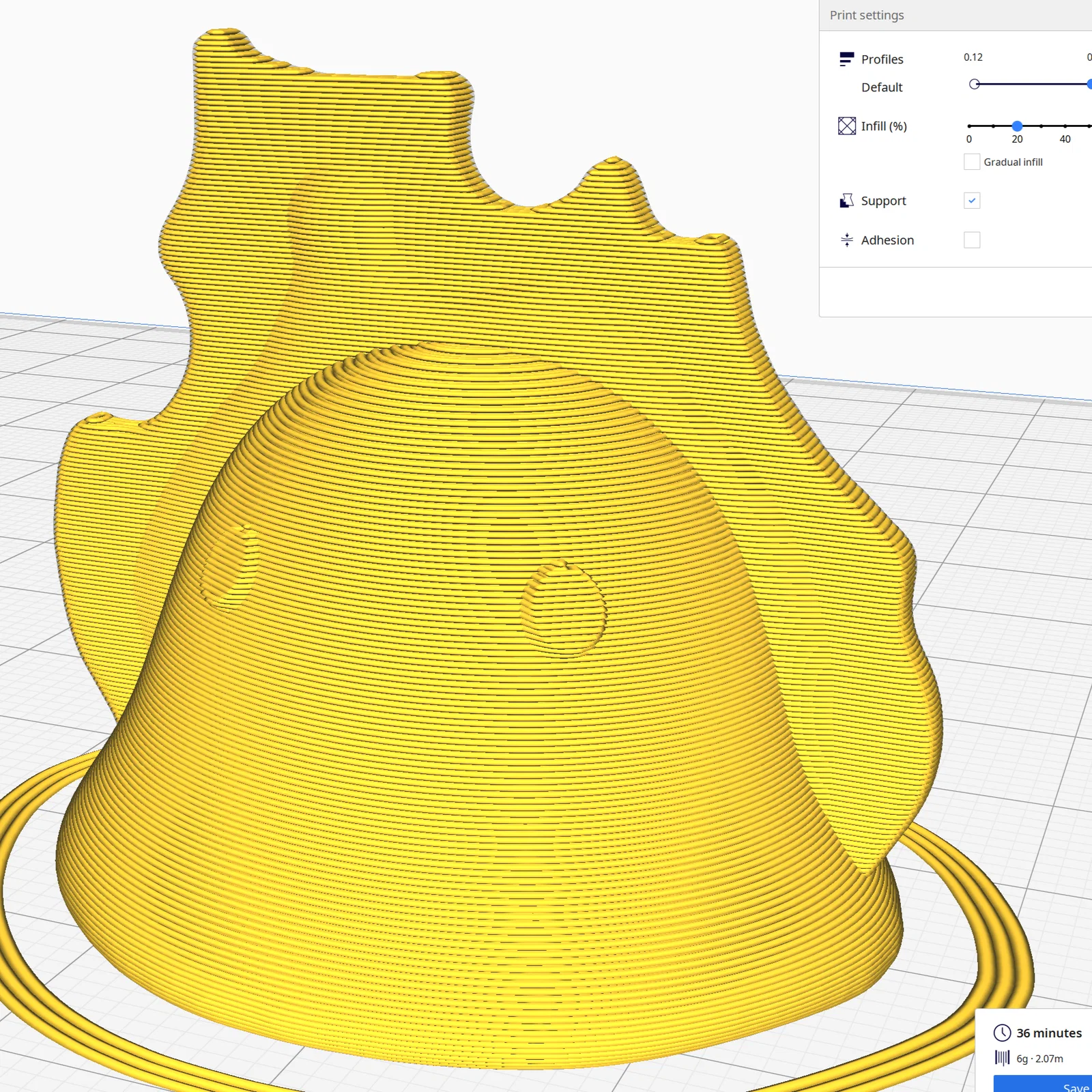 Bạn không cần dùng support đâu, nhưng nếu in kích thước lớn, phần mềm slicer có thể tự thêm support dưới mắt. Mình in thì không gặp vấn đề gì cả, nhưng bạn cứ lưu ý điều này nha.