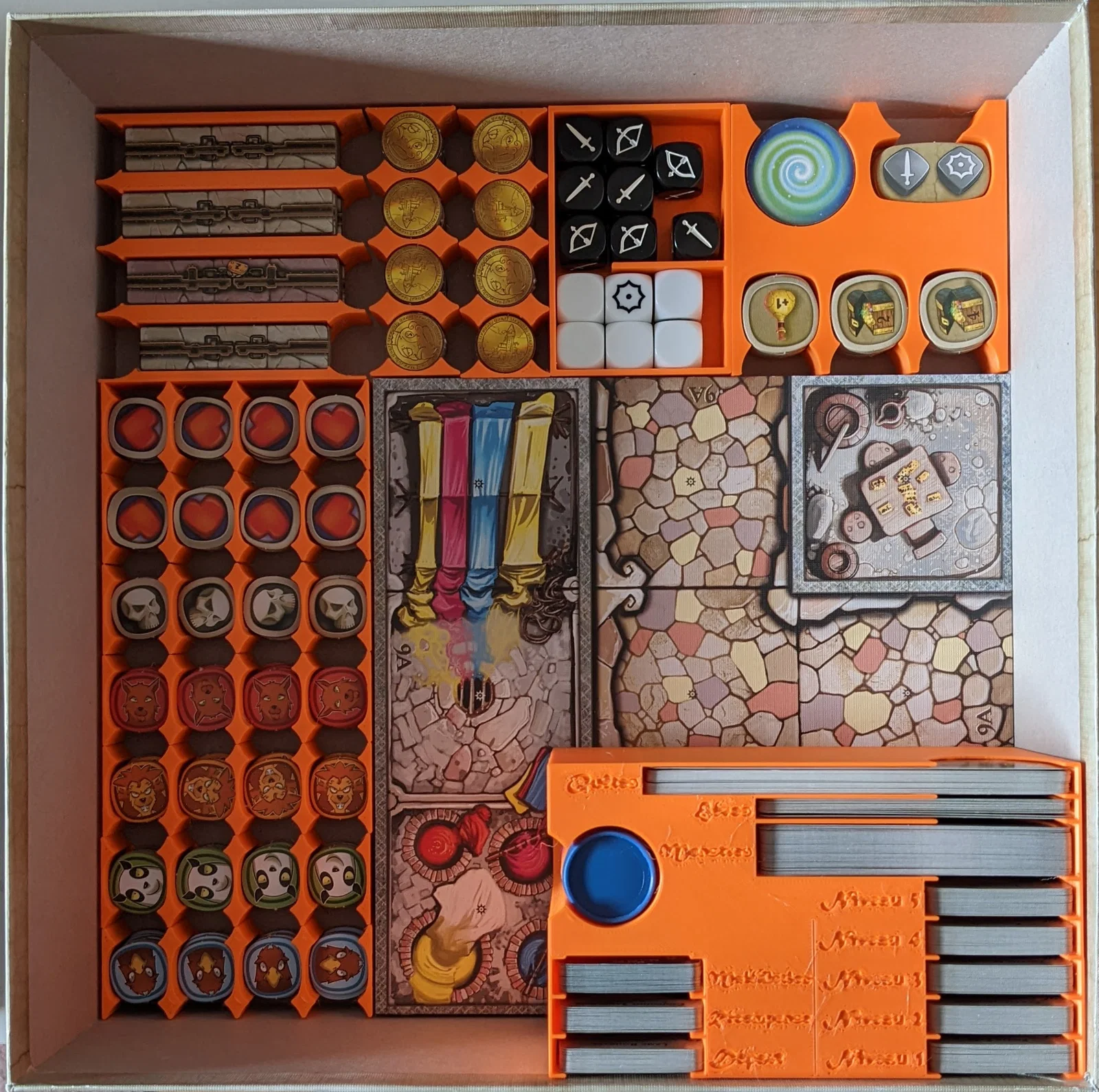 Sắp xếp toàn bộ token và thẻ bài trong bộ game Arcadia Quest thật gọn gàng và ngăn nắp. Thiết kế này được lấy cảm hứng từ các bản mẫu phổ biến trên Thingiverse, bao gồm cả tùy chọn khay đựng thẻ bài không có chữ.