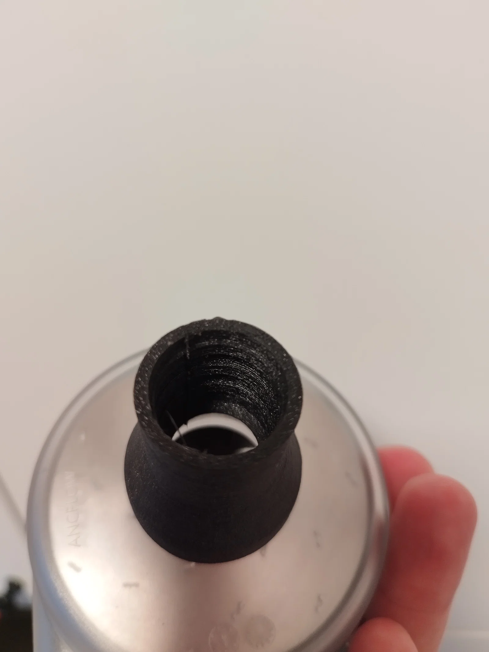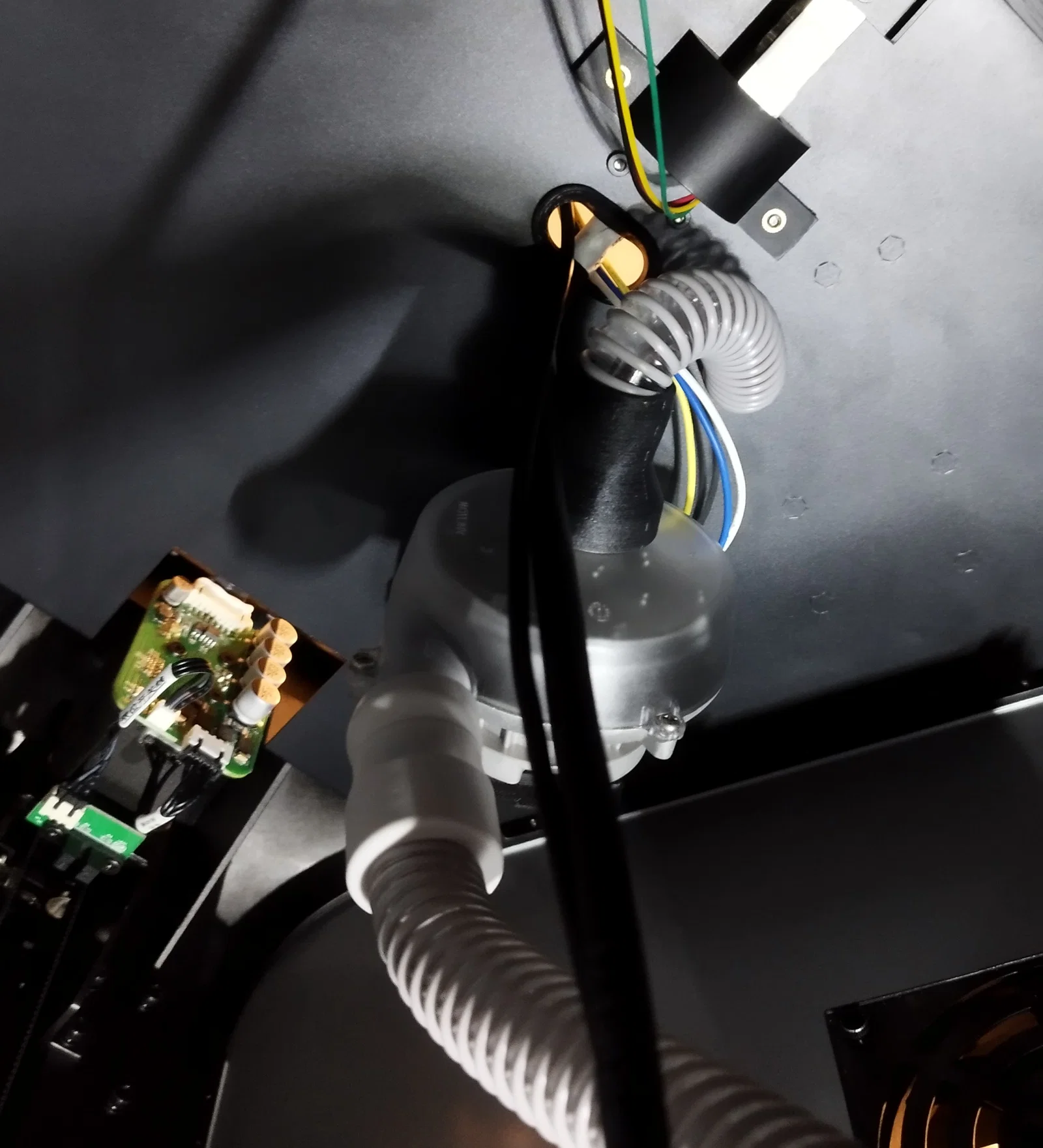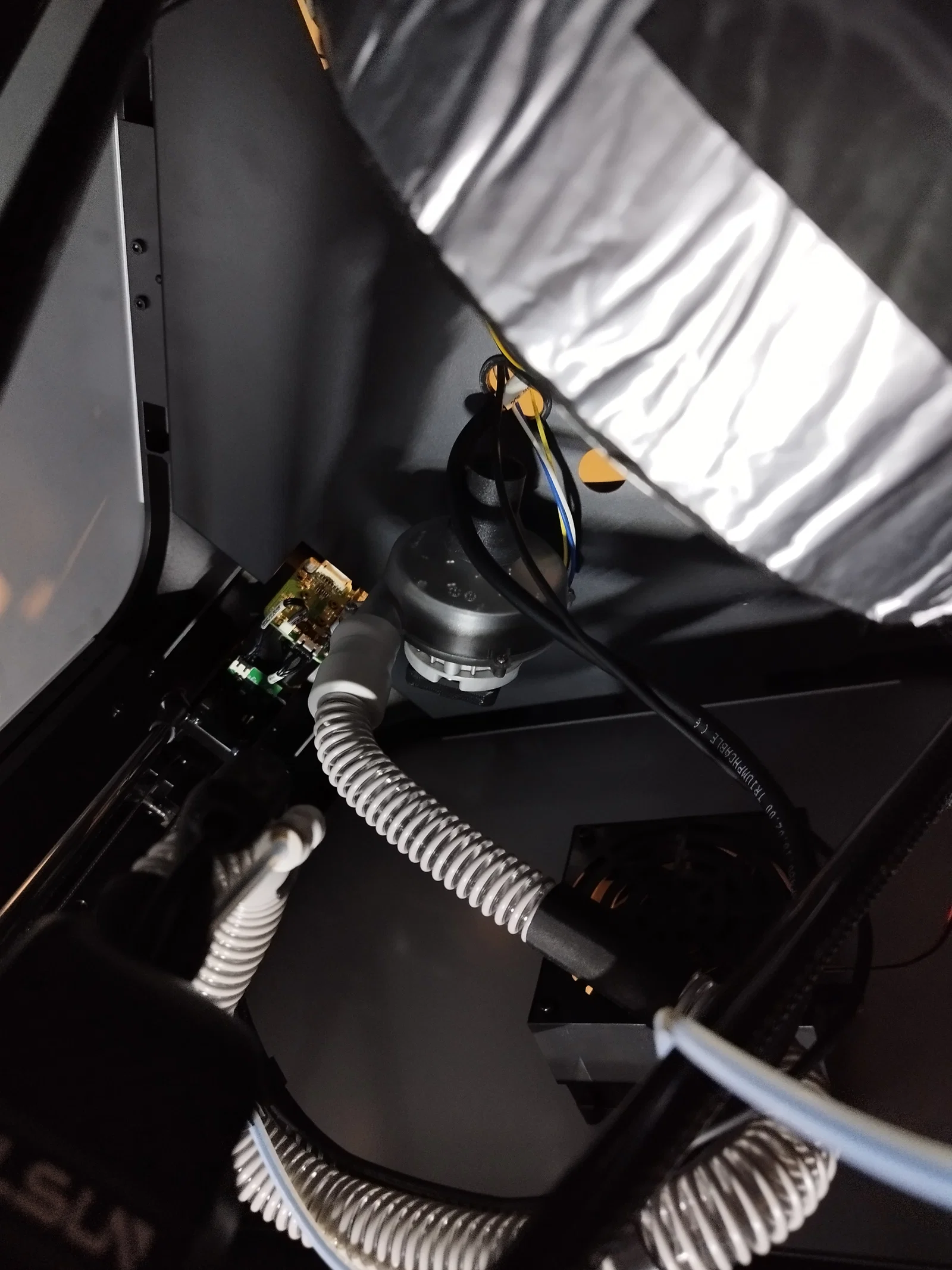 Sau khi lắp ống vào toolhead, hãy di chuyển nó xuống dưới đáy và đo đường kính ngoài để xem độ dài ống cần thiết là bao nhiêu. Sau đó giữ đầu ống vào quạt và di chuyển toolhead lên lại. Nếu mọi thứ vừa vặn thì bạn có thể cắt ống. Khi quạt đã được lắp, hãy nối đoạn ống đã cắt vào đầu chuyển đổi TPU/TPE, sau đó nối cả hai vào cửa hút của quạt. Luồn nó qua lỗ hút gốc và cắm vào phần vent-in. Nếu cần thì hãy cắt bớt ống cho vừa, mình đã cắt khoảng 180mm nhưng khá sát. Bạn Marshal trong phần bình luận khuyên nên để 190-195mm, hãy làm theo mức đó nhé! Khi lắp tấm che, hãy dán nó vào nắp rồi đóng lại. Việc này hơi khó một chút, ống có thể cần dài hơn xíu nhưng vẫn hoạt động ổn.