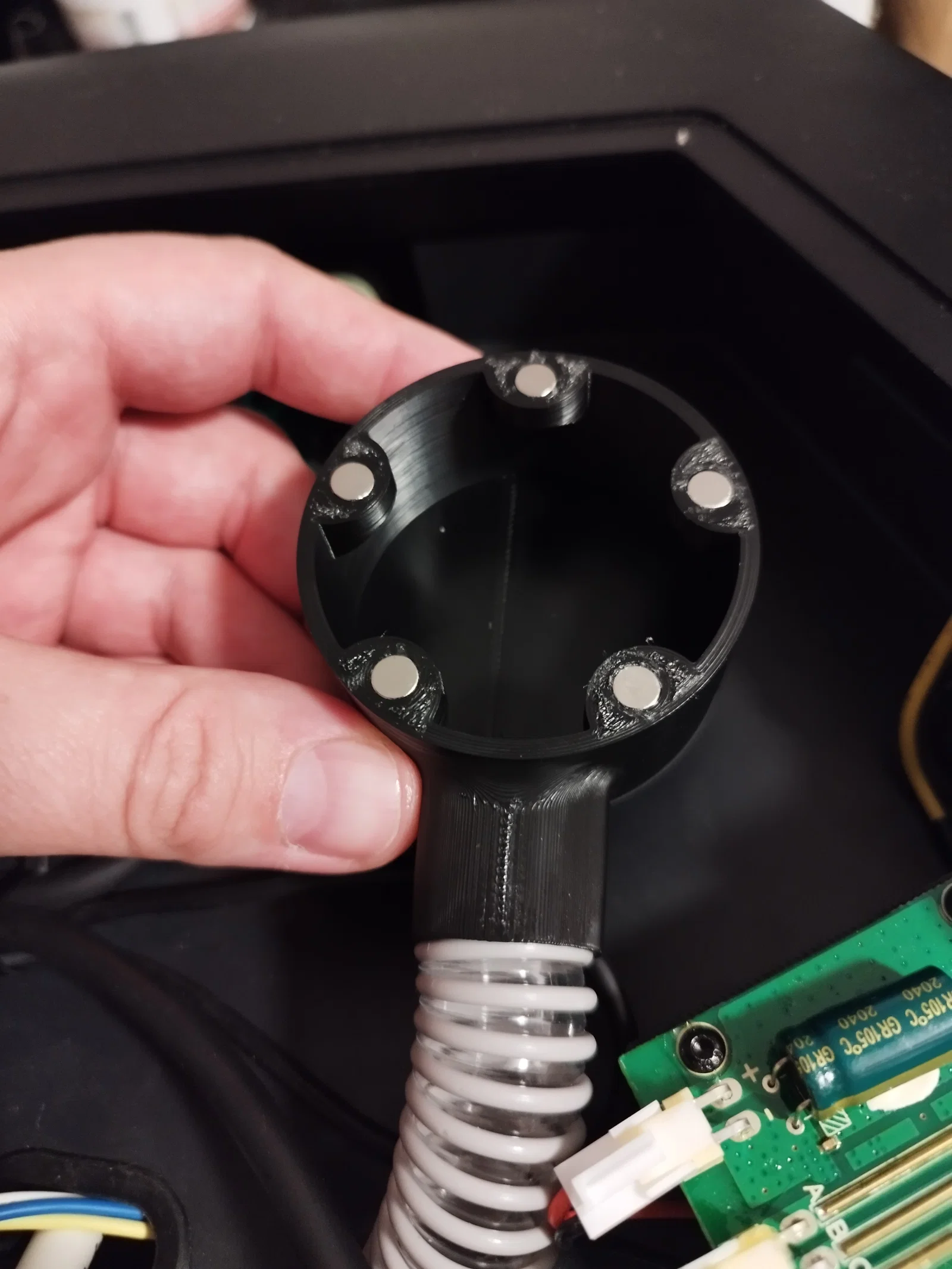 Để chuẩn bị phần vent-in, bạn hãy gắn vài viên nam châm đường kính 6x3mm vào. Tại đầu của giá đỡ mới, bạn cần lắp các ốc nhiệt M3 (loại thường dùng cho Voron), kích thước 5,0 x 4,2 x 4,0.