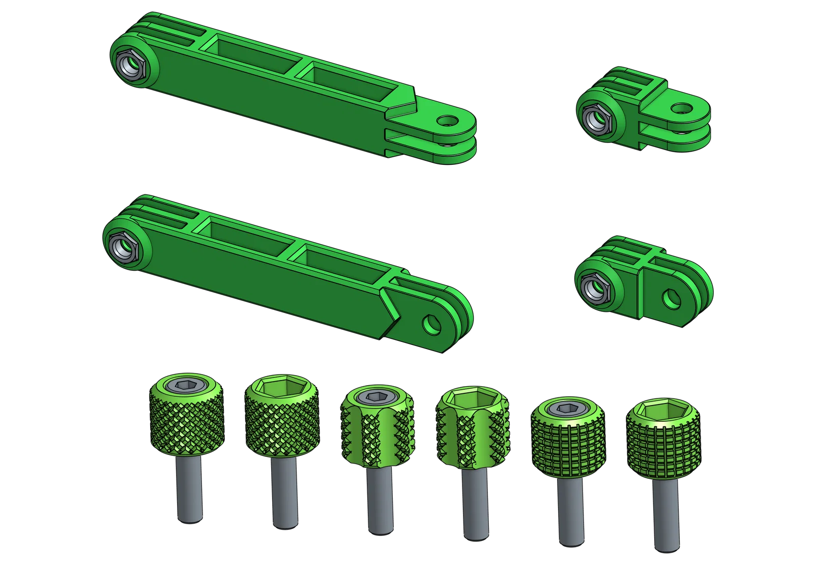 Bộ cánh tay và núm vặn tùy chỉnh cho Hệ thống gắn lắp Modular, tương thích hoàn hảo với phụ kiện GoPro. Hỗ trợ thay đổi độ dài, góc xoay và tích hợp thanh gia cố, cho phép bạn tự thiết kế dễ dàng trên Onshape.