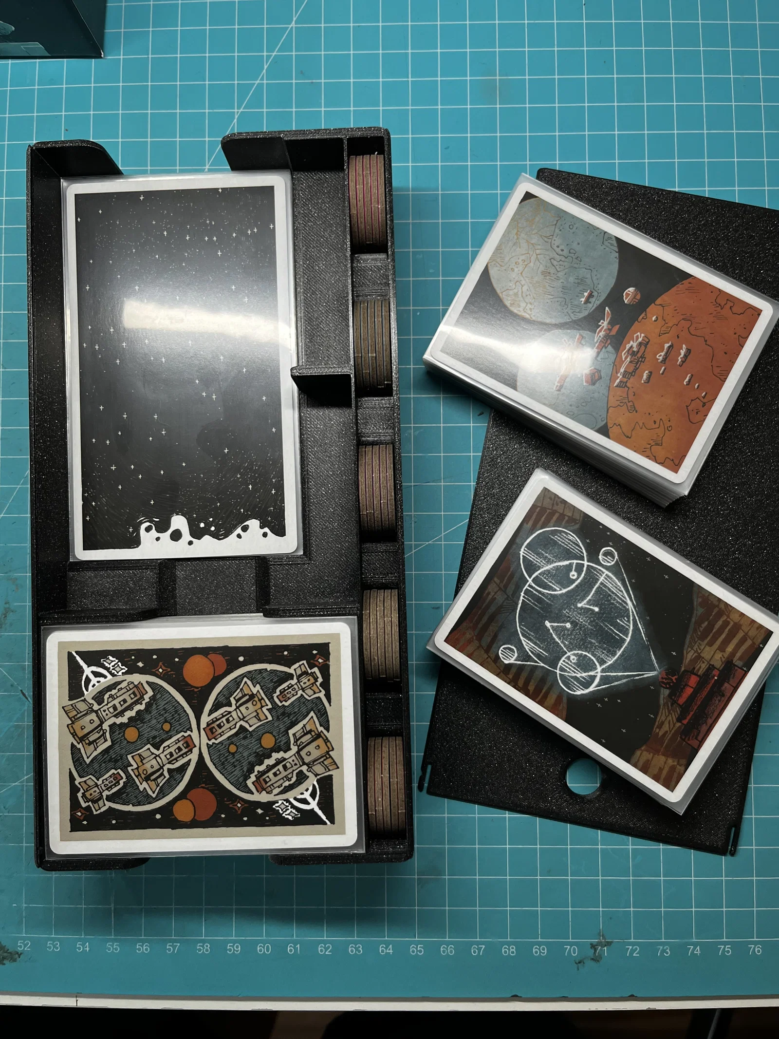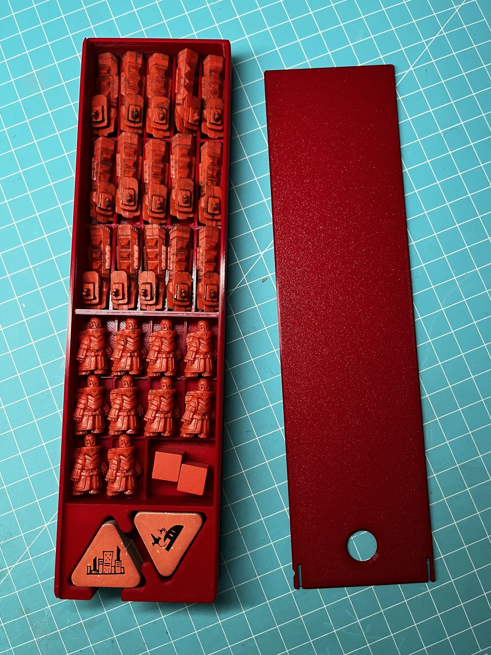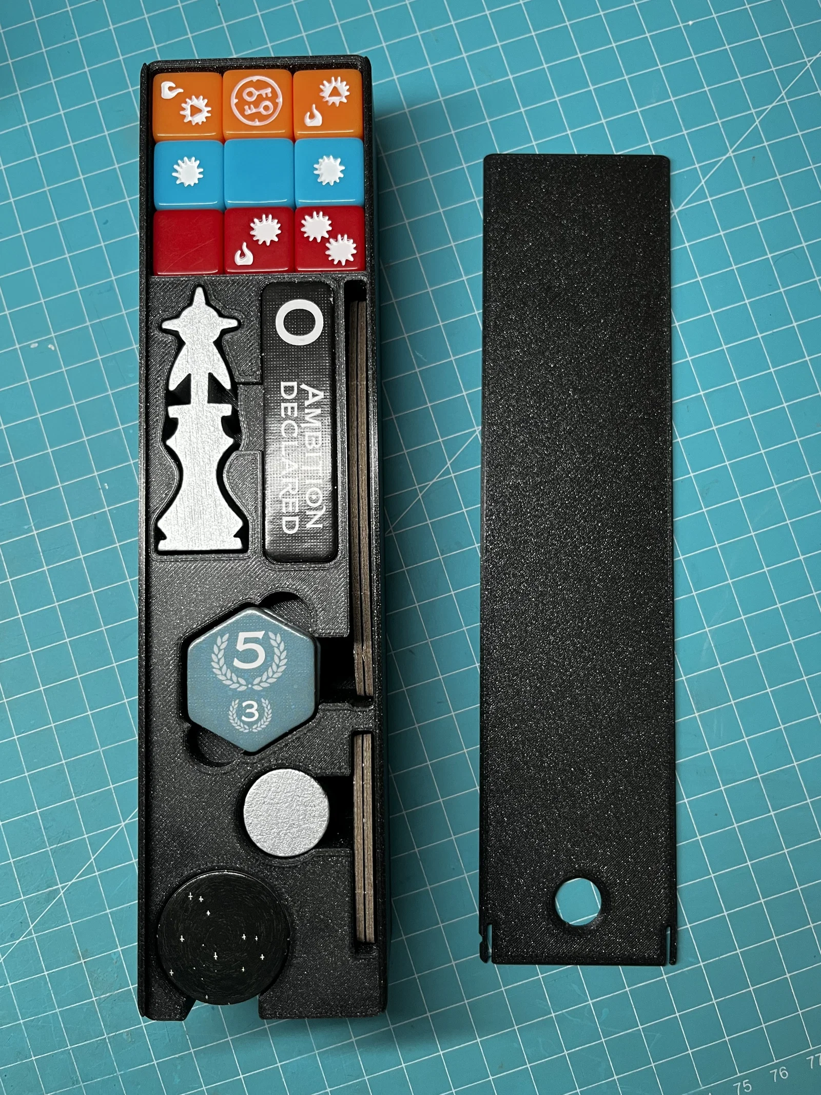 Đây là khay đựng (insert) cho board game Arcs của Leder games. Nó giúp bạn cất gọn tất cả linh kiện cho bộ game cơ bản và bản mở rộng Leaders and Lore. Bản mở rộng Campaign vốn đã có sẵn khay đựng khá ổn nhưng lại làm cái hộp trở nên rất cồng kềnh. Một trong những điểm mình thích ở tựa game này là hộp rất gọn gàng, tiện mang đi mọi nơi, đó là lý do mình thiết kế bộ khay này. Bộ insert bao gồm: Bốn khay cho người chơi: bạn có thể cất các mảnh gỗ cơ bản hoặc mô hình từ bản mở rộng (như hình mình chụp). Khay đựng token: chứa xúc xắc, token người chơi đầu tiên, token tham vọng, v.v. * Khay đựng thẻ bài và tài nguyên: nơi để chứa các lá bài của bản mở rộng Leaders and Lore. Thẻ bài được bọc bằng Gamegenic Prime card sleeves Standard cho các lá bài thường và Gamegenic Prime card sleeves Tarot cho các lá bài Leader. CẬP NHẬT: Theo một số phản hồi, mình đã tạo thêm một phiên bản khay đựng thẻ bài với độ sâu tăng thêm 1mm. Mình in các khay cho người chơi theo màu tương ứng của từng người. Còn đối với khay đựng token và thẻ bài, mình sử dụng Prusament Galaxy black PLA, tạo cảm giác “vũ trụ” rất đẹp mắt :) Nếu bạn là dân chơi board game thứ thiệt thì đừng bỏ qua tựa game này nhé! Nó thật sự rất tuyệt vời!