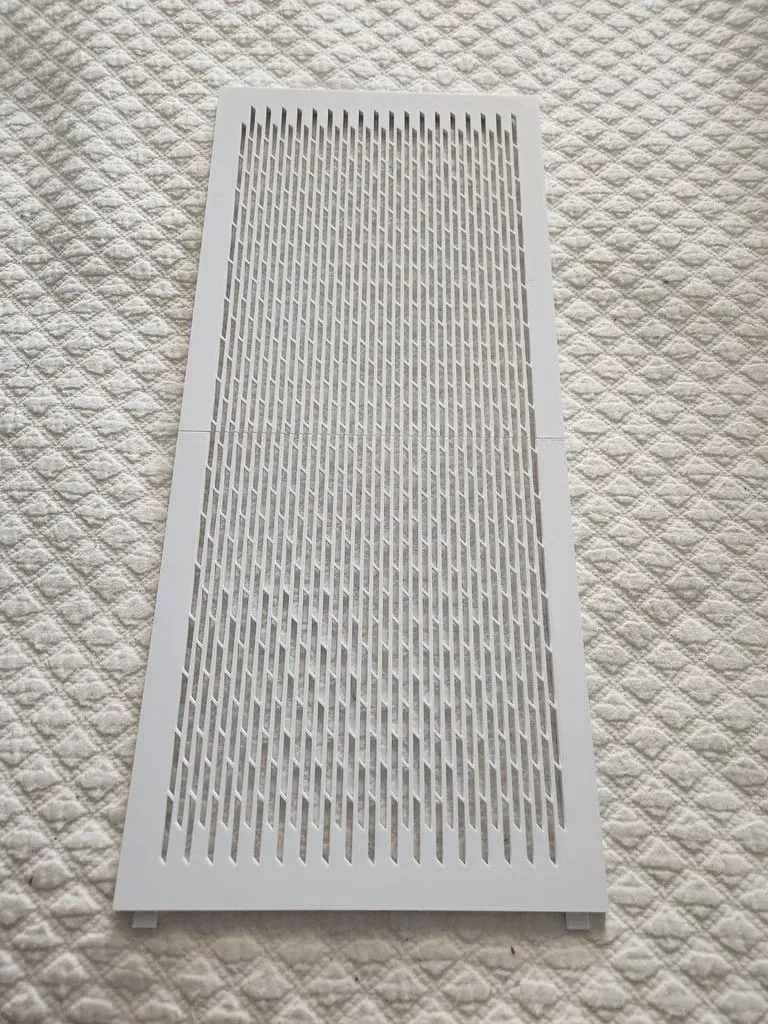 Có một vài tùy chọn thương mại cho một panel tập trung vào luồng không khí cho o11 Dynamic XL, nhưng chúng khá đắt. Các panel khác mà tôi có thể tìm thấy đều dành cho o11 evo hoặc tiêu chuẩn. Vì vậy, tôi đã làm cái này, nó được thiết kế để phù hợp với một chiếc CR10 hoặc máy in có kích thước tương tự. Tôi đã thêm STL của toàn bộ panel để bạn có thể cắt nó thành các mảnh như bạn thấy phù hợp. Tôi đã dán hai mảnh lại với nhau một cách cẩn thận và điều đó đã hoạt động tốt. Bạn sẽ cần một chút hỗ trợ ở hai tab dưới cùng. Thiết kế lưới phù hợp với phần còn lại của các lỗ thông gió trong vỏ.
