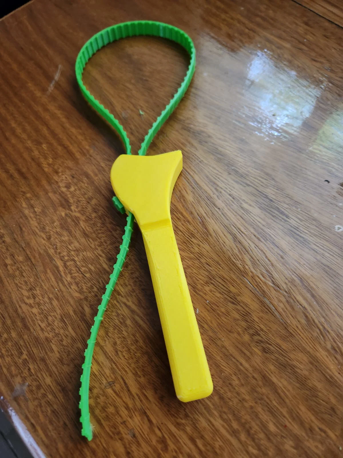 Dụng cụ hỗ trợ mở nắp chai lọ hoặc lọc nhớt xe cực kỳ hiệu quả. Thiết kế gồm tay cầm nhựa cứng (PLA/ABS) và dây đai nhựa dẻo (TPU) giúp tăng độ bám, dễ dàng vặn mở các loại nắp bị siết chặt.