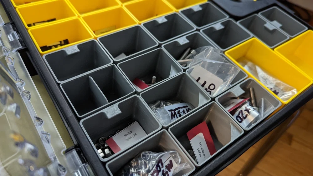 Mình rất thích hệ thống GridFinity của Zach Freedman (https://www.thingiverse.com/thing:5362711) nhưng không gì bằng những chiếc khay đựng đồ di động có thể đóng kín, giúp linh kiện không bị rơi vãi lung tung trong xưởng. Thay vì in cả cái hộp, hãy để các nhà sản xuất lo việc đó và chúng ta chỉ cần tùy biến lại hệ thống của họ theo ý mình...