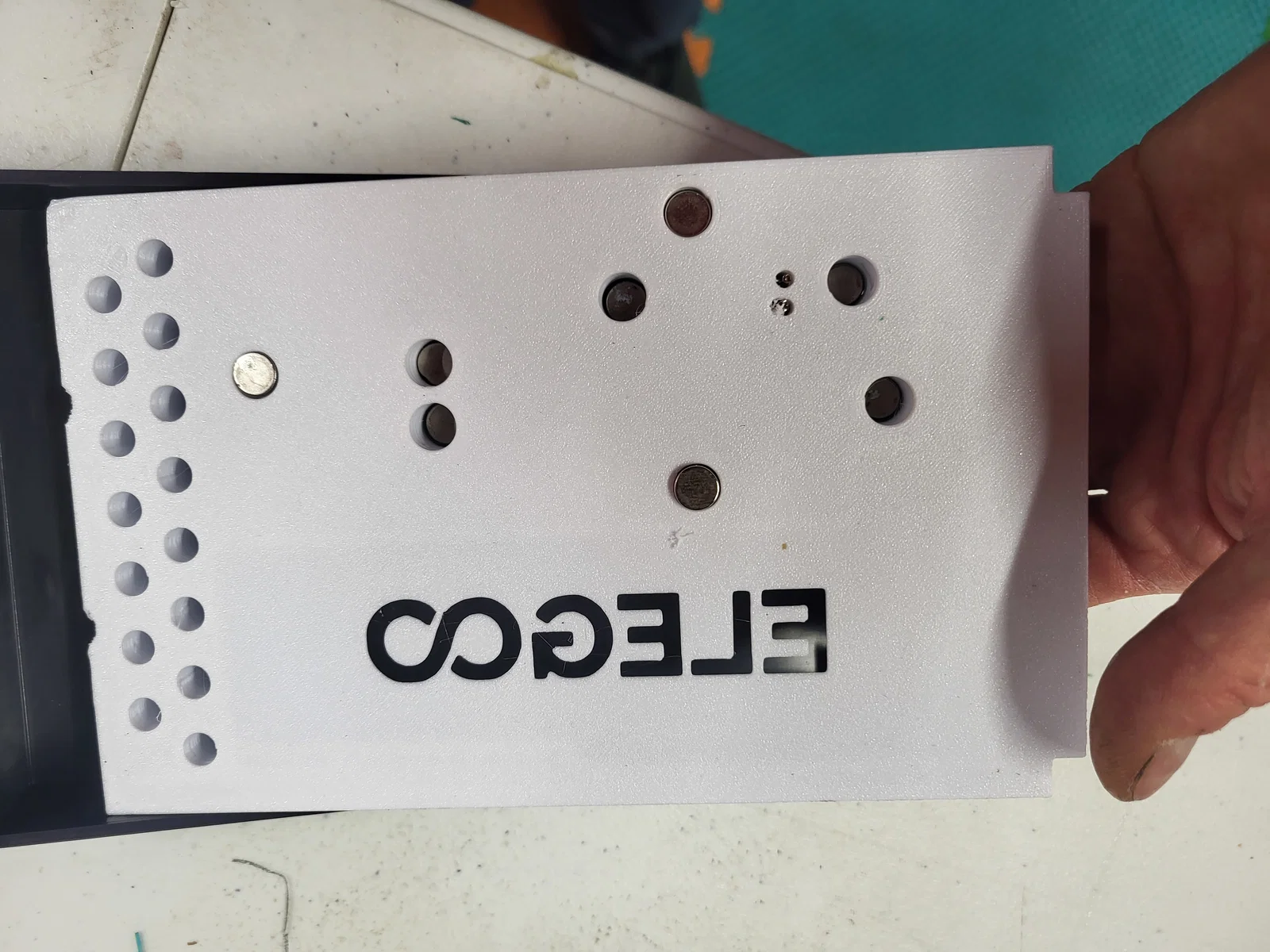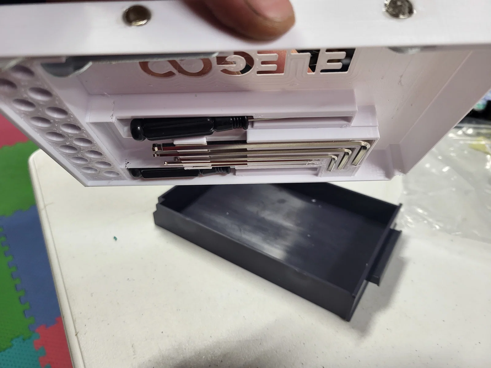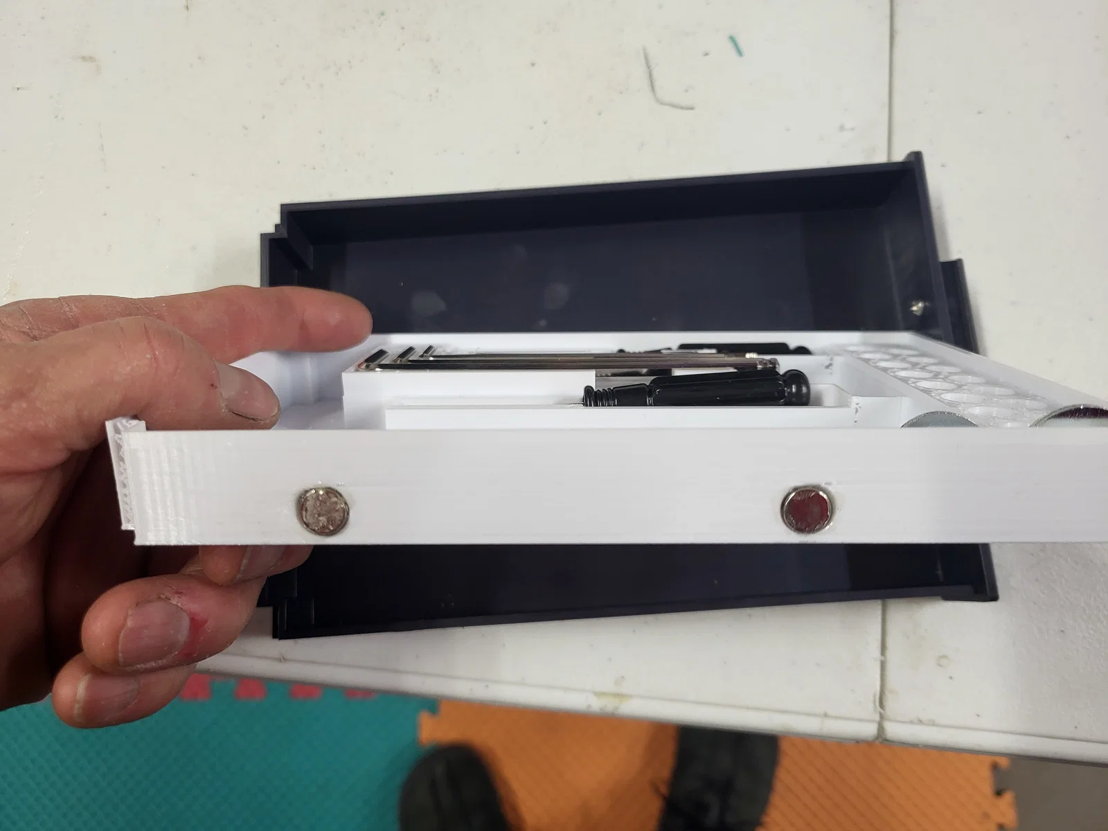Mình rất thích bản thiết kế gốc, nhưng do máy in của mình đặt nghiêng sang một bên, nên mỗi khi mình mở hoặc tháo ngăn kéo ra thì các dụng cụ bên trong hay bị xáo trộn lung tung. Ngoài ra, một trong các vị trí để cờ lê lục giác bị thiếu sót chưa hoàn thiện. Mình đã cải tiến bằng cách dùng nam châm để giữ cố định dụng cụ. Giờ đây, mình thậm chí có thể lật ngược khay mà dụng cụ vẫn nằm yên tại chỗ. Mình đã dùng keo dán cố định các viên nam châm lại. Lưu ý là phần để đầu phun (nozzle) sẽ không có nam châm vì chúng không bị hút nam châm. Bạn có thể tùy ý gắn nhiều hoặc ít nam châm tùy thích, và nếu muốn lực hút mạnh hơn thì chỉ cần gắn chồng thêm nam châm vào vị trí đó. Loại nam châm mình sử dụng là loại mua từ HF.