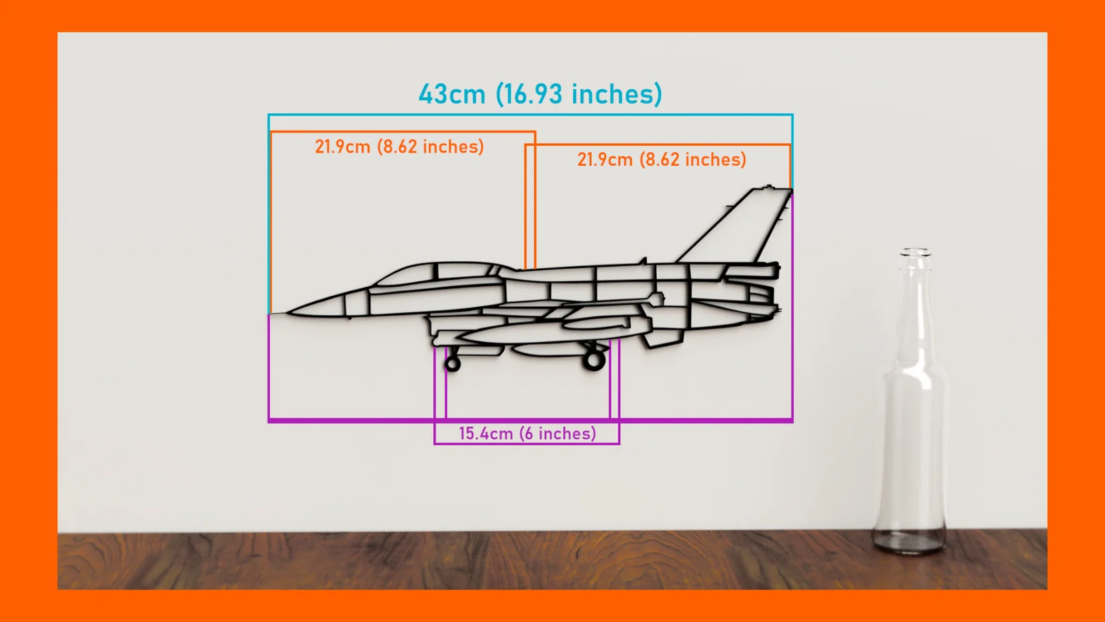 Mình đã thiết kế mô hình treo tường hình chiếc F-16 này với kích thước 43cm (16.93 inch). Bạn có thể in nó thành một, hai hoặc ba mảnh tùy ý, vì vậy ngay cả những máy in 3D có bàn in nhỏ cũng có thể in được kích thước gốc của mô hình. Nếu muốn phóng to hoặc thu nhỏ thì bạn cứ tự nhiên điều chỉnh nhé! Độ dày gốc của mô hình là 3cm.