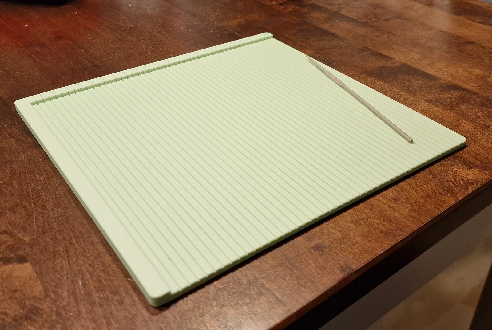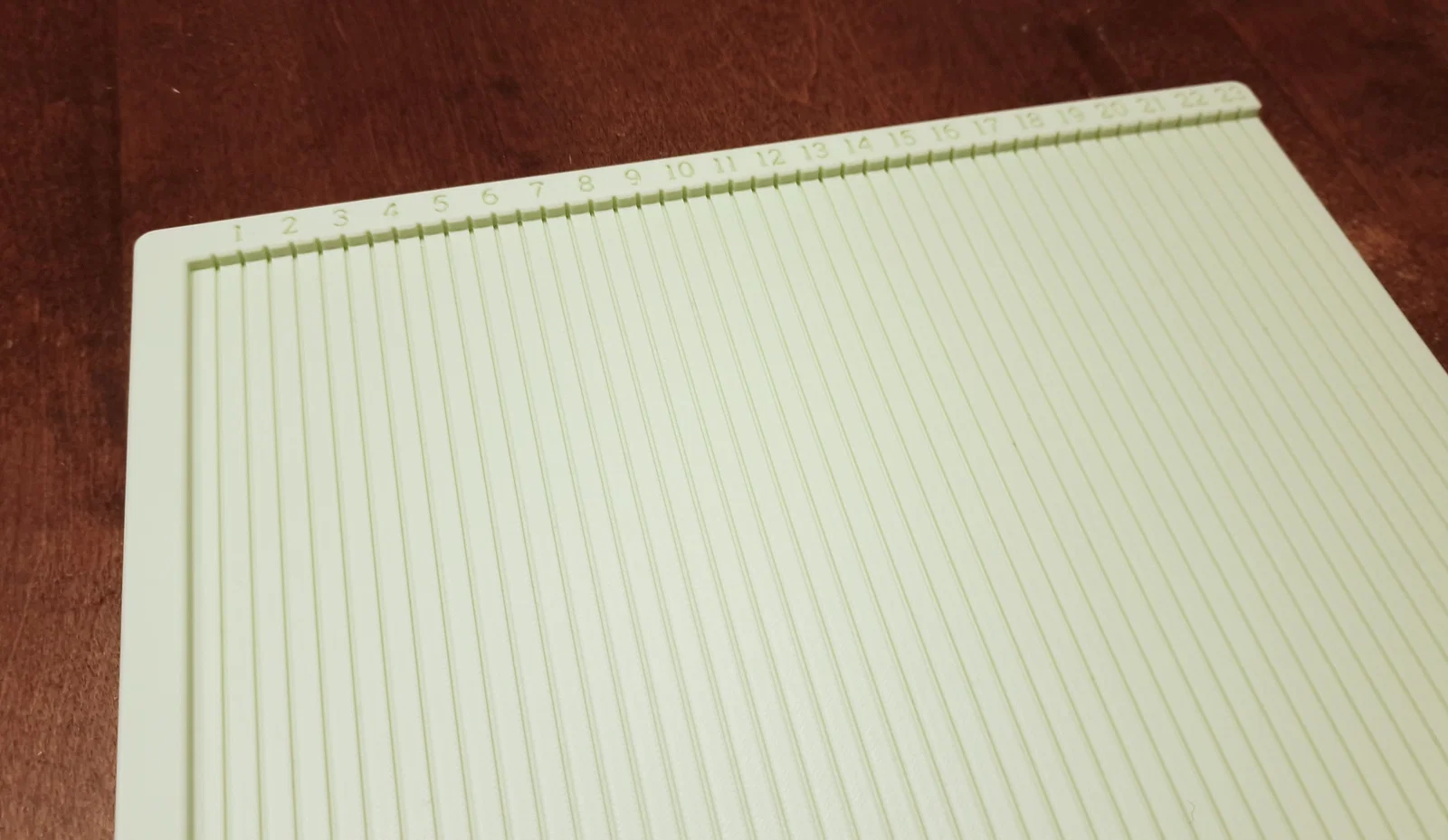 Hai vợ chồng mình đã cùng làm cái bảng cấn giấy (scoring board) này để phục vụ cho sở thích làm đồ thủ công bằng giấy (papercraft) của mình. Bảng được in với phần viền (brim) và nhiệt độ bàn in cao hơn mức bình thường một chút để tránh tình trạng bị bong tróc giữa chừng khi đang in. Nhờ cách này mà mình không còn gặp vấn đề bị nhấc mép khi in nữa. Mô hình có các đường cấn cách nhau mỗi 0,5 mm và đánh số mỗi 10 mm. Để cấn giấy, mình dùng một cây kim đan móc nhỏ. Bạn có thể dùng bất kỳ dụng cụ nào có đầu tù vừa khít với đường rãnh là đều dùng được nhé.