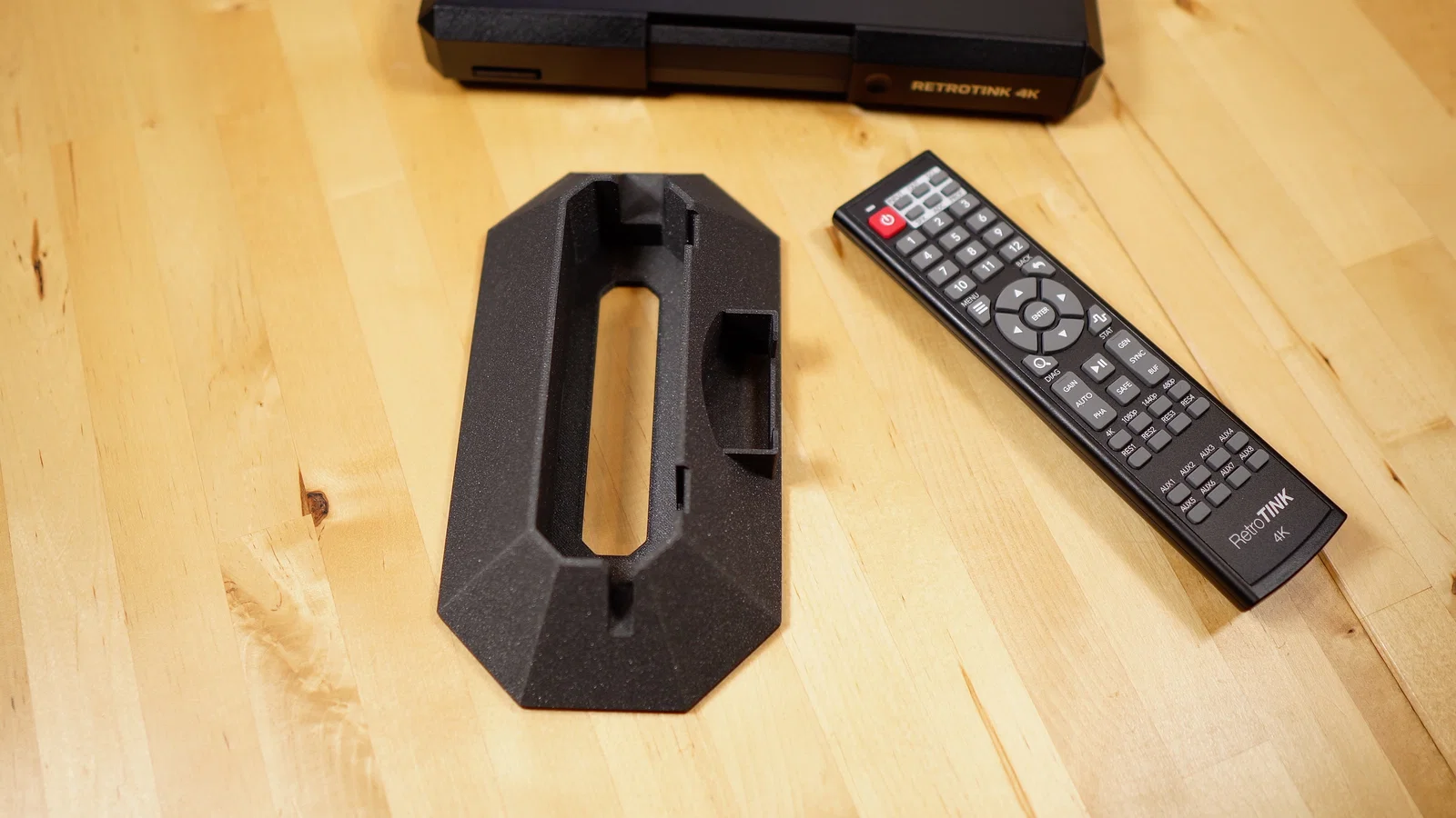 Chiếc RetroTINK 4k của bạn đang chiếm quá nhiều diện tích? Hãy sử dụng chân đế này để dựng đứng thiết bị, giúp tối ưu không gian bàn làm việc và có thêm khay cất remote cực kỳ tiện lợi.