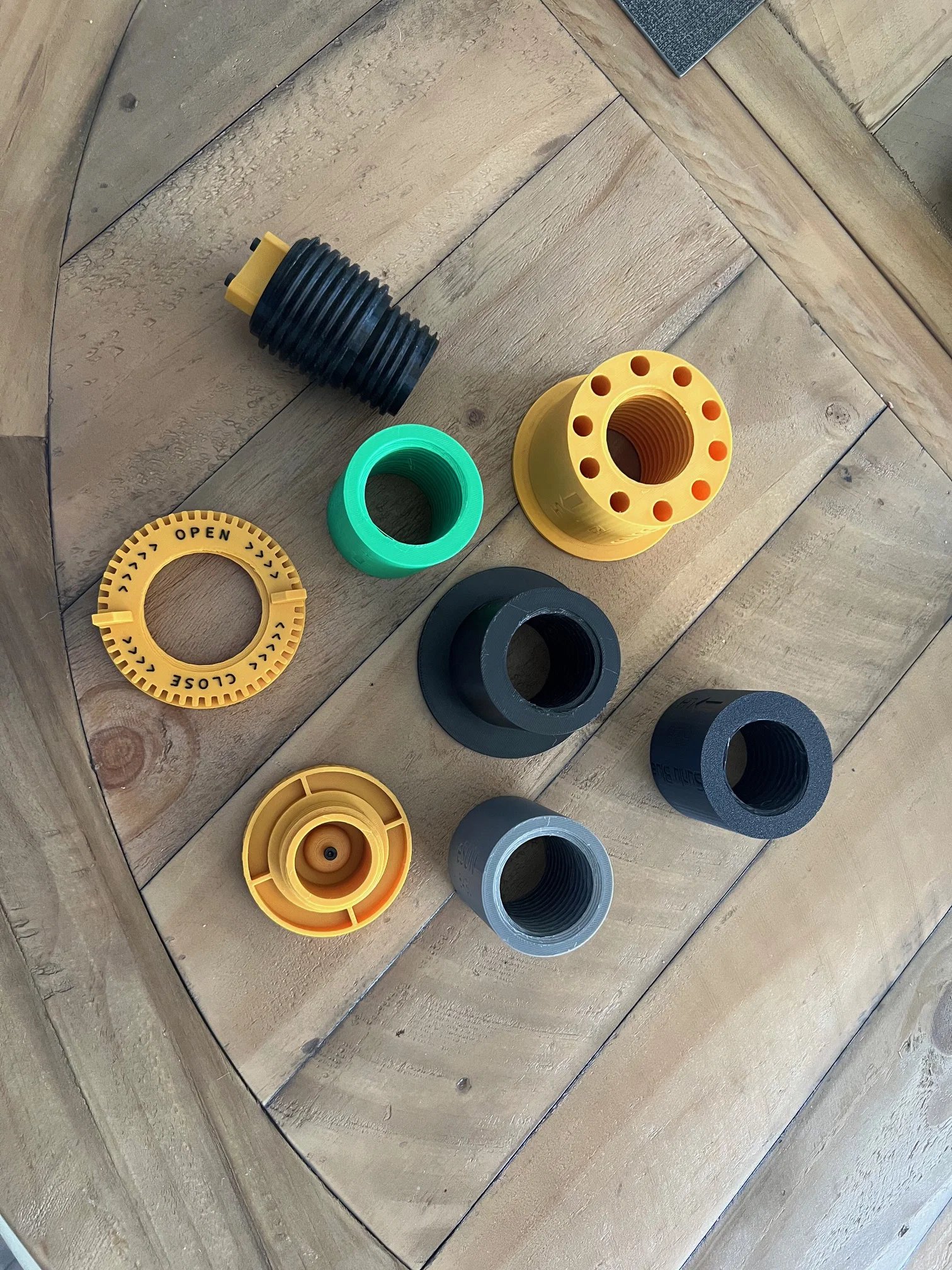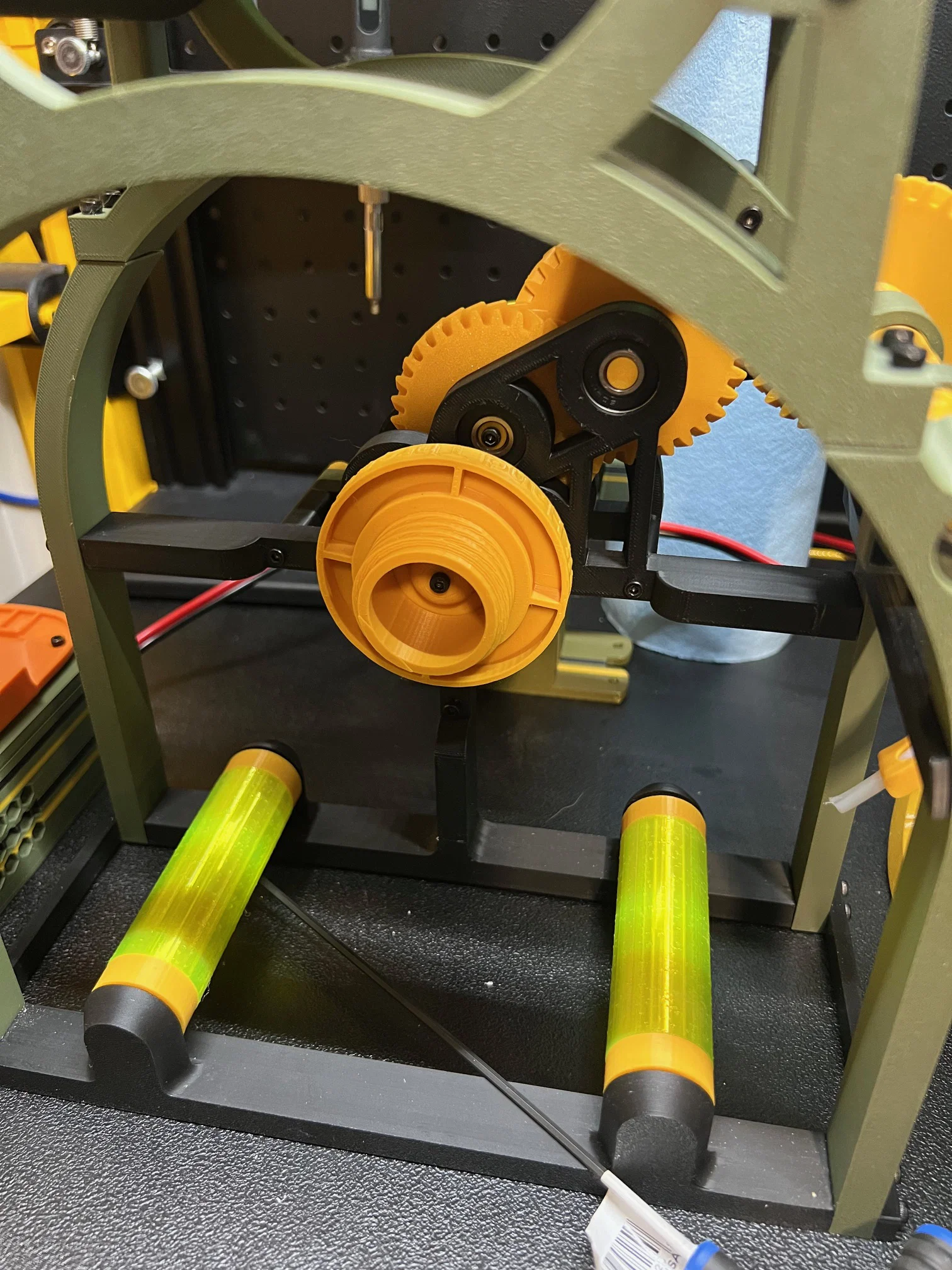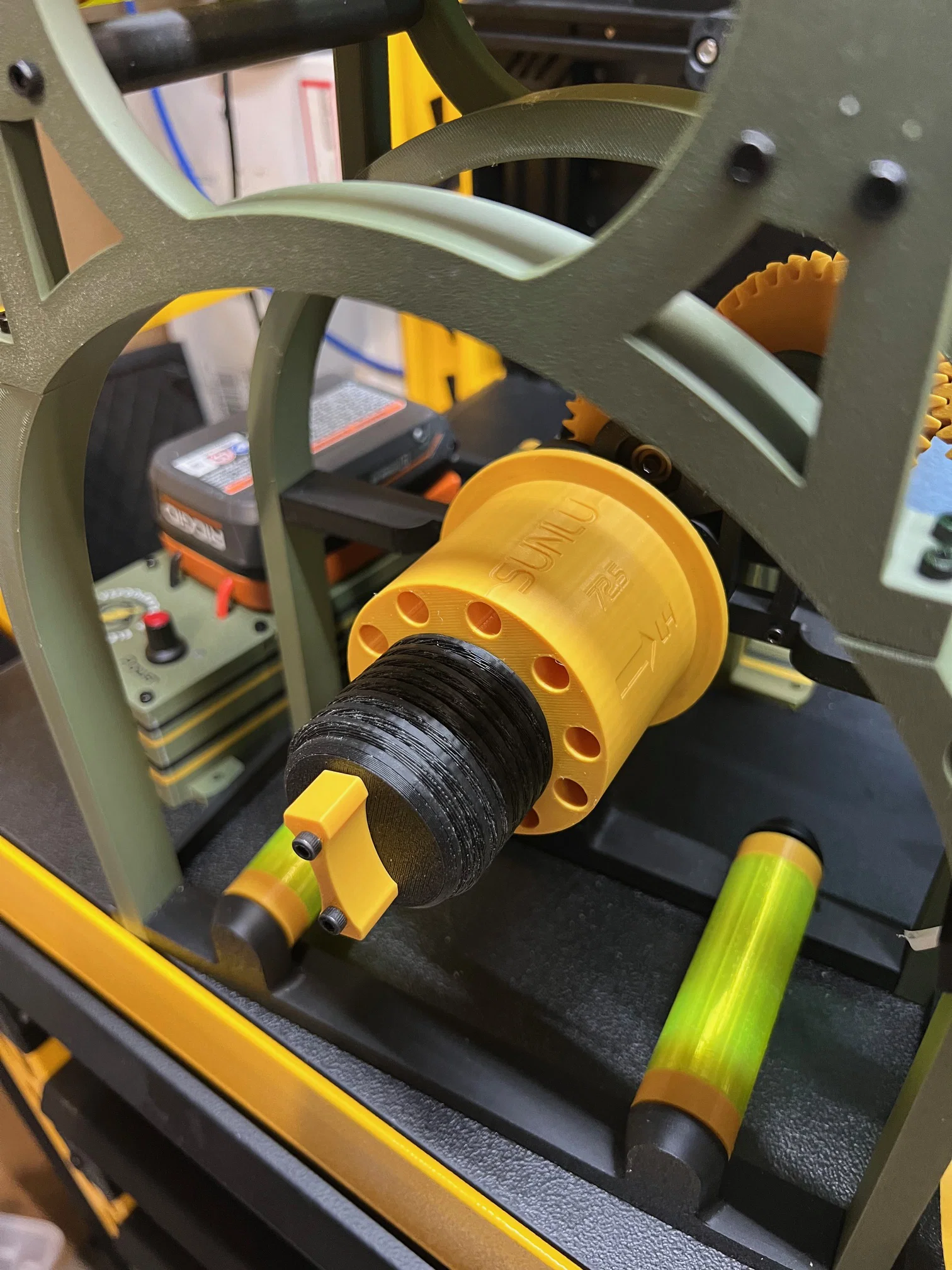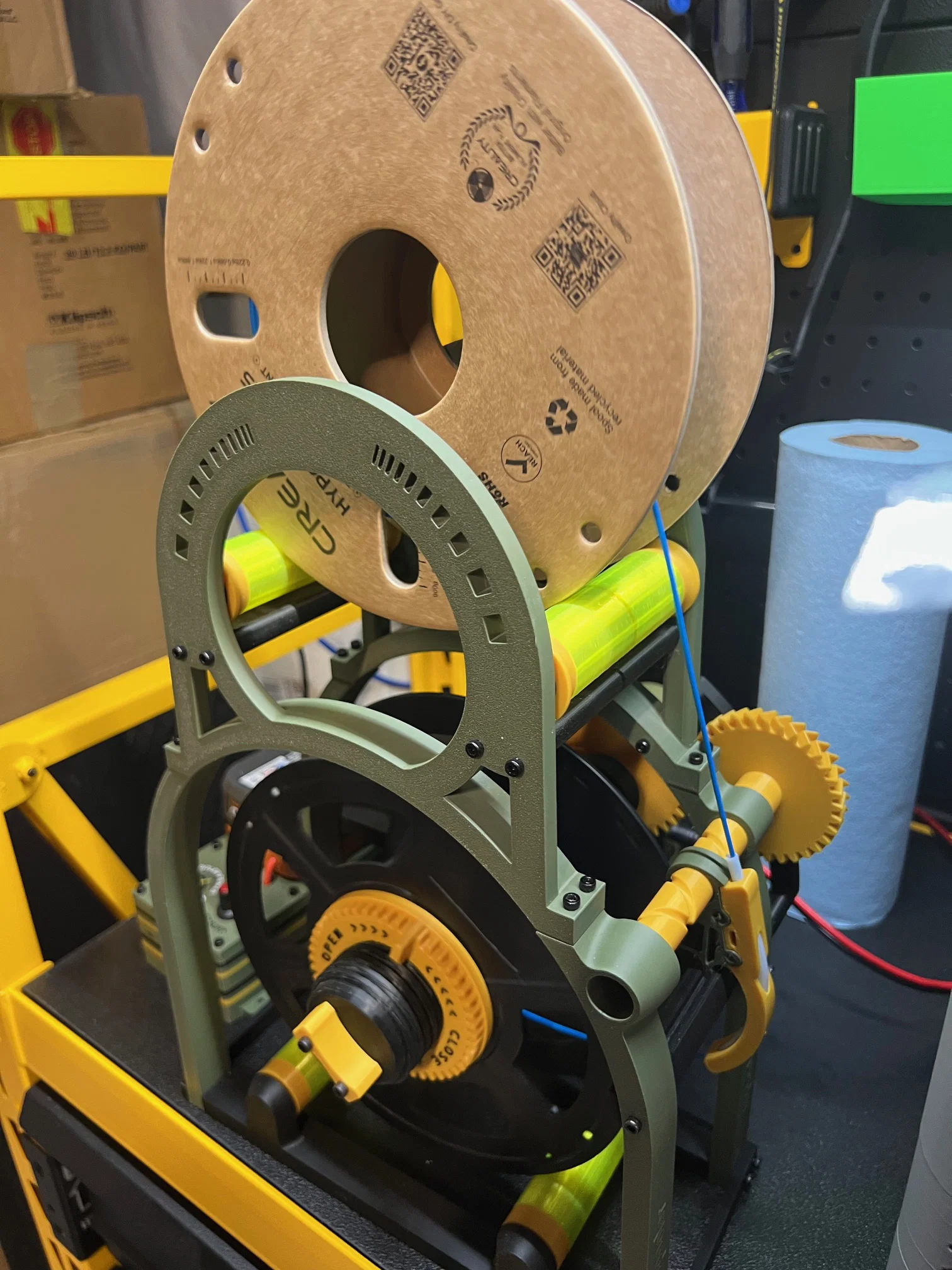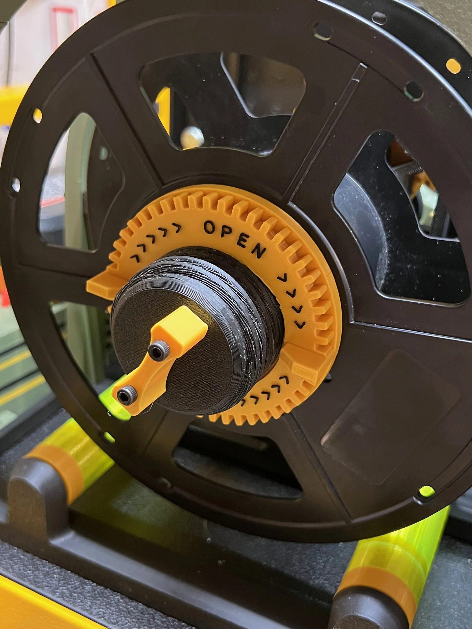 Mình là một fan cứng của hệ thống V-Spooler, nhưng vì mình dùng sợi in từ nhiều hãng khác nhau nên mình muốn tìm một giải pháp linh hoạt hơn. Sau khi tham khảo các mẫu thiết kế từ cộng đồng, mình đã tự vẽ ra một bộ trục xoay (spool spindle) có thể thay thế các lõi (core) tùy chỉnh để vừa vặn với từng loại cuộn nhựa mình có.