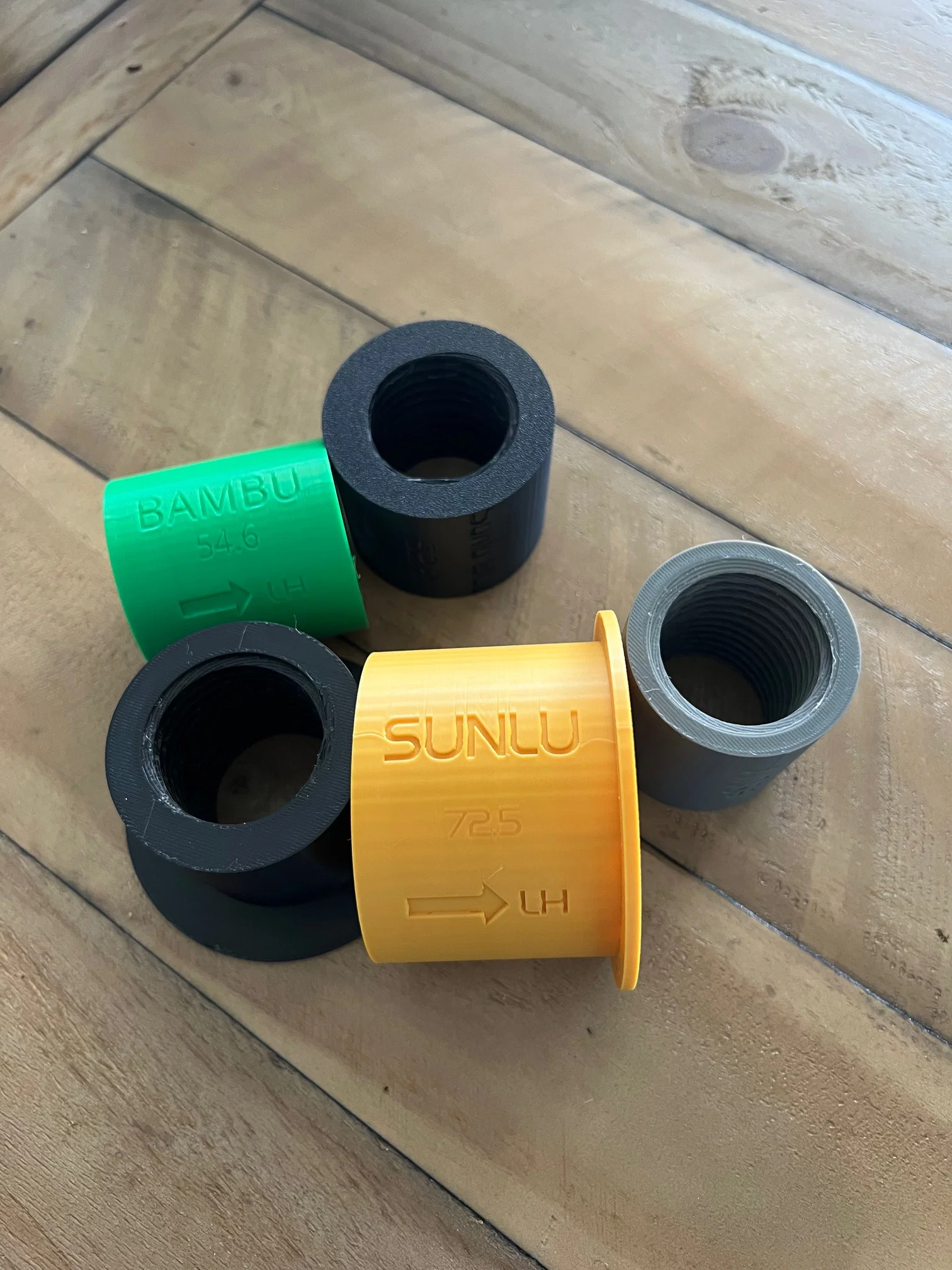 Các lõi này được thiết kế với cả ren trái và ren phải. Mình có kèm theo một mẫu ren (template) để mọi người có thể tự thiết kế thêm lõi nếu muốn. Hiện tại mình đã tạo sẵn 6 loại lõi phổ biến mà bạn có thể thấy hữu ích. Mỗi lõi đều được khắc rõ tên hãng, kích thước và ký hiệu ren trái. Mình cũng in mỗi loại bằng một màu khác nhau để dễ nhận biết—ví dụ như dùng nhựa màu xanh của Bambu cho lõi của hãng Bambu.
