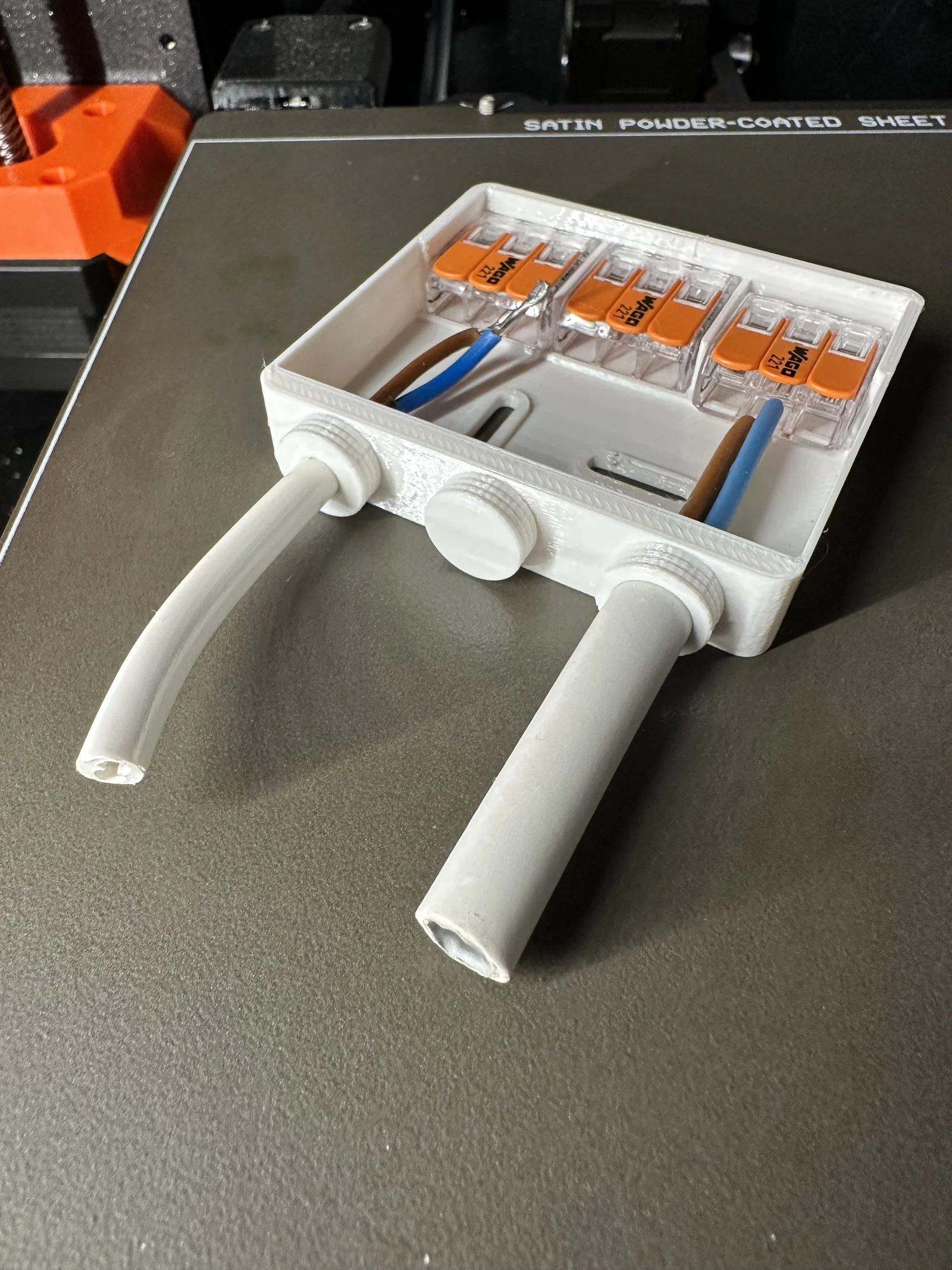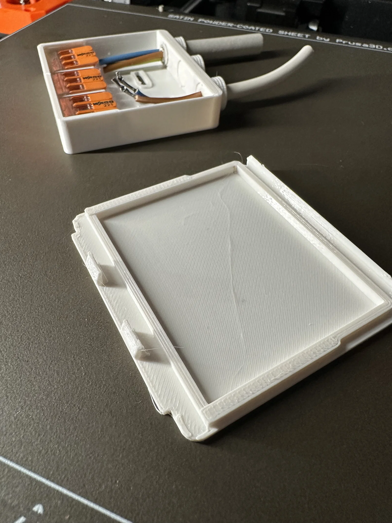 Hộp nối dây nhỏ gắn bề mặt, dùng để giấu dây cáp và đầu nối Wago. Hãy chọn loại nắp phù hợp với kích thước dây cáp của bạn. Nếu bạn đang tìm kiếm một loại hộp nối có nhiều không gian và tính năng hơn, hãy tham khảo mẫu junction-box-different-sizes của tác giả 3Dimensions. Lưu ý quan trọng: Các công việc liên quan đến điện chỉ được thực hiện bởi thợ điện chuyên nghiệp. Sản phẩm này không phải là hộp nối đạt chuẩn chứng nhận theo tiêu chuẩn VDE hoặc các tiêu chuẩn tương tự. * Vui lòng tự chịu trách nhiệm khi sử dụng.