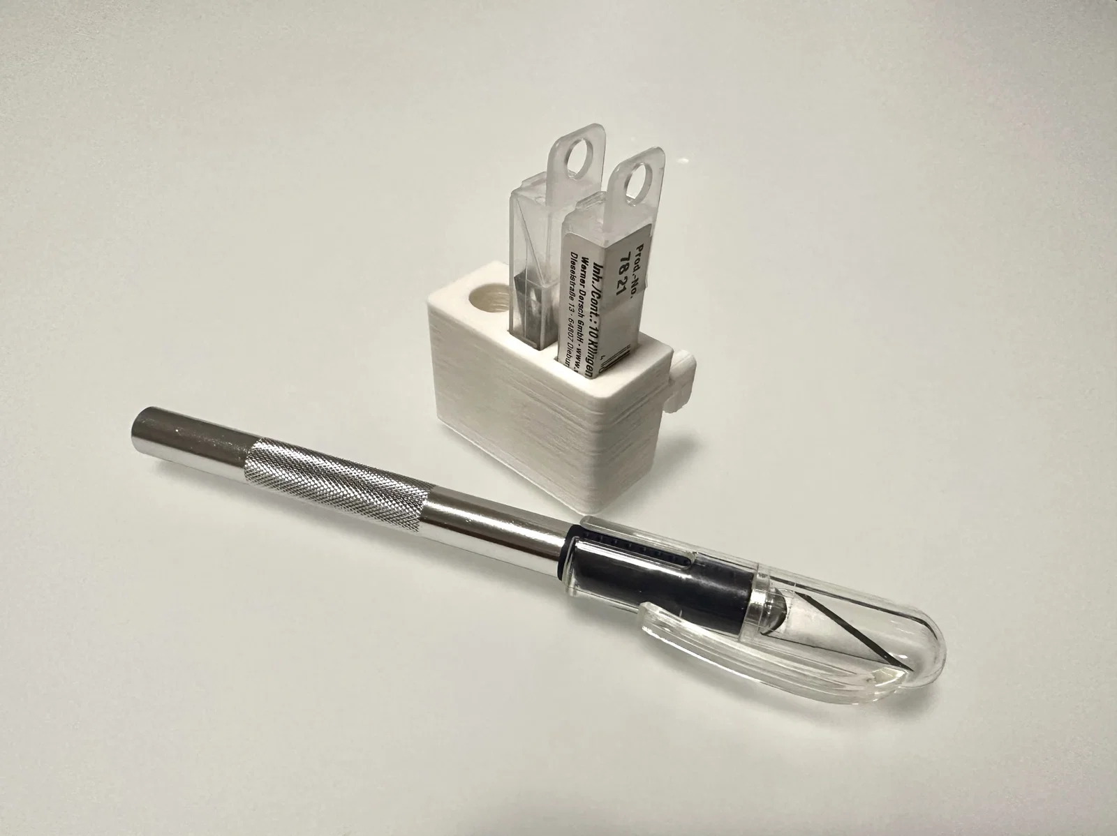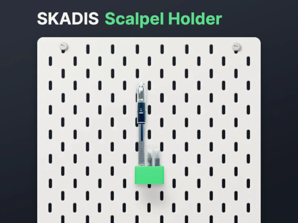 Một chiếc giá đỡ dao mổ (scalpel) đơn giản (kèm chỗ để 2 lưỡi dao dự phòng) dành cho bảng treo IKEA SKADIS. Phù hợp cho các loại dao mổ có đường kính ≤ 10mm.