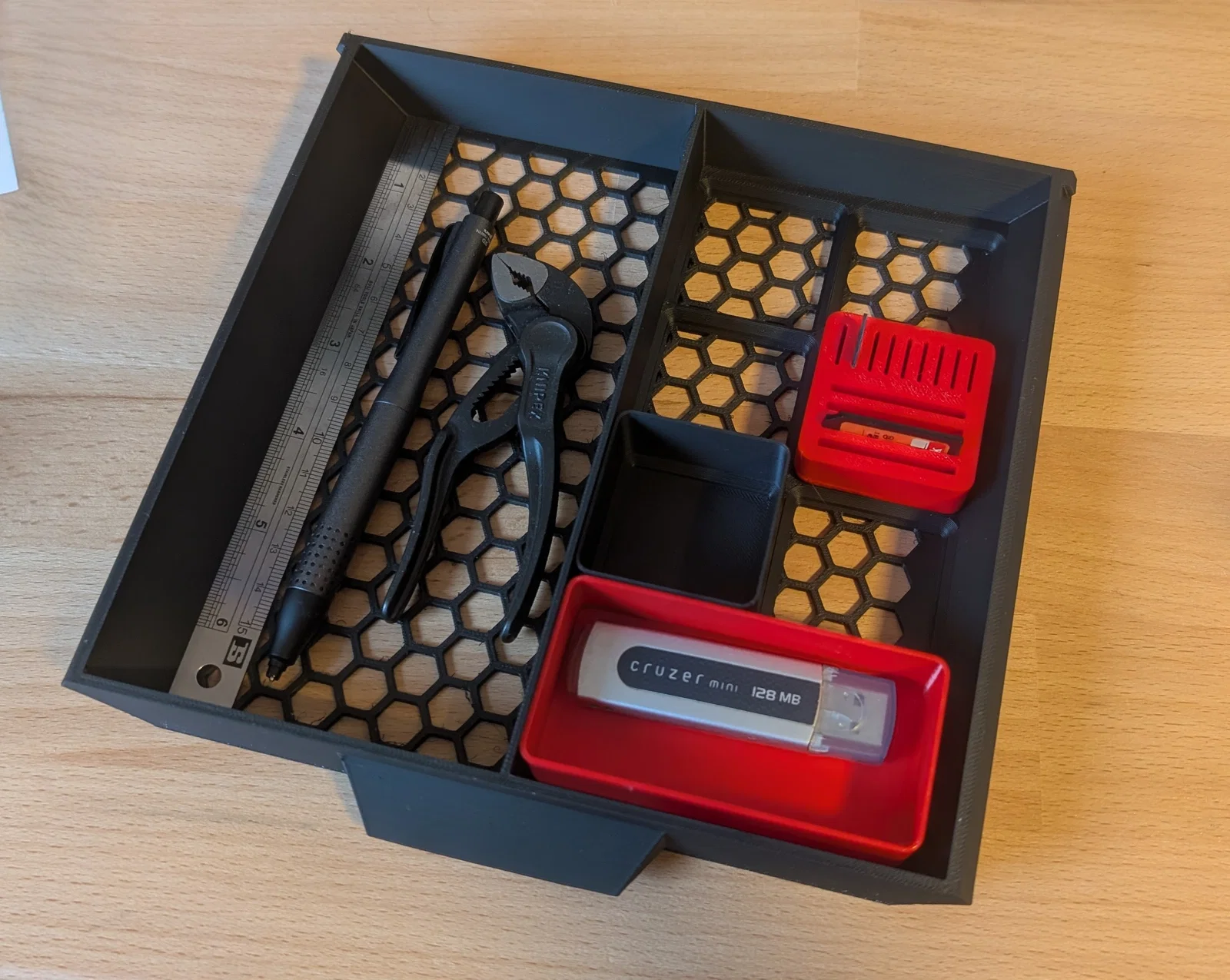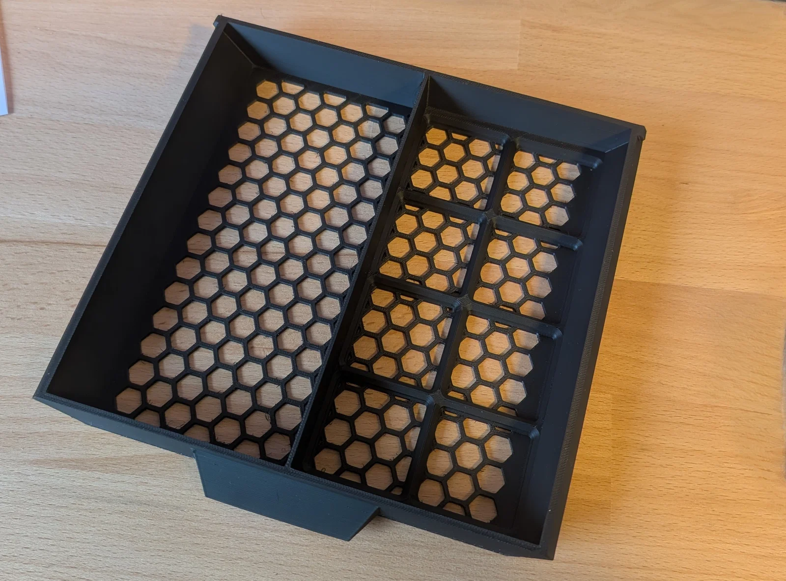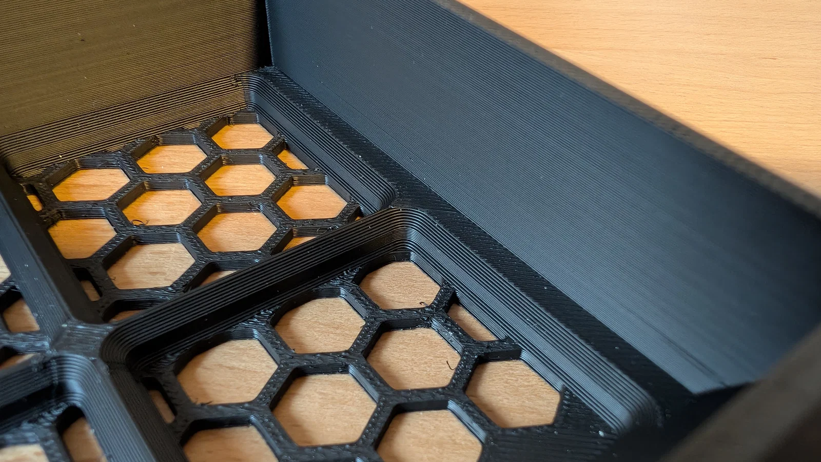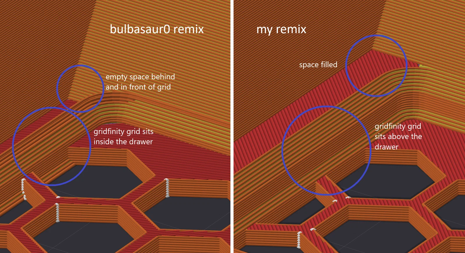 Trong bản remix của @bulbasaur0, phần lưới Gridfinity bị lấn một phần vào đáy ngăn kéo dạng lưới lục giác. Mình đã tạo một bản remix mới, trong đó phần đế Gridfinity được đặt nằm phía trên đáy ngăn kéo. Bạn có thể sử dụng thanh trượt gốc của Paul hoặc loại được @bulbasaur0 khuyên dùng.