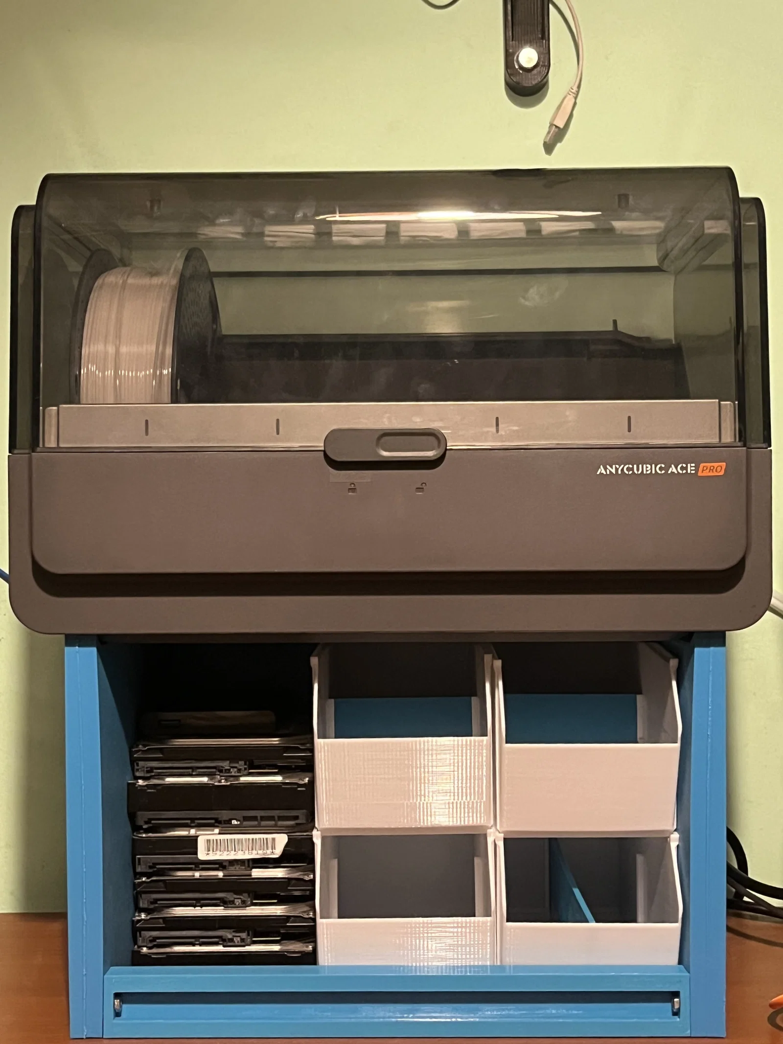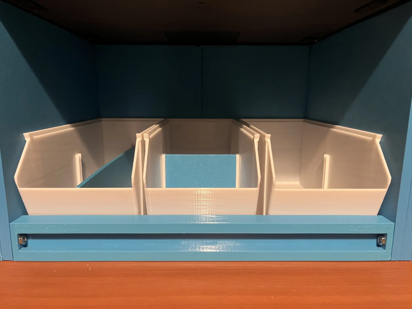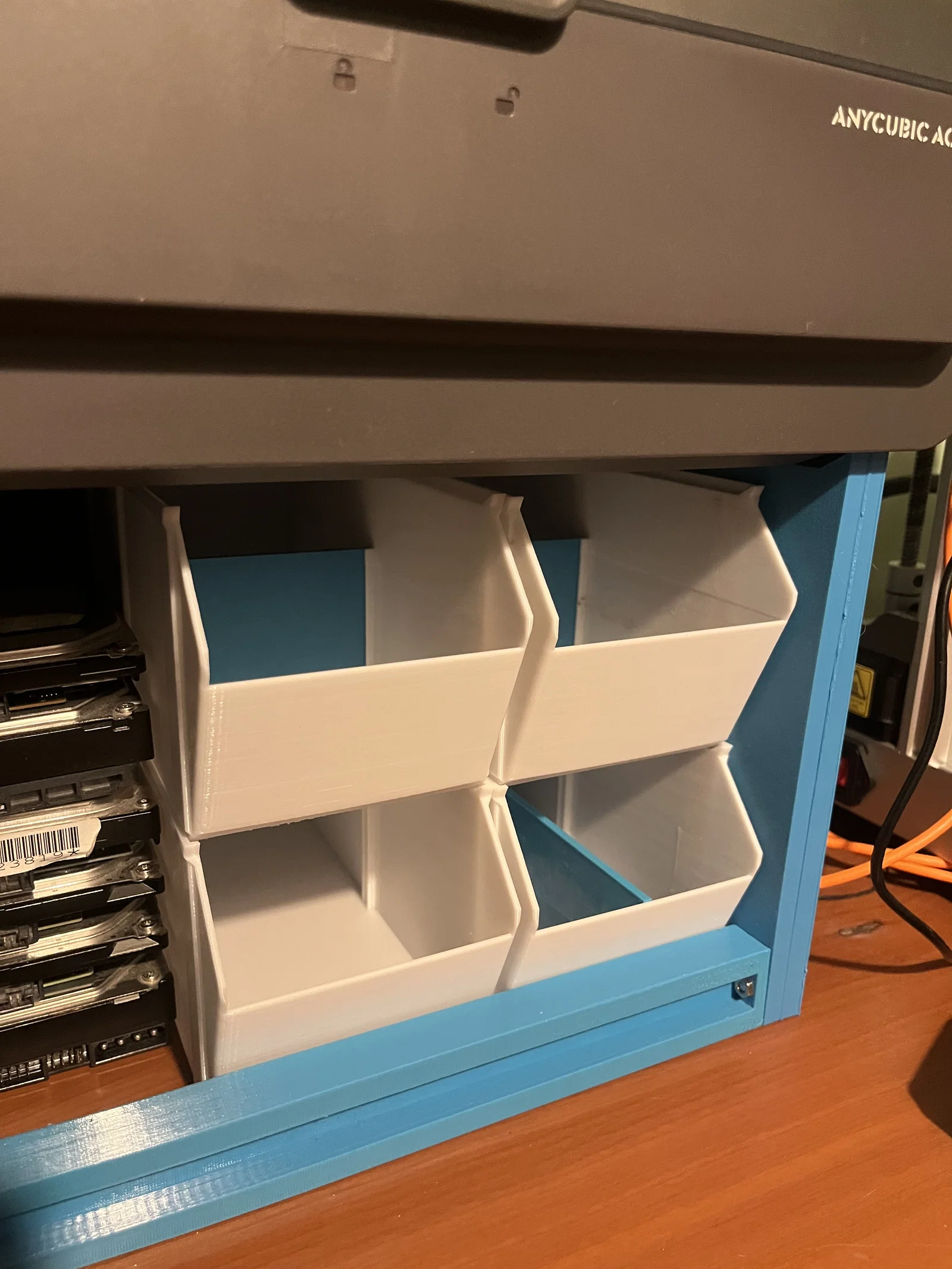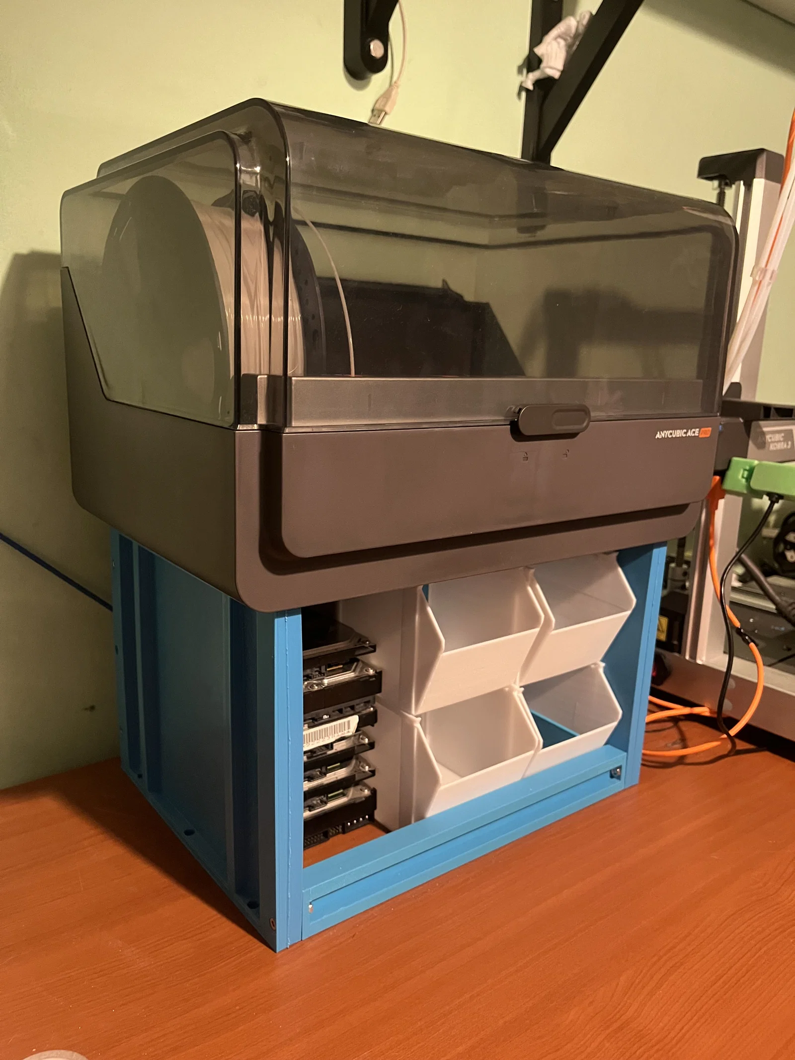 Bộ ACE được cố định chắc chắn vào các rãnh thiết kế sẵn. Kệ được chia thành nhiều phần để in và cần bắt vít lại với nhau. Bạn có thể bắt vít kệ trực tiếp xuống mặt bàn (nếu muốn, không bắt buộc). Sản phẩm bao gồm 6 hộp đựng được thiết kế riêng cho kệ này.