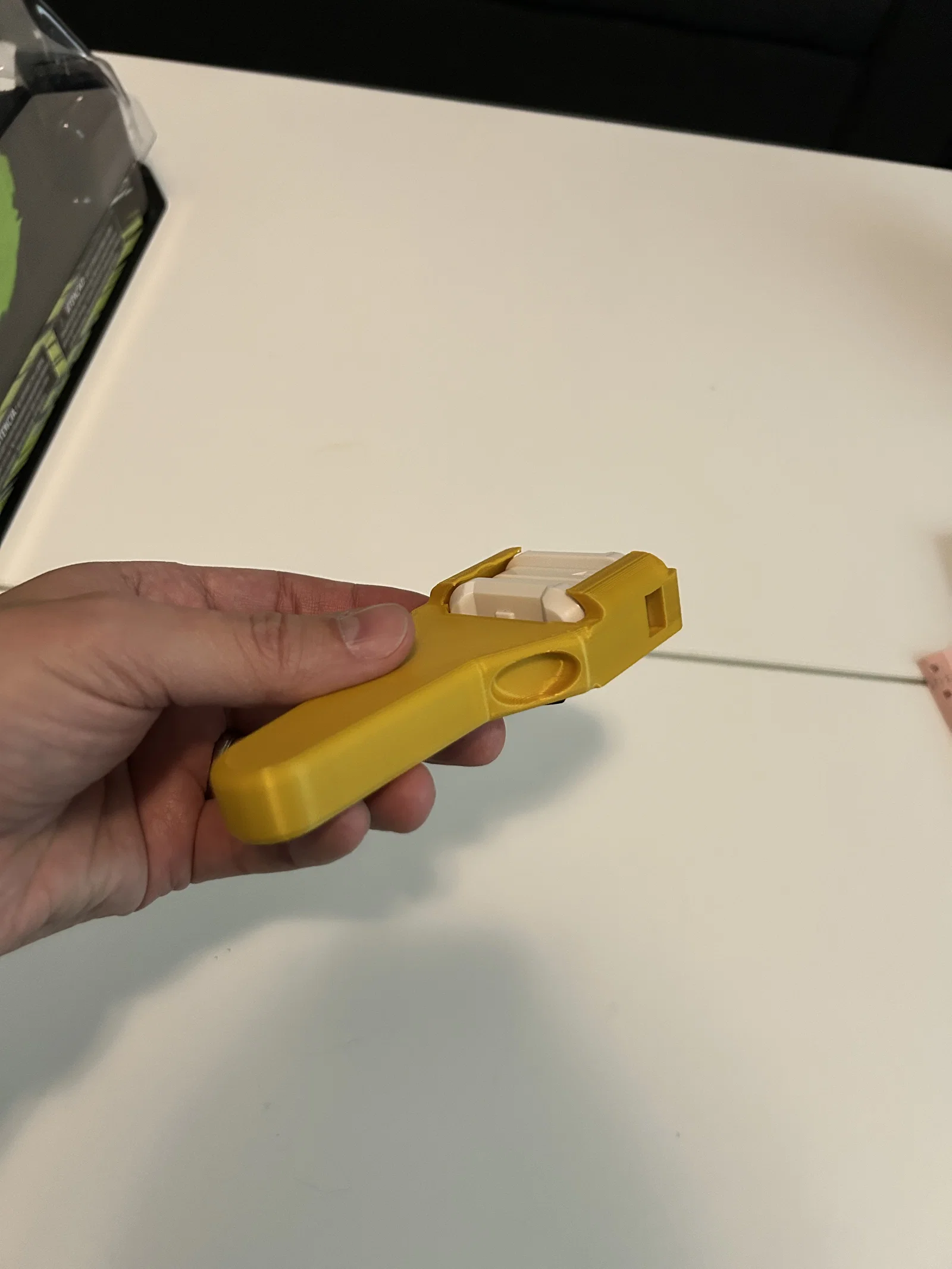 Điểm đặc biệt của thiết kế này nằm ở phần tay cầm được bo tròn, tạo cảm giác êm ái cho lòng bàn tay khi bạn thao tác cường độ cao. Ngoài ra, tác giả còn bổ sung thêm một lỗ đặt ngón cái, giúp bạn có thêm đòn bẩy và kiểm soát lực phóng tốt hơn khi tung con quay Beyblade vào sân đấu. Với kiểu dáng tối giản này, việc in ấn cũng trở nên dễ dàng và nhanh chóng hơn, đồng thời mang lại độ bền cao hơn nhờ kết cấu vững chắc.