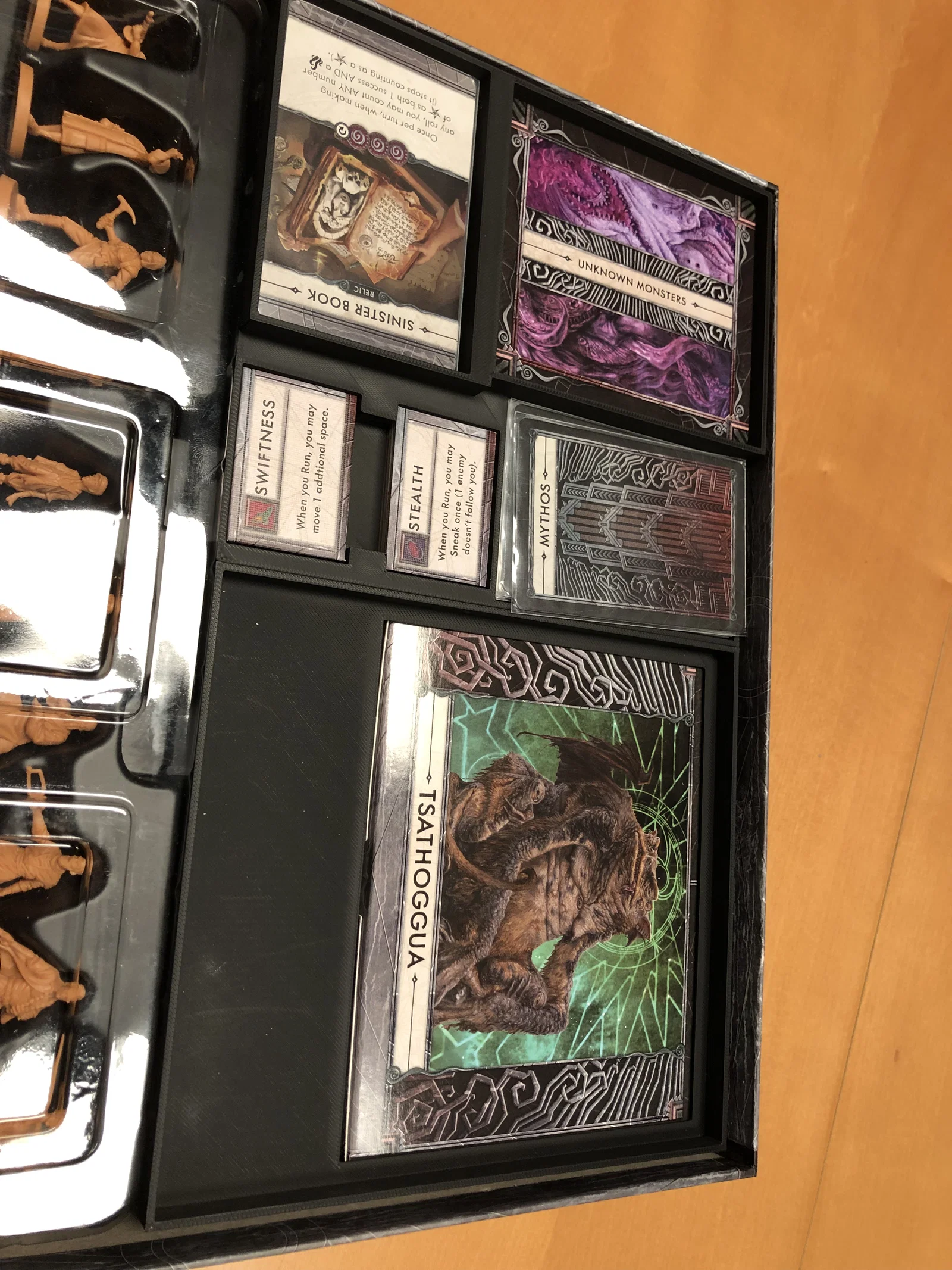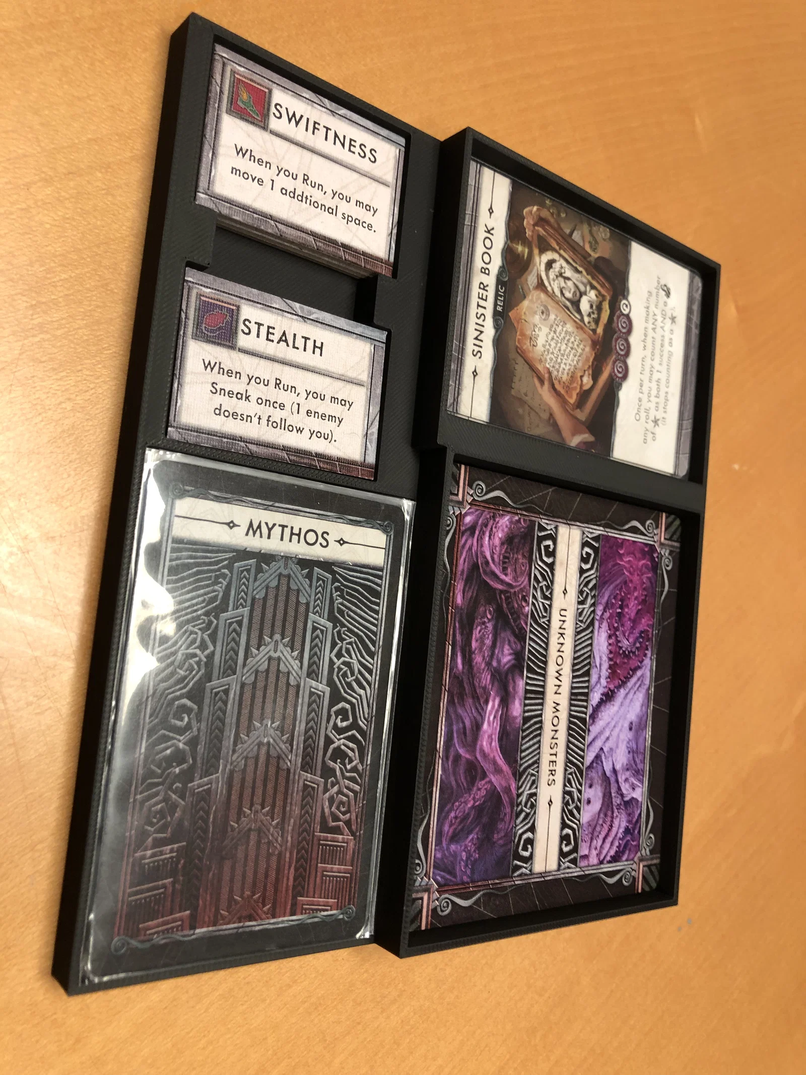 Một khay đựng (insert) vừa khít vào hộp chính của bộ Cthulhu: Death May Die - Fear of the Unknown, giúp sắp xếp gọn gàng tất cả thẻ bài và token. Bên trong vẫn còn dư một chút không gian cho các thẻ bài mở rộng. Khay được thiết kế vừa vặn cho các thẻ relics, insanities và mythos đã bọc sleeve (tôi đang dùng loại Docsmagic standard).