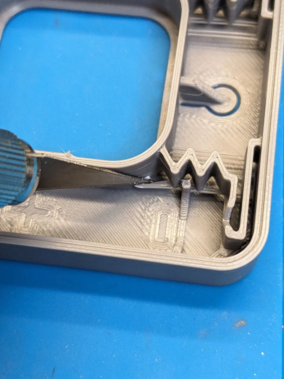 Phần vỏ này giúp chứa cảm biến và hai viên pin AAA bên trong. Thiết kế có các lò xo nhựa để tạo áp lực lên các điểm tiếp xúc pin, nhưng bạn cần in hỗ trợ (supports) và loại bỏ chúng sau khi in.