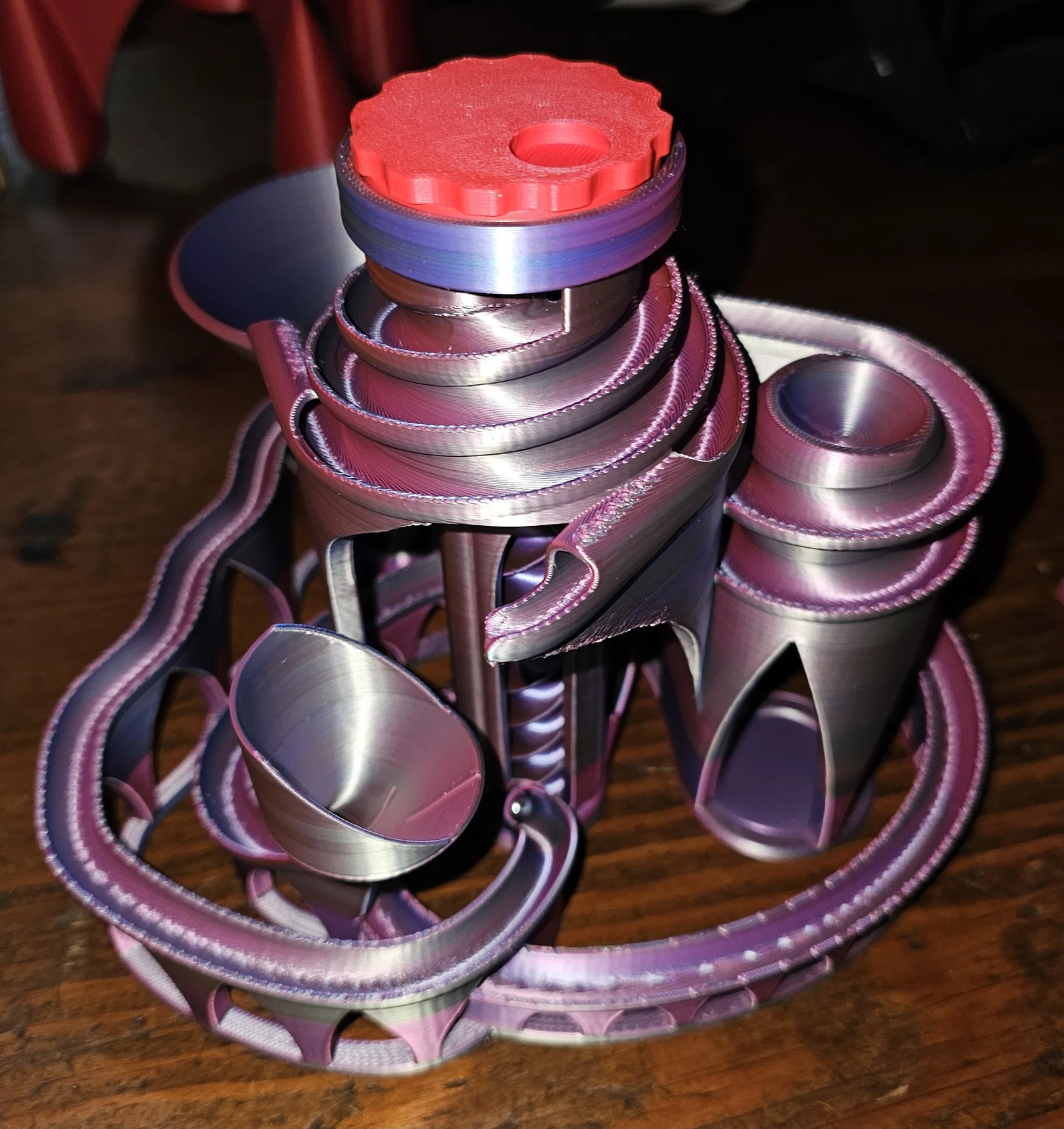 Điểm cải tiến đáng giá nhất ở phiên bản này chính là phần thành chắn (extra wall) bao quanh các đường ray. Nhờ chi tiết này mà các viên bi kim loại sẽ nằm gọn trong lộ trình, hạn chế tối đa tình trạng bi bị văng ra ngoài khi chạy với tốc độ cao. Đây là một món đồ chơi in 3D vừa mang tính kỹ thuật, vừa là vật trang trí đầy màu sắc và bắt mắt trên kệ sách hay góc học tập của bạn.