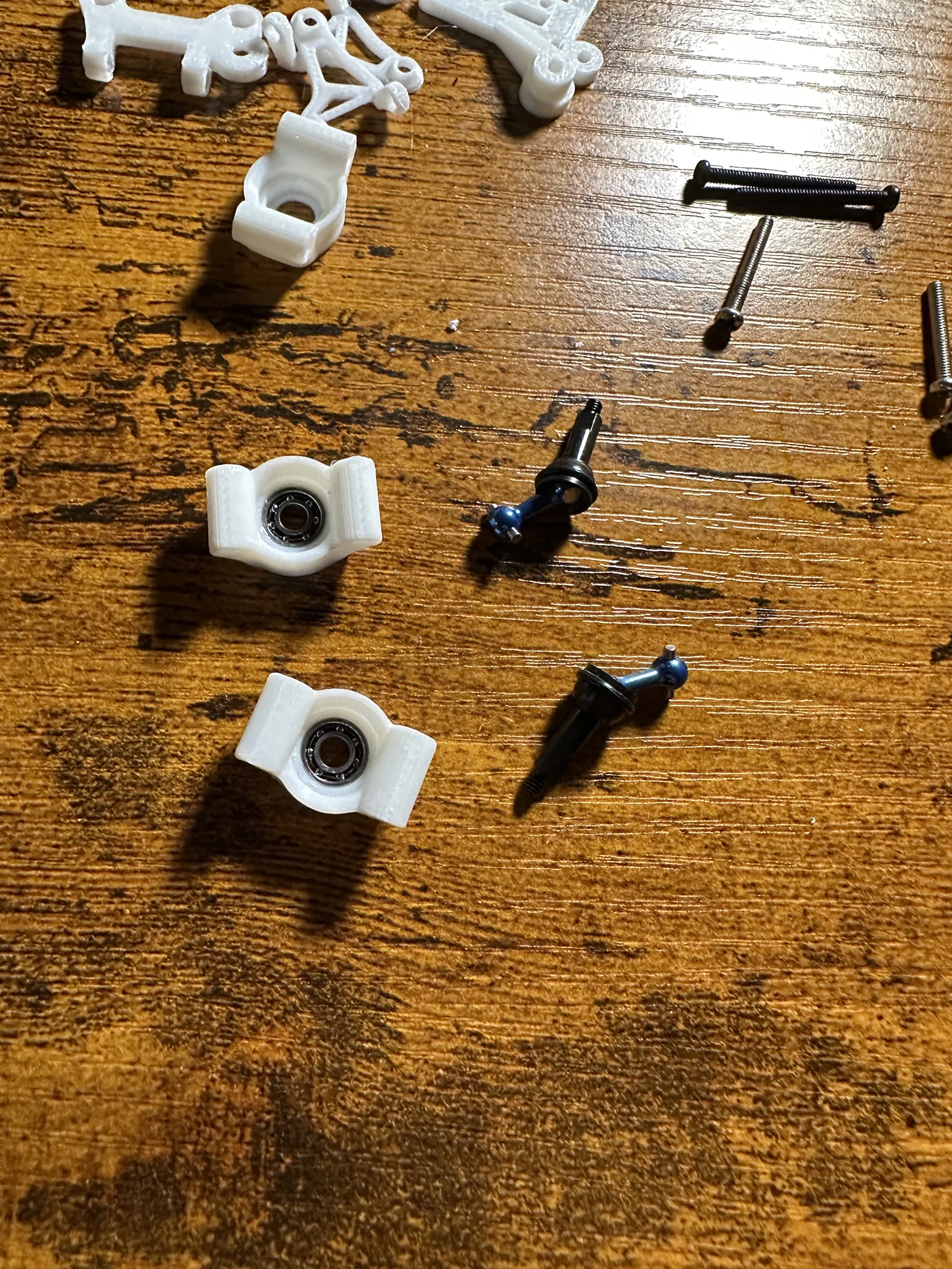 Ốc vít: 12 x [ốc M2, 5mm] 4 x [ốc M2 đầu bằng (counter sunk), 4mm] 4 x [ốc M2, 10mm] 4 x [ốc M2, 14mm] 4 x [ốc M2, 20mm] 4 x [ốc M2, 8-14mm], để gắn thanh dẫn lò xo, tùy nhu cầu của anh em. 7 x [ốc M2, độ dài <=5mm], để gắn giá đỡ thân xe trước và sau.