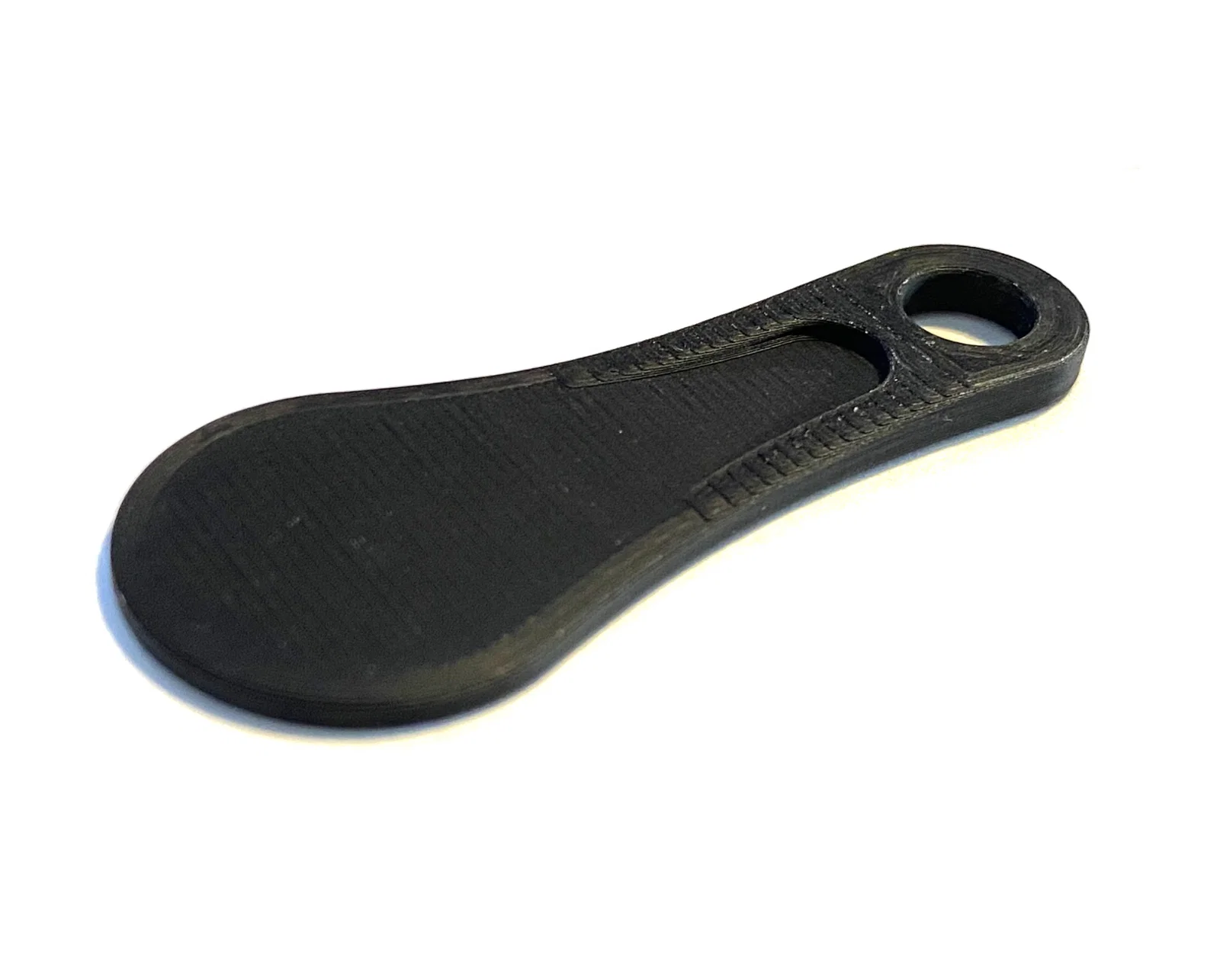 Sản phẩm này được thiết kế với hình dáng thuôn dài, tích hợp thêm phần tay cầm giúp bạn dễ dàng thao tác cầm nắm cũng như móc vào chùm chìa khóa cá nhân. Một điểm cộng lớn trong thiết kế của phiên bản này chính là cấu trúc được làm dày hơn ở phần xung quanh lỗ xỏ, giúp tăng cường độ cứng cáp đáng kể. Nhờ vậy, món đồ này hạn chế tối đa tình trạng bị cong, gãy hay biến dạng trong quá trình sử dụng thường xuyên tại các khe cắm khóa xe đẩy vốn khá cứng và yêu cầu lực nhất định.