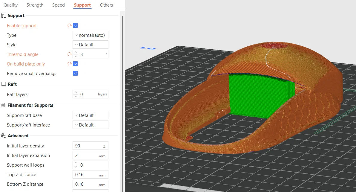 - Hỗ trợ (support): Dùng Normal auto support với góc 8 độ chỉ trên bàn in (phần mặt dưới vẫn bị nhô ra một chút nhưng mình thấy không ảnh hưởng gì, xem ảnh đính kèm).