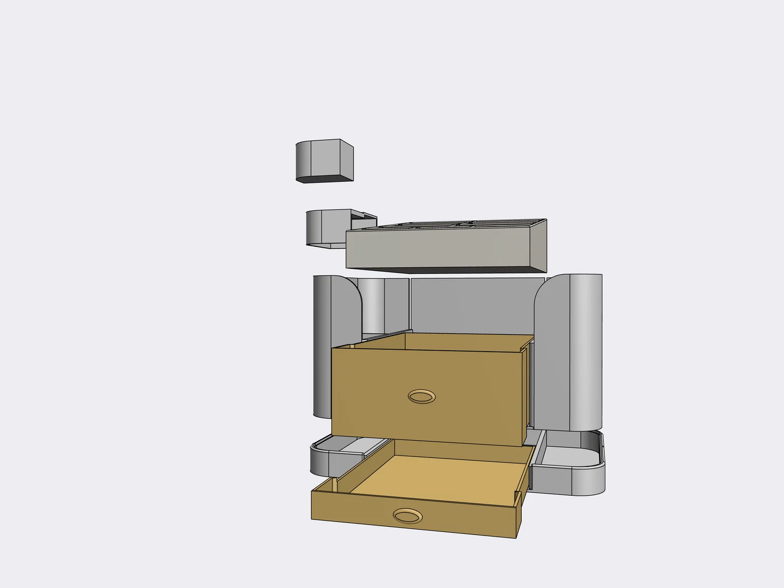 Bạn có thể in mẫu này với tùy chọn hai hoặc ba ngăn kéo tùy ý. Để lắp phần tay cầm, mình dùng ốc vít M3 x 8 mm, giống loại này nhé: https://amzn.to/4aDQMR. Cảm hứng thiết kế từ: và