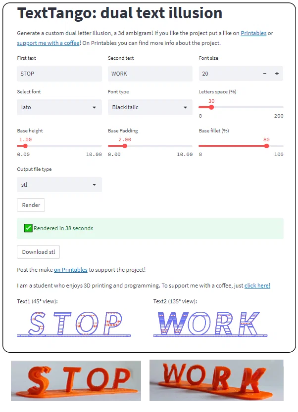 Tạo các mẫu ảo ảnh chữ kép độc đáo từ văn bản với TextTango. Bạn có thể sử dụng ứng dụng Web hoặc chạy tập lệnh Python để tạo các khối chữ 3D ấn tượng. Hỗ trợ tùy chỉnh phông chữ đa dạng và xuất tệp STEP dễ dàng.