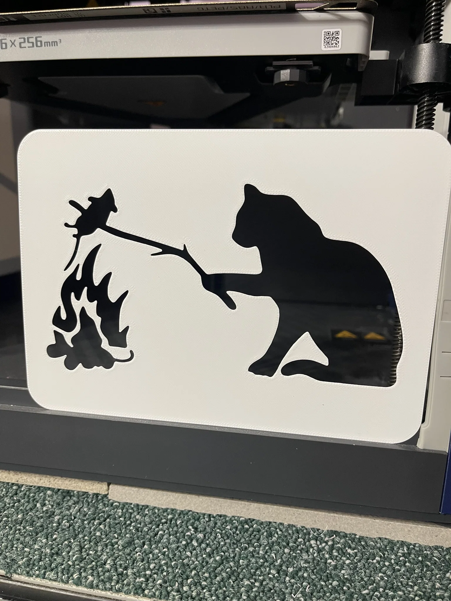 Chiều cao lớp in 0,2 mm. Đây là khuôn nhựa (stencil) dùng cho trang trí tường DIY, làm sổ lưu niệm (scrapbooking), dập nổi (embossing) và làm thiệp - Dụng cụ nghệ thuật stencil. Mèo nướng chuột - Khuôn stencil. Bạn có thể dễ dàng dùng bút, giấy hoặc con lăn sơn để vẽ hình lên áo thun, tường hoặc bất kỳ bề mặt nào khác. Kích thước của khuôn là 175x125mm. Nhờ kích thước này, nó có thể in được trên các máy in có khổ in nhỏ. Độ dày của khuôn là 0,4 mm (2 lớp 0,2 mm), có thể thay đổi kích thước, giữ nguyên độ dày Z từ 0,4-0,6mm. Có sẵn file để tải về gồm 1x STL, 3MF cho máy in Bambulab (Bambu Studio), cũng như cho Anycubic Kobra 3 (Anycubic Slicer Next). File cũng có thể mở trong Orca Slicer.