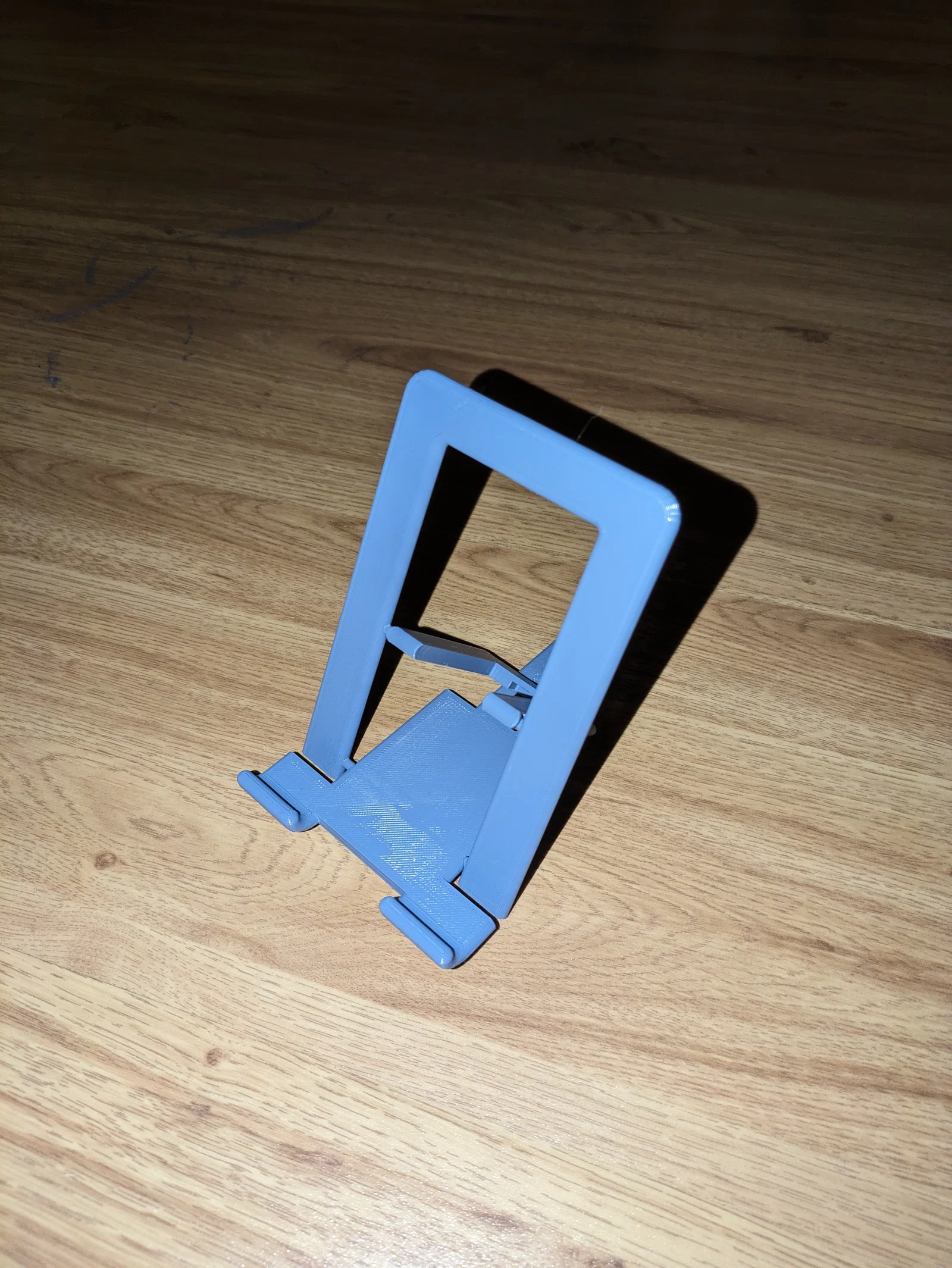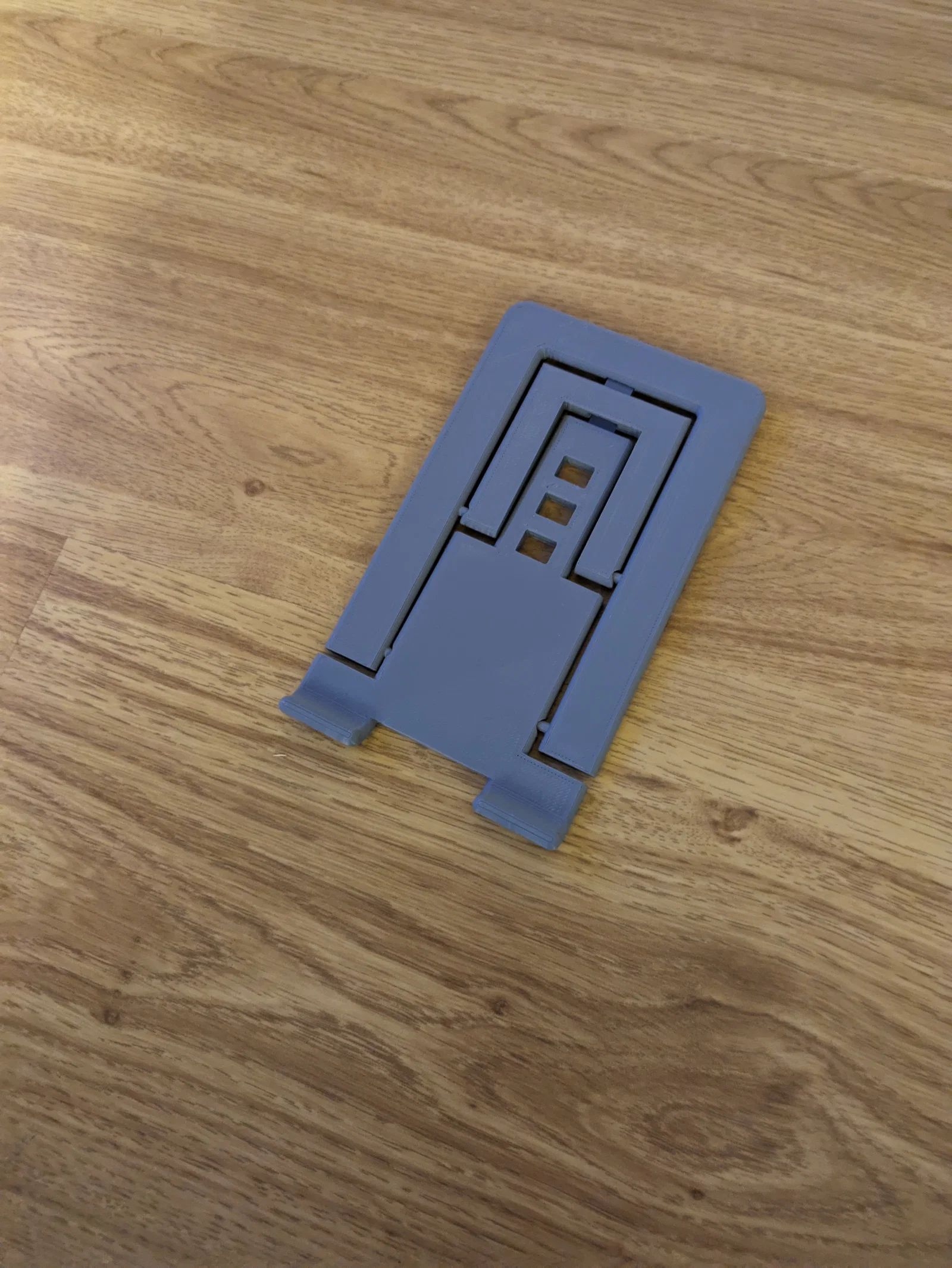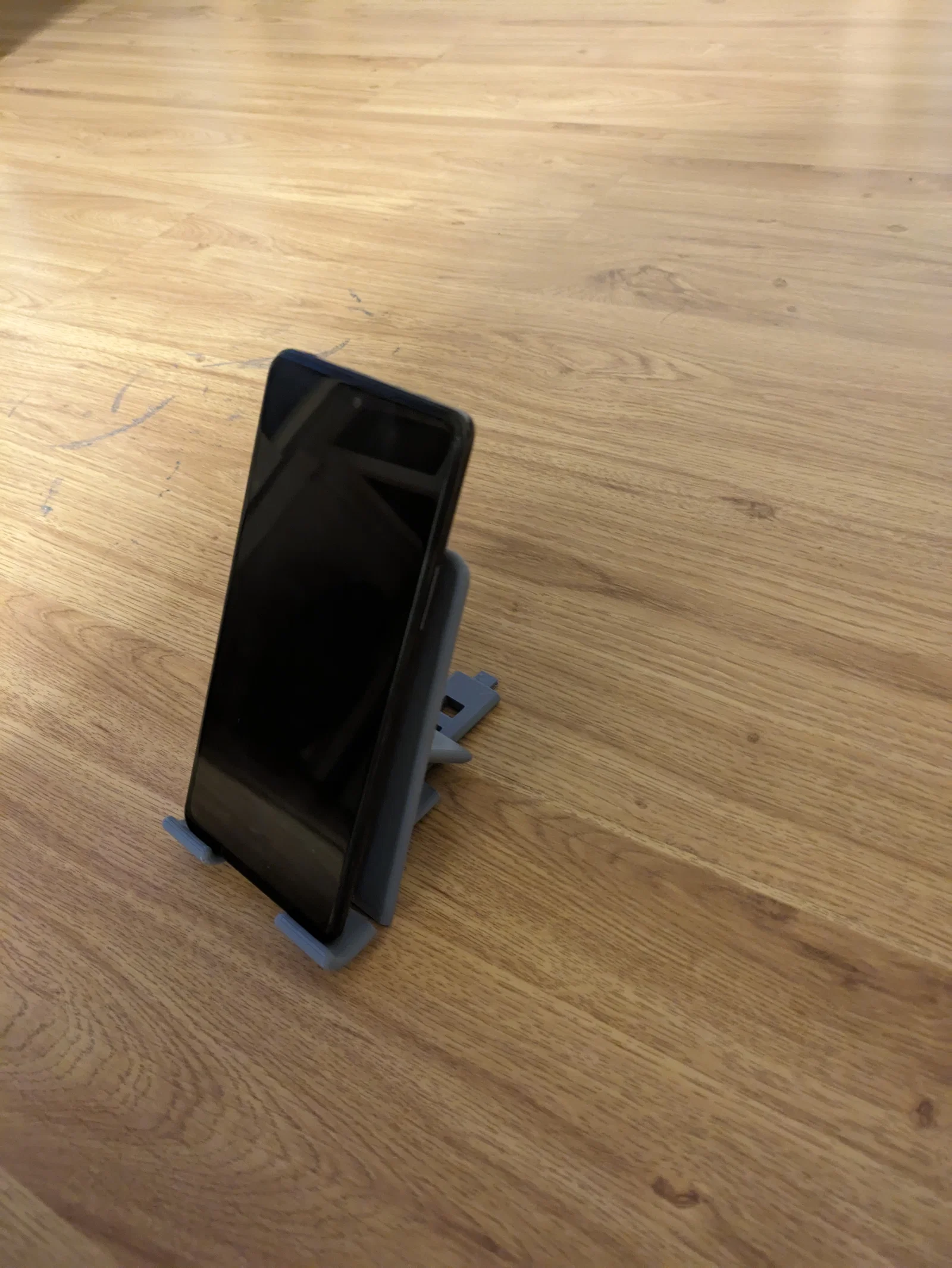 Một chiếc giá đỡ điện thoại/máy tính bảng có thể gấp gọn. Thiết kế này vừa vặn bỏ túi cùng với điện thoại của bạn, rất tiện lợi khi dùng để xem phim trên tàu hoặc xe. Mình cũng thường xuyên dùng nó cho máy tính bảng nữa. Các ví dụ trên hình được in bằng chất liệu PETG với độ dày (infill) 50%.
