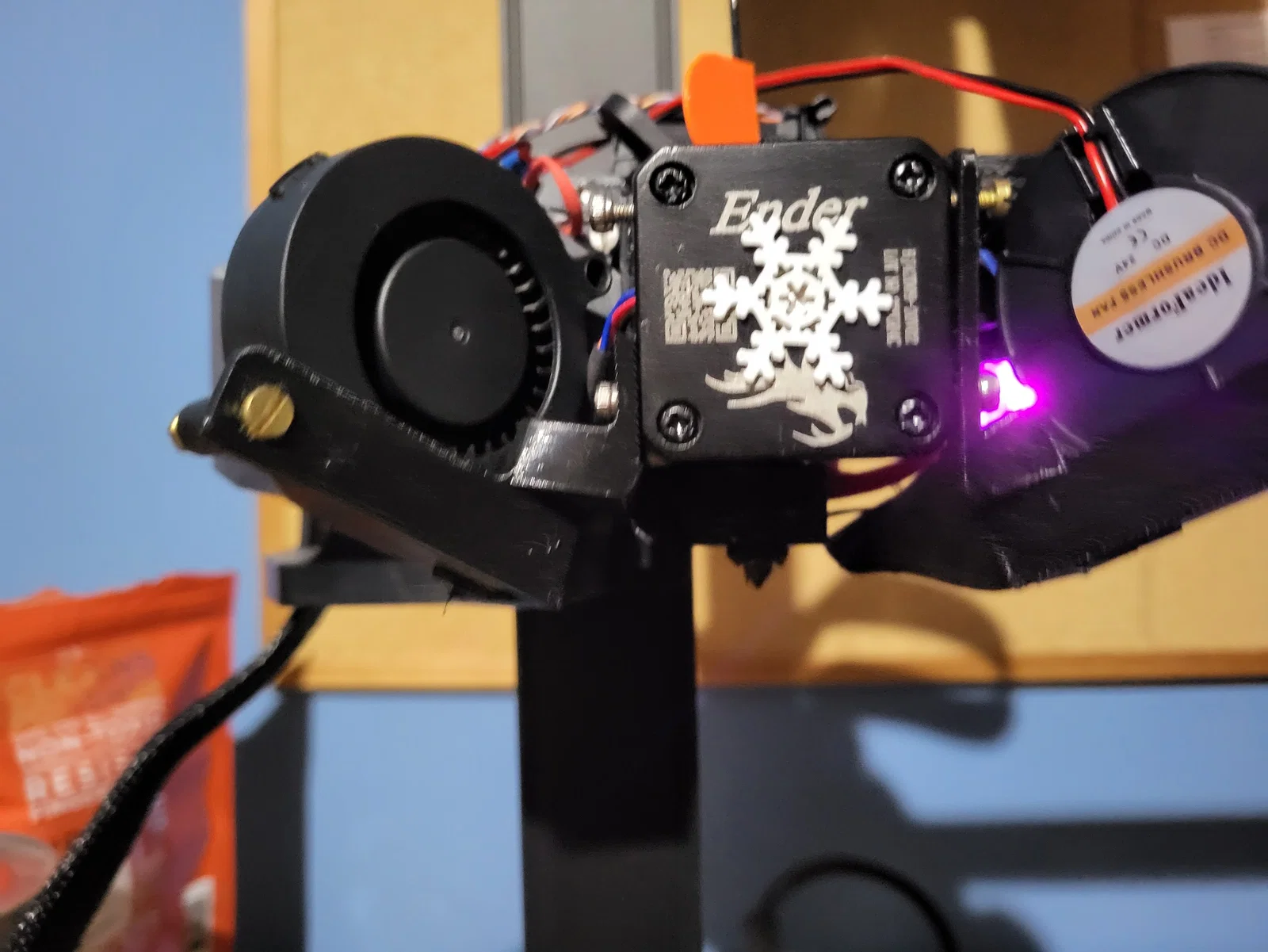 Chào mọi người, cách đây nửa năm mình có thiết kế ống dẫn quạt đầu tiên giúp nhìn rõ đầu phun. Hôm nay mình xin giới thiệu bản thiết kế mới nhất và ưng ý nhất. Mình dùng hai quạt 5015 để tăng công suất làm mát. Mỗi quạt được gắn từ bên hông để phía trước không bị chắn, giúp quan sát lớp in đầu tiên cực kỳ dễ dàng.