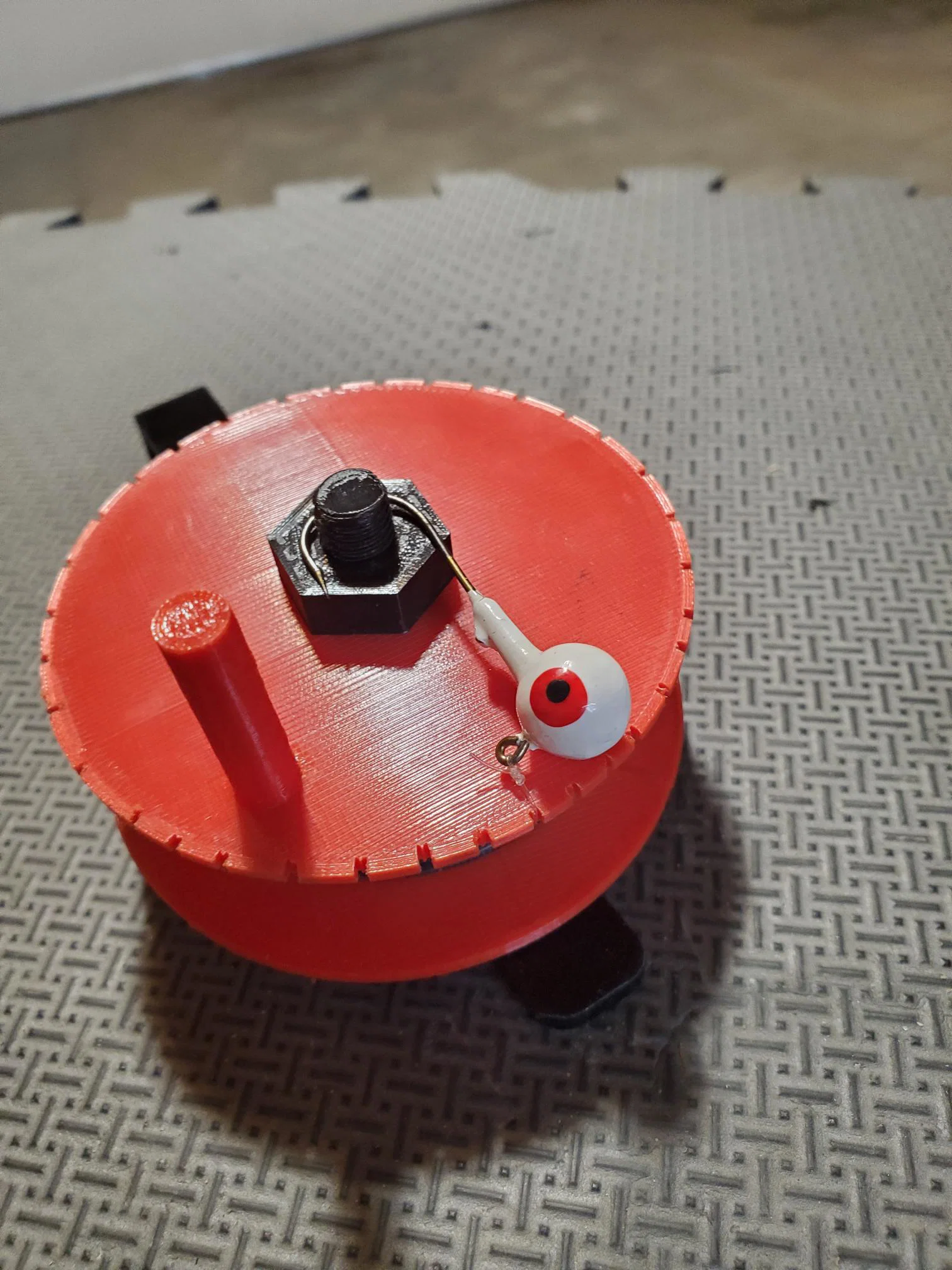 Đây là thiết bị rattle reel dùng cho câu cá trên băng, nó sẽ phát ra tiếng kêu rộp rộp để báo hiệu khi có cá cắn câu. Cách sử dụng rất đơn giản: chỉ cần bỏ khoảng 10-15 viên bi thép cỡ 2-3mm vào đế, sau đó dán phần nắp lại là xong.