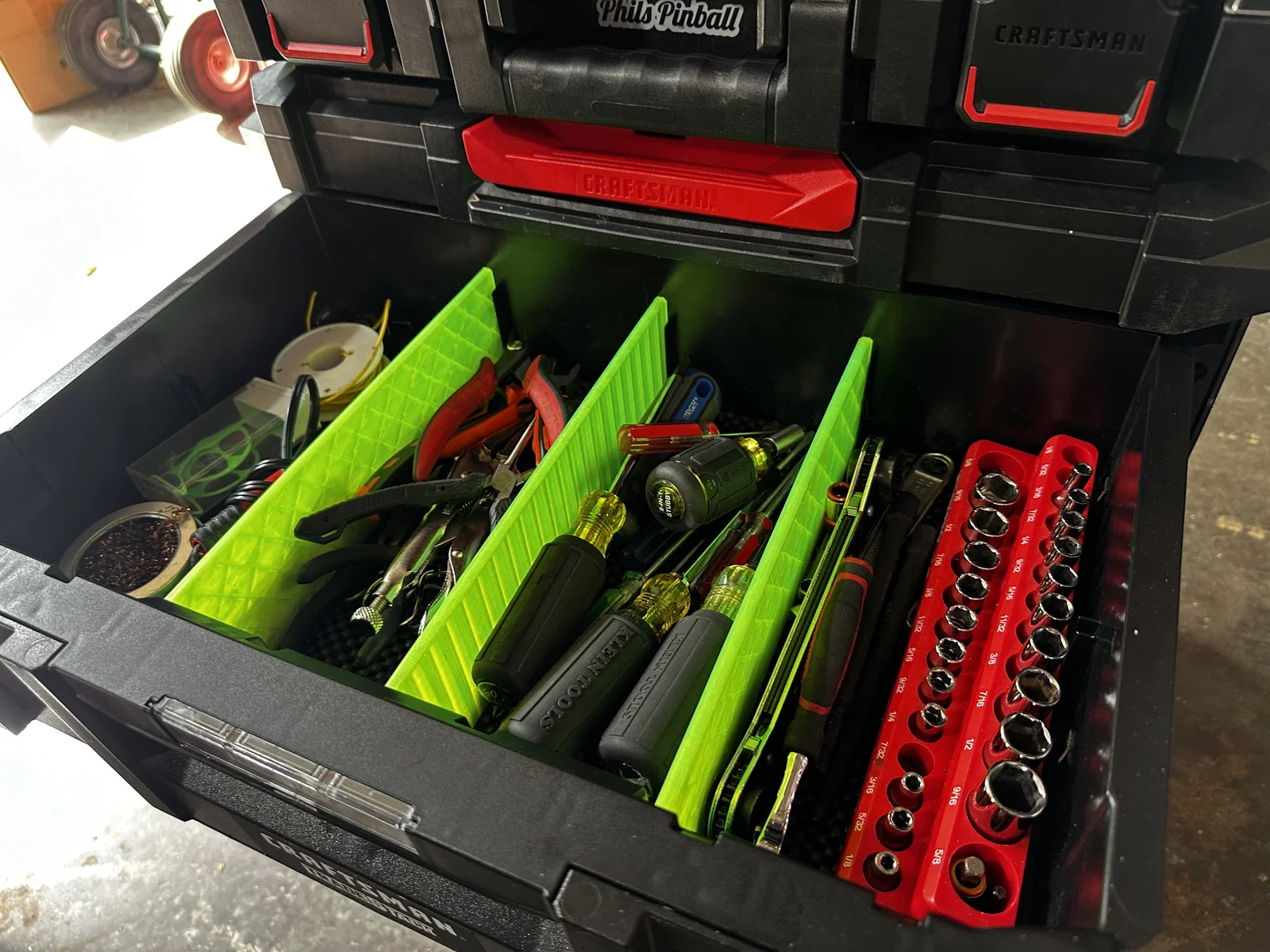 Bộ vách ngăn tùy chỉnh dành cho ngăn kéo Craftsman TradeStack (mã CMST21404). Thiết kế tối ưu, dễ in, giúp sắp xếp dụng cụ gọn gàng. Khuyên dùng nhựa PETG thay vì PLA để đảm bảo độ bền trước nhiệt độ cao.