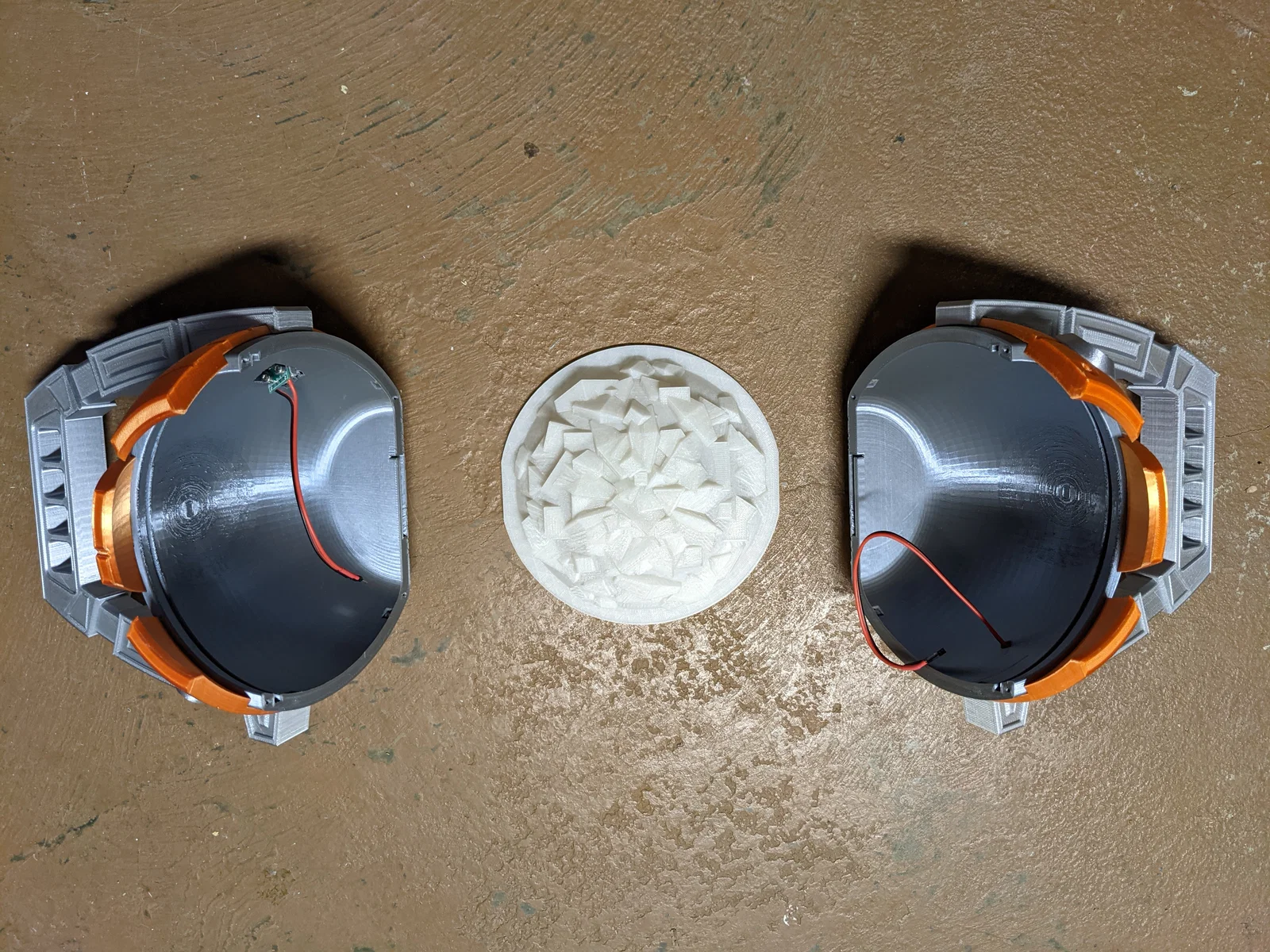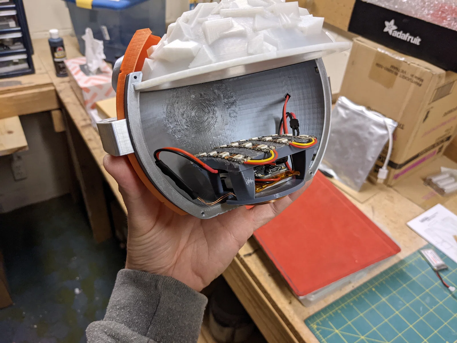 Mình tạo ra mô hình này với không gian rộng rãi để gắn các linh kiện điện tử, đồng thời tích hợp hai tính năng giúp việc bật/tắt và sạc ngoài trở nên dễ dàng hơn. Phần tay cầm bên trái có khoang chứa và ống dẫn dây bên trong, tiện để lắp công tắc gạt mà anh em có thể thao tác dễ dàng bằng ngón cái. Phần dưới bên trái còn có chỗ để gắn cổng USB, giúp sạc pin cho linh kiện điện tử bên trong. Cách đơn giản nhất là dùng đèn pin cầm tay giá rẻ từ Harbor Freight, nối dây với công tắc ngoài và lót thêm nhựa hoặc tấm phim màu xanh để đổi màu ánh sáng. Các "bộ phận in tùy chọn" liệt kê bên dưới là dành cho thiết lập phức tạp hơn của mình: chứa một ma trận 4x4 đèn NeoPixels (LED Top) kết nối với Digispark và mạch sạc/tăng áp LiPo cùng đế sạc cảm ứng không dây (được đặt trong phần LED Supports).