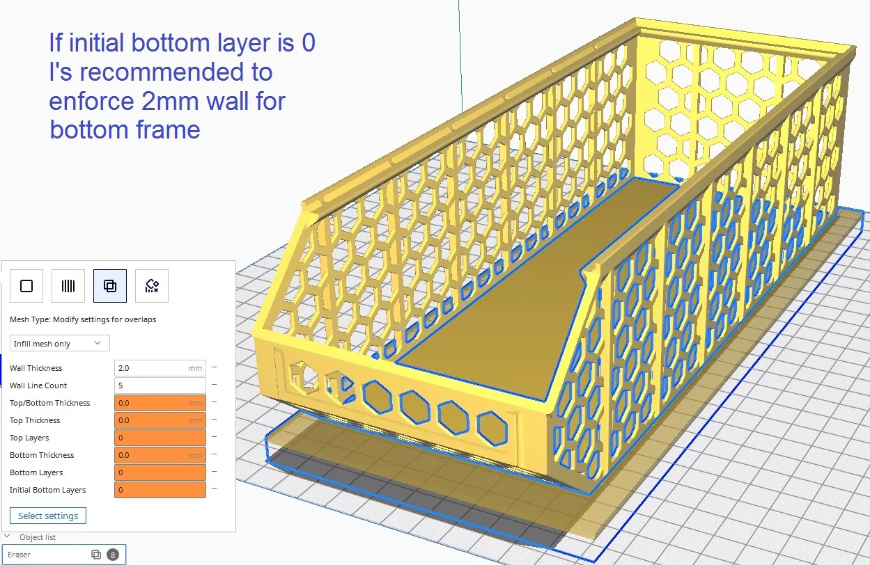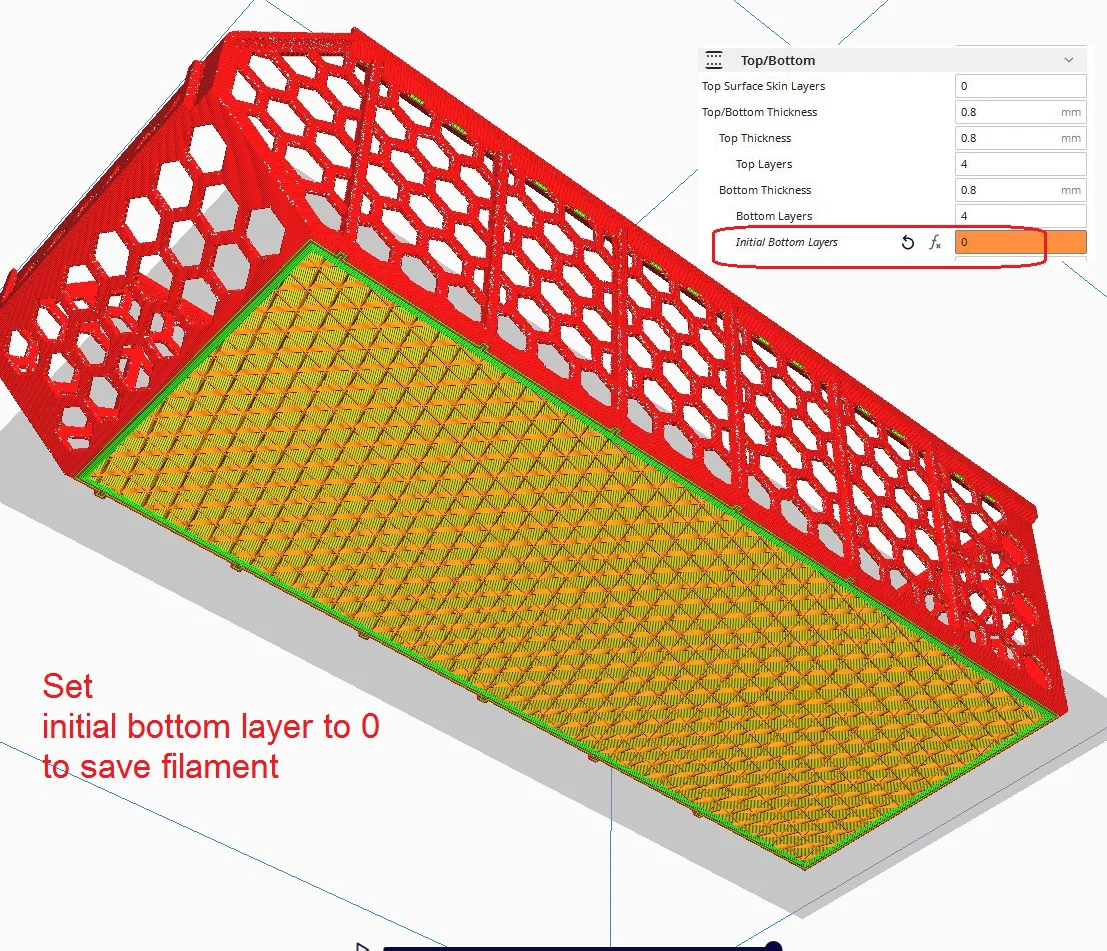 Mẹo cho Biến thể B (xem ảnh): Phần đáy có thể in không cần lớp đáy (bottom layer) và chỉ để 2 lớp trên cùng để tiết kiệm nhựa và thời gian (lúc này biến thể B tốn ít nhựa hơn cả bản "tổ ong toàn phần"). Để làm được điều này trong Cura, hãy đặt "initial bottom layers" bằng 0 (!). Tuy nhiên, hãy đảm bảo khung đáy vẫn ổn định bằng cách tạo một khối modifier xung quanh đáy và thiết lập độ dày tường (wall thickness) là 2mm (chỉ dành cho đáy). Infill mặc định 20% (Cubic) là đủ dùng.