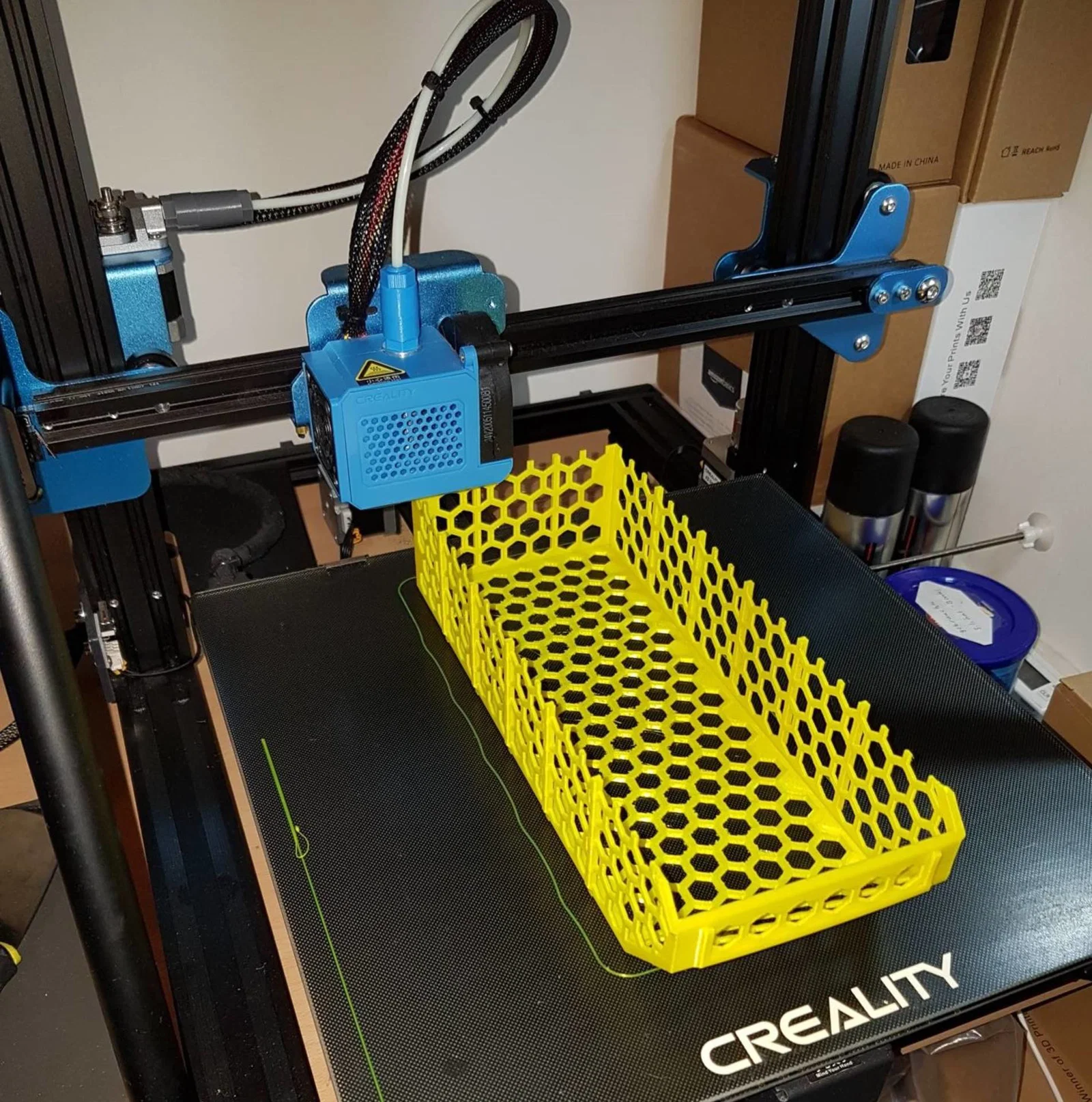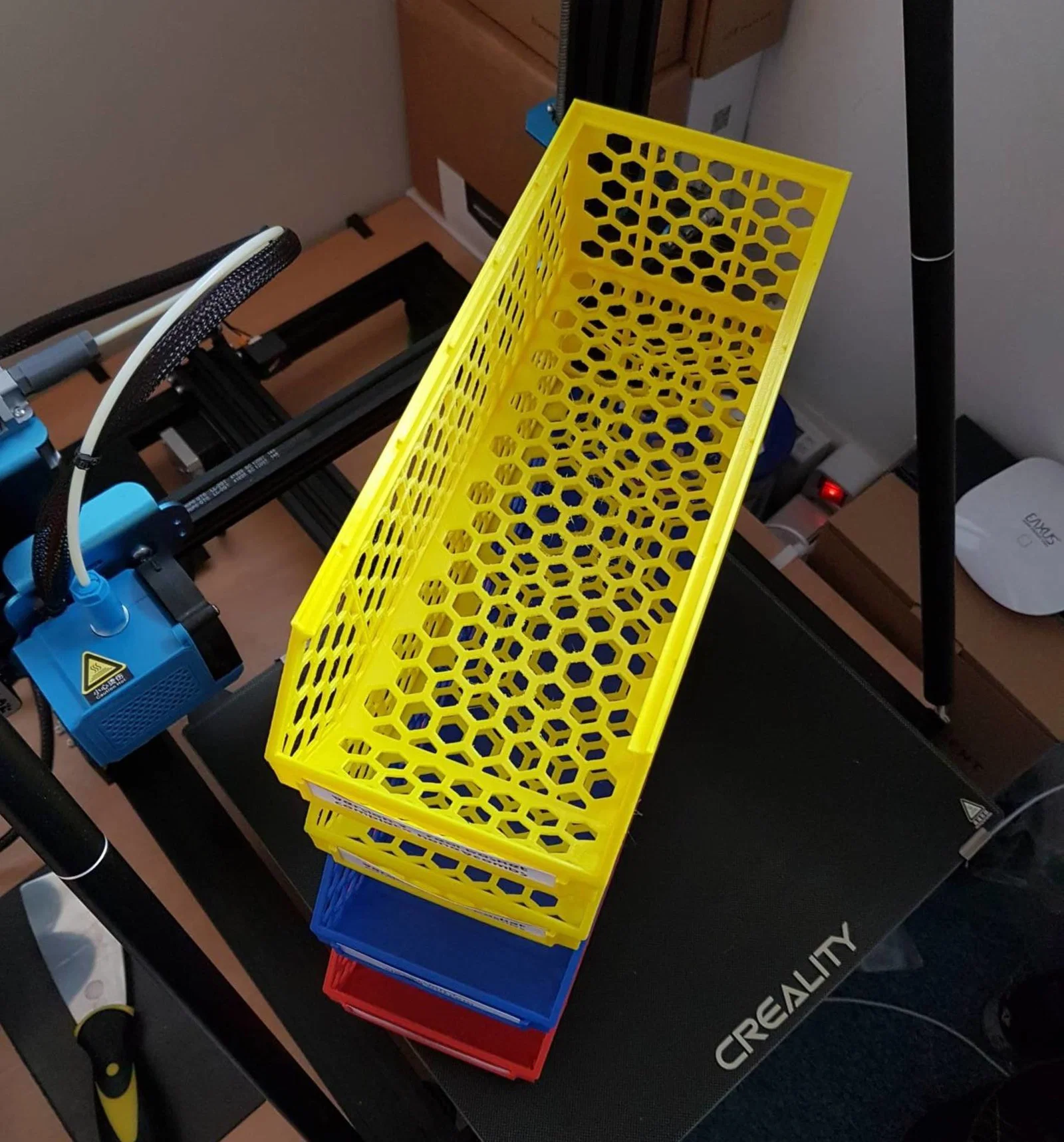 Thiết kế dạng tổ ong (honeycomb) giúp tiết kiệm đáng kể lượng nhựa in so với các loại hộp kín mà vẫn đảm bảo độ chắc chắn. Giỏ có hai kiểu: "tổ ong toàn phần" hoặc "đáy kín" (biến thể B), rất hữu ích nếu bạn muốn lưu trữ các linh kiện nhỏ. Nếu bạn biết cách tinh chỉnh trong Slicer, biến thể B thậm chí còn không tốn thêm nhựa, xem hướng dẫn bên dưới.