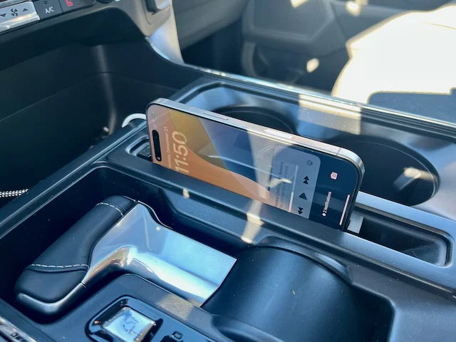 Chiếc F150 Lightning của mình không được trang bị sẵn đế sạc không dây, nên mình đã tự thiết kế một giải pháp tận dụng ngay vị trí khay để bút nằm giữa cần số và hộc để ly để sạc cho chiếc iPhone của mình (mình dùng máy trần không ốp).