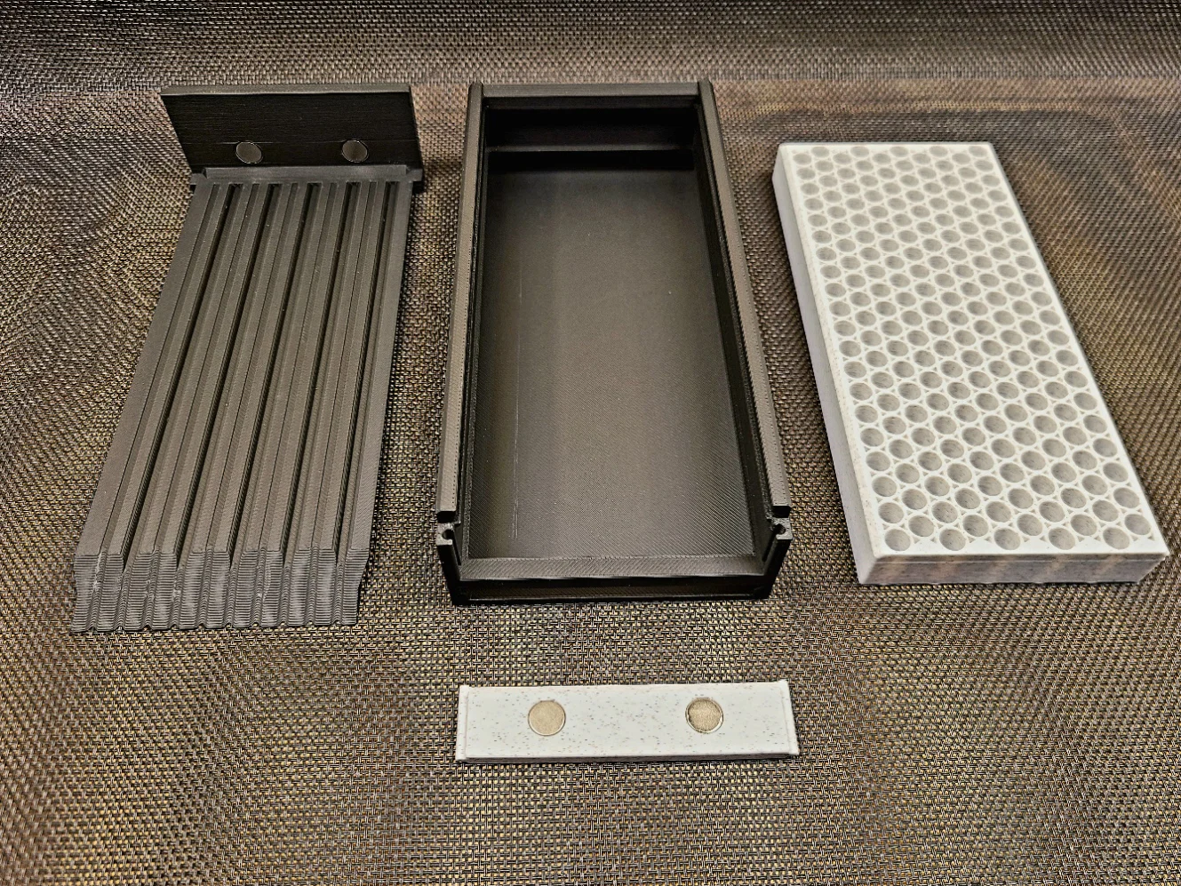 - Giữ nắp bằng nam châm: Nắp hộp được thiết kế để cố định bằng bốn viên nam châm 2x8mm lắp sau khi in.