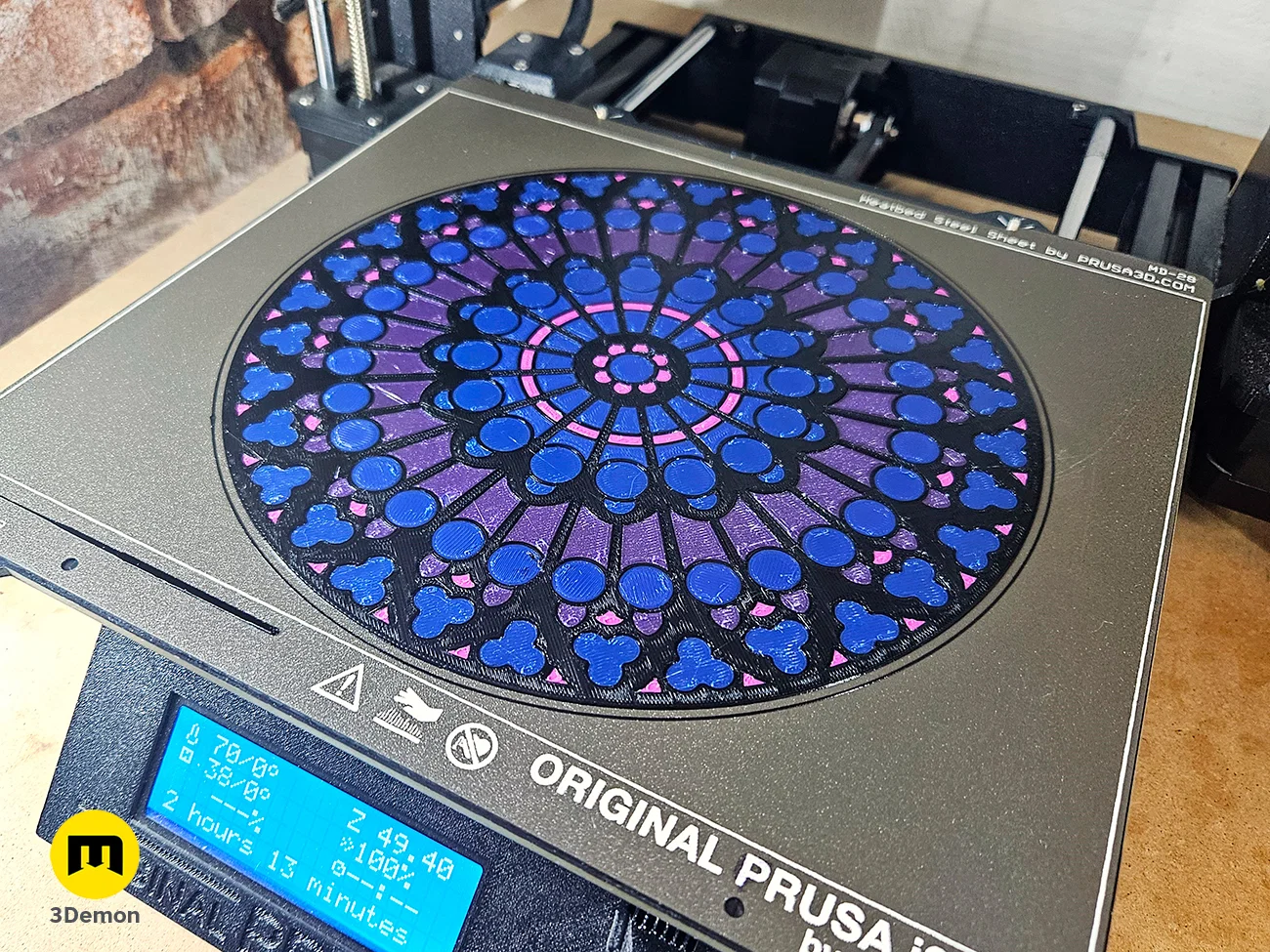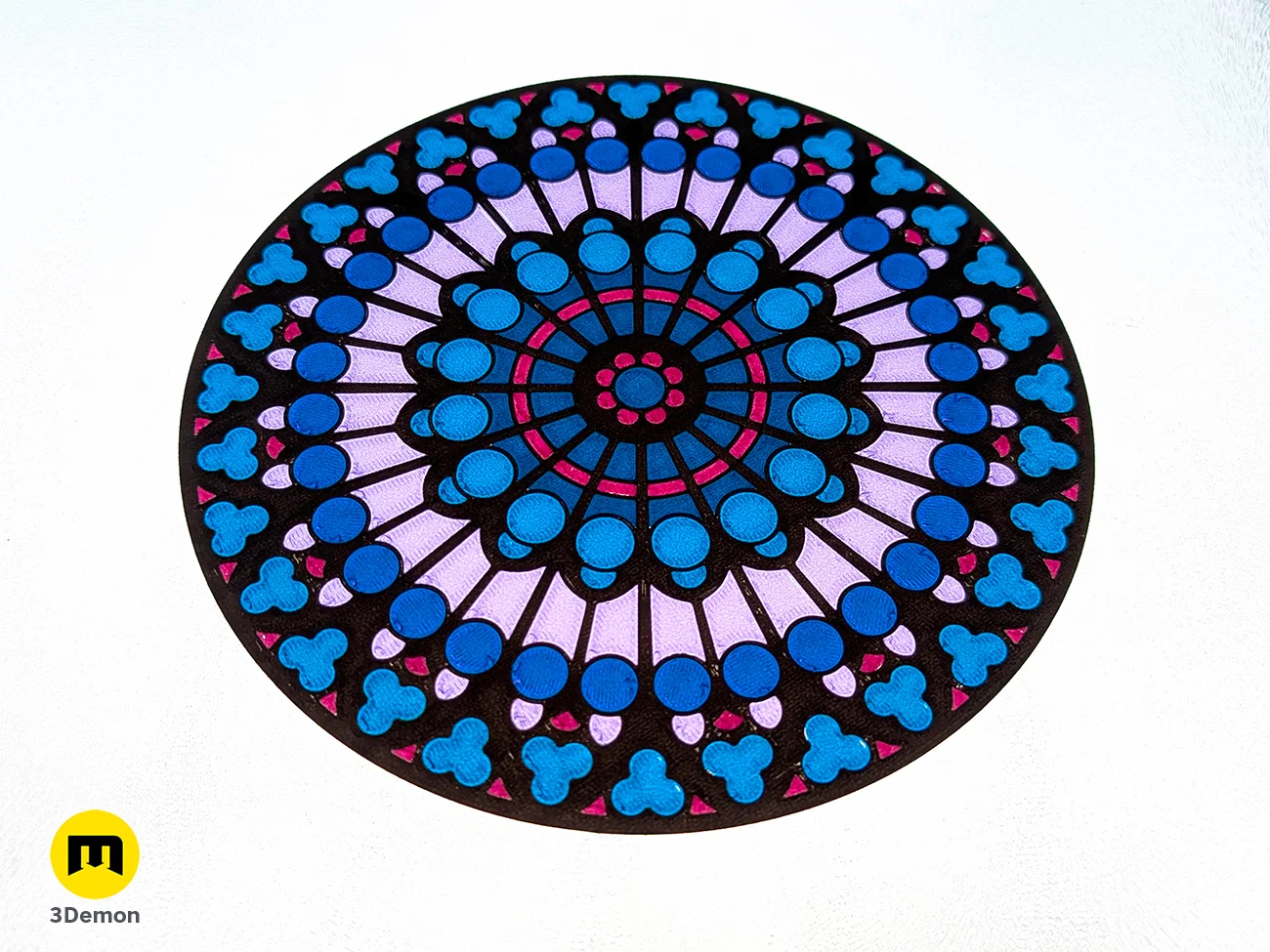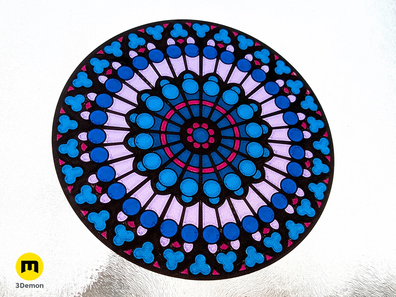 Tái hiện vẻ đẹp cửa sổ hoa hồng của nhà thờ Notre-Dame dưới dạng đồ trang trí 3D giả kính màu. Thiết kế dễ in, phù hợp cho cả máy đa màu lẫn đơn màu, giúp bạn tạo điểm nhấn nghệ thuật cho không gian sống một cách đơn giản và tiết kiệm.