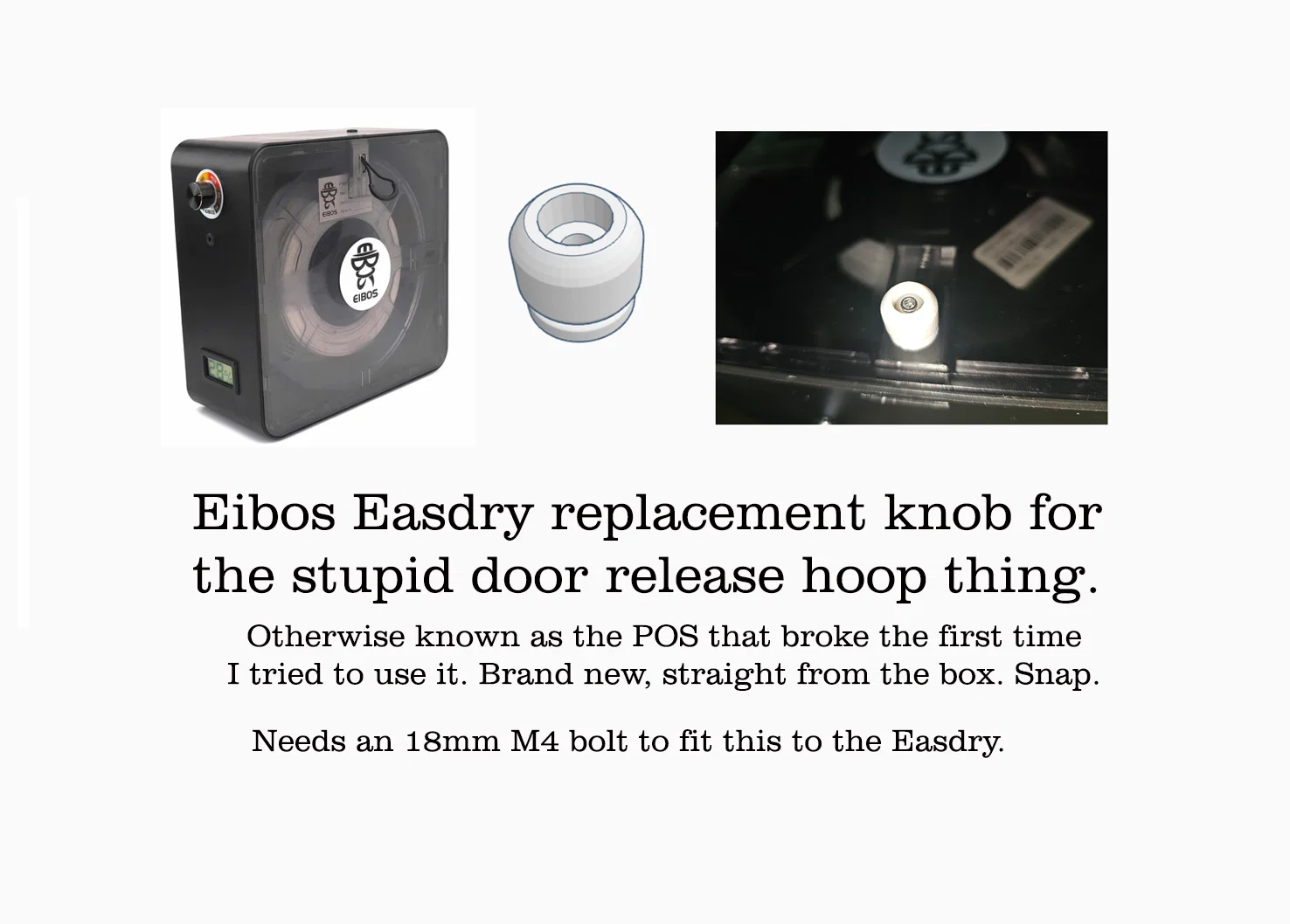 Cái dây rút mở cửa của máy sấy nhựa Eibos Easdry quá yếu và dễ đứt. Mình đã thiết kế một cái núm xoay thay thế chắc chắn, dễ lắp đặt bằng cách tận dụng con ốc M4 để làm chốt mở bền bỉ hơn hẳn thiết kế gốc.