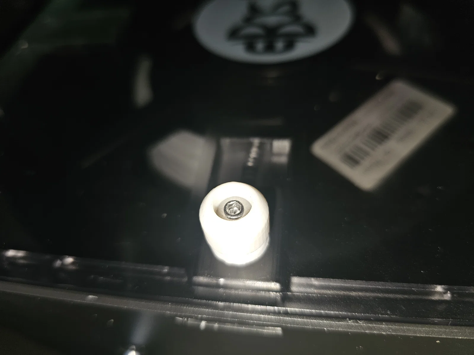 Mình dùng một con ốc lục giác M4 dài 18mm (16mm cũng được), vặn con ốc vào cái lỗ nhỏ của chốt để tự tạo ren vào phần nhựa. Công đoạn mồi ren là khó nhất, mình phải vừa ấn mạnh vừa xoay: vặn nửa vòng tới, nửa vòng lui, cứ thế lặp đi lặp lại để cắt ren vào nhựa (bên trong không còn đủ chỗ để dùng taro ren chuyên dụng nên con ốc phải tự làm việc đó).