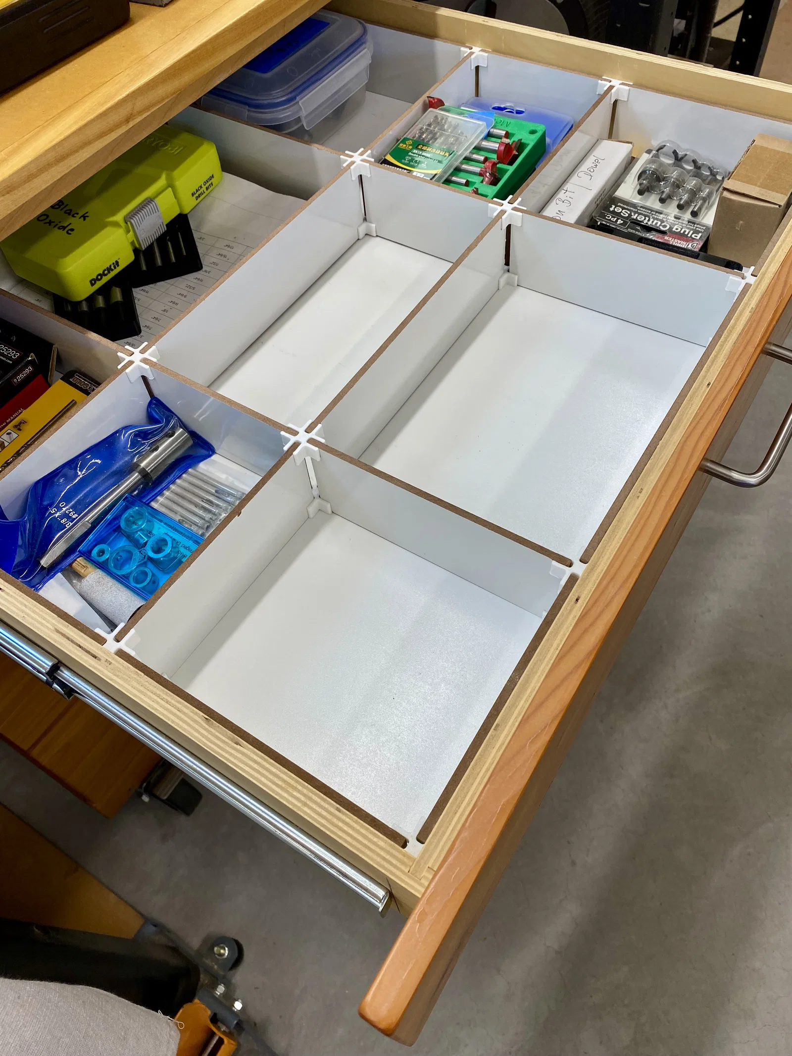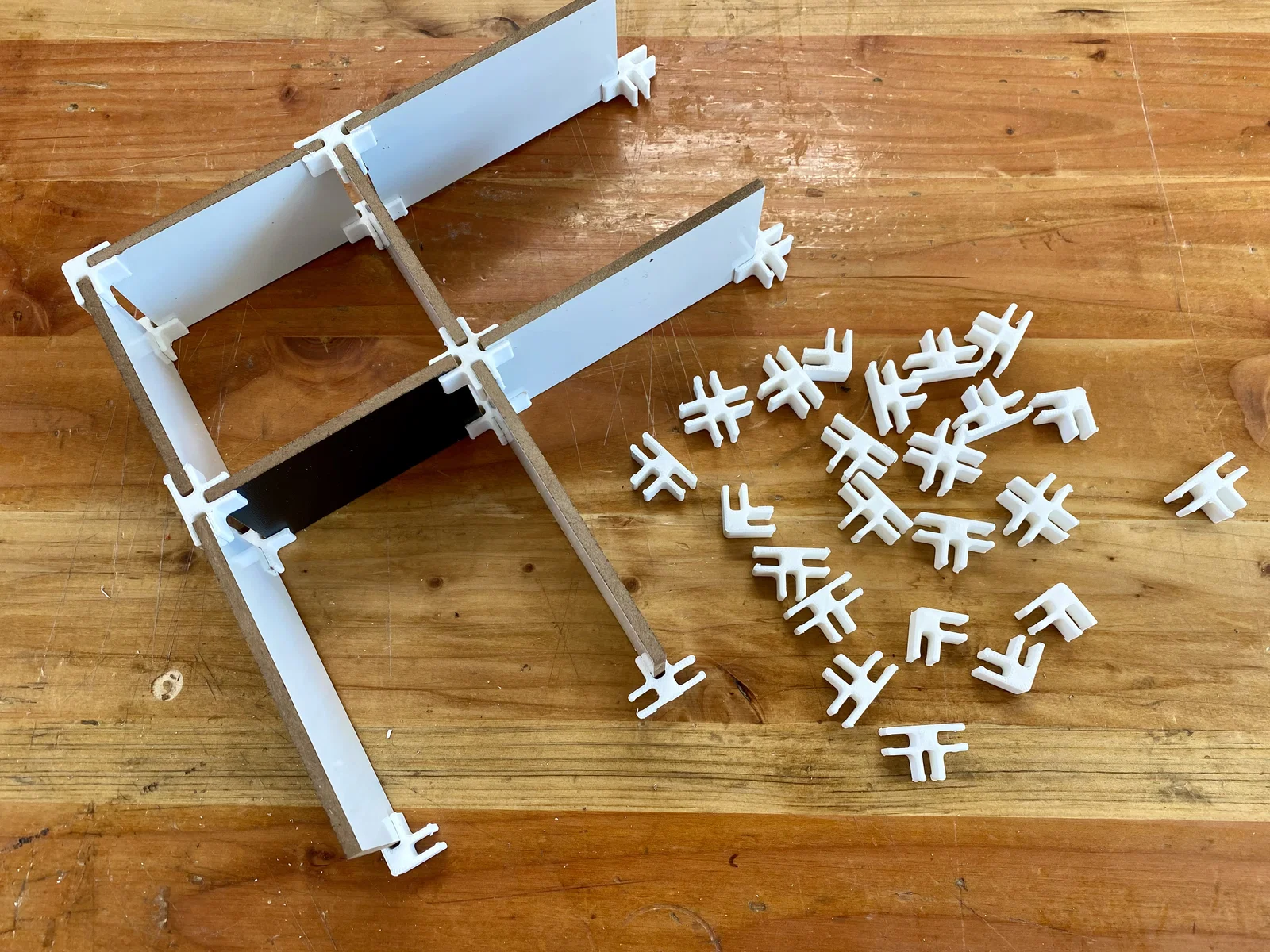 Các thanh chia ngăn kéo đơn giản được tạo bằng kẹp in 3D và tấm MDF trắng. Với 3 loại kẹp có hình dáng khác nhau cùng các tấm bảng có chiều dài tùy biến, bạn có thể tự do phân chia bất kỳ ngăn kéo nào theo vô vàn cách. Giải pháp này vừa rẻ, dễ thực hiện, cực kỳ linh hoạt lại còn rất hữu dụng! Xem thêm tại: https://www.instructables.com/Easy-Drawer-Dividers/