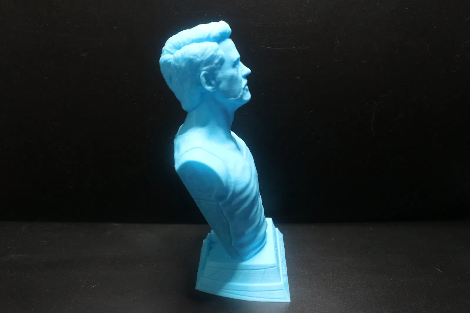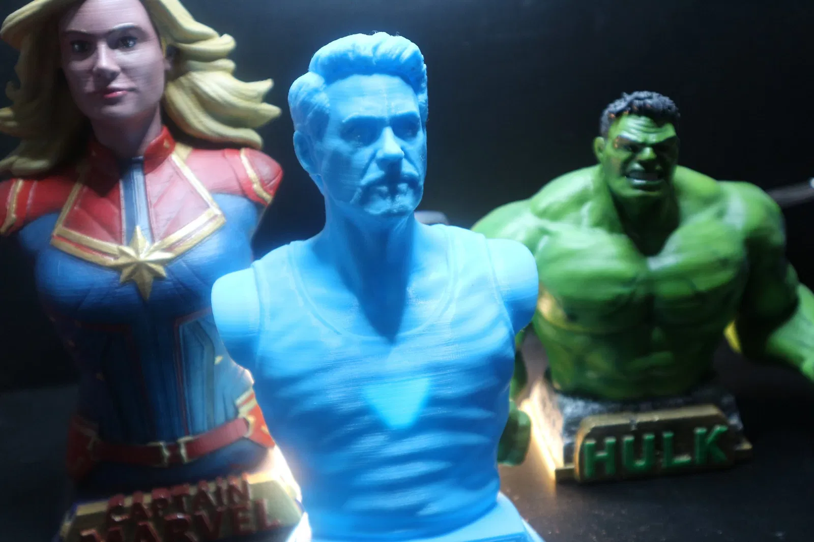 Robert Downey Jr trong vai Tony Stark/Iron Man Bust. Lò phản ứng của anh ta có thể sáng lên nếu anh ta đứng trước một số nguồn sáng.