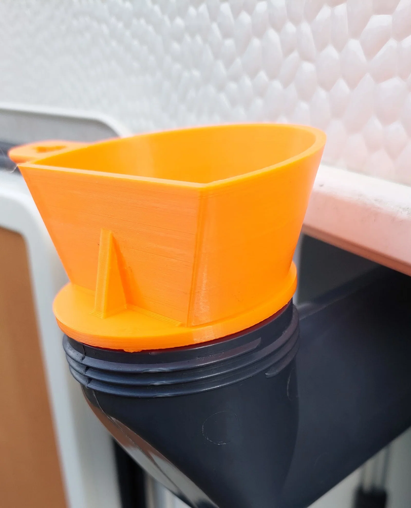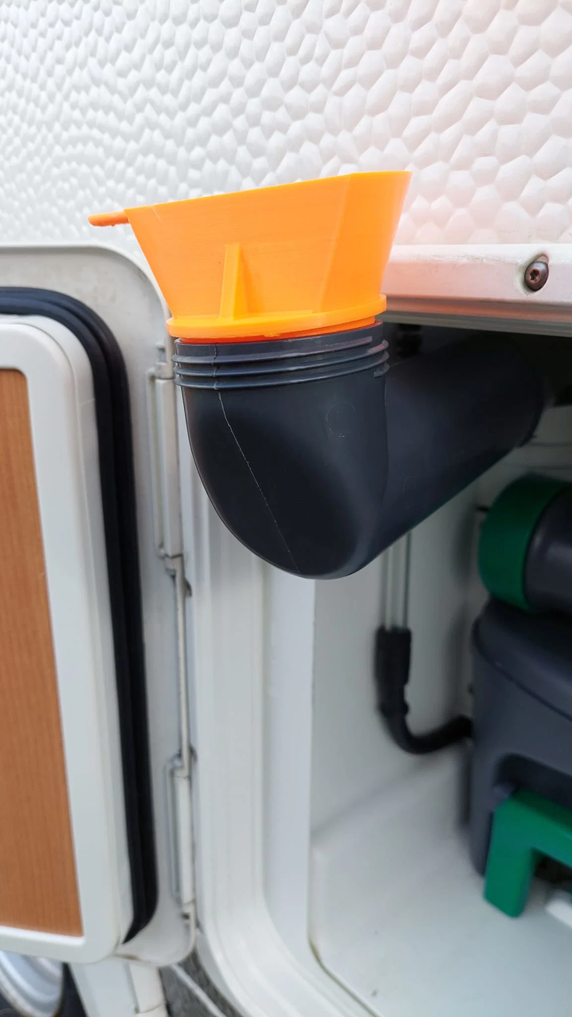 Mình đã thiết kế một phễu hỗ trợ đổ nước vào bình chứa của bồn cầu Thetford C500. Thiết bị này giúp ngăn chặn tình trạng nước bị đọng lại ngay tại miệng ống đổ. Nếu mọi người thấy file này hữu ích, xin hãy để lại một lượt Like giúp mình nhé.