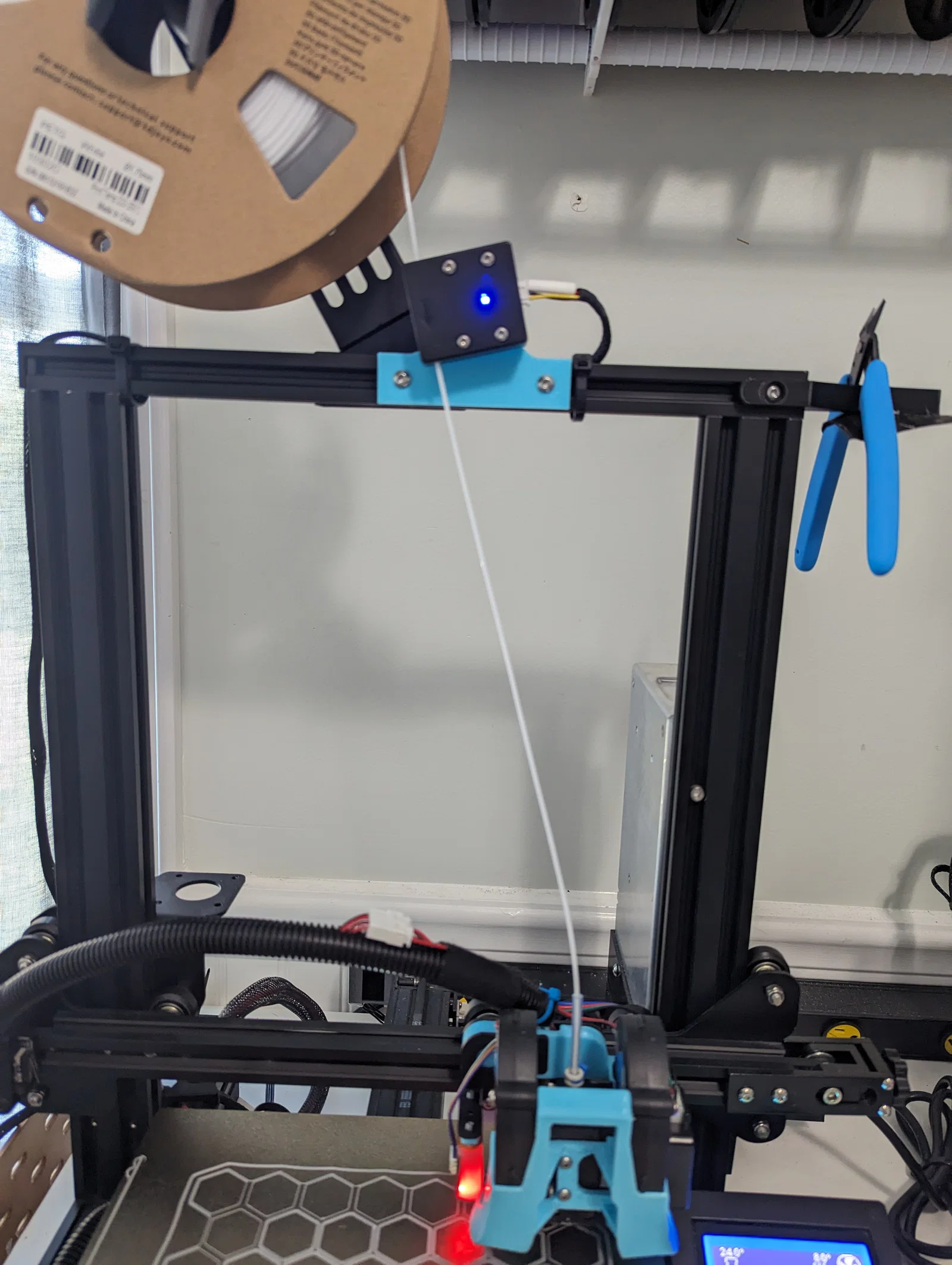 Gắn cảm biến hết nhựa lên thanh nhôm phía trên cho máy đã nâng cấp direct drive. Thiết kế hỗ trợ xoay linh hoạt, có rãnh cố định dây cáp để bảo vệ đầu nối, đi kèm hướng dẫn chi tiết cho các đời máy Ender 3/Pro.