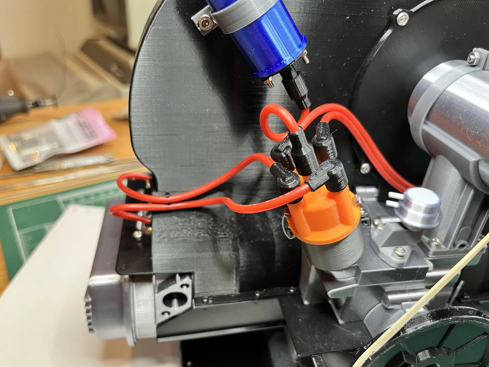 Việc lắp ráp các chi tiết này đòi hỏi sự khéo léo và kiên nhẫn để đảm bảo các đầu dây dẫn được kết nối đúng vị trí. Khi hoàn thiện, bộ phận này không chỉ đóng vai trò thẩm mỹ mà còn giúp người xem hình dung rõ hơn về cơ chế hoạt động bên trong của một hệ thống động cơ đốt trong truyền thống. Sự kết hợp giữa bộ chia điện màu cam nổi bật và các chi tiết dây đỏ tạo điểm nhấn thị giác cực kỳ ấn tượng trên nền tổng thể của mô hình.