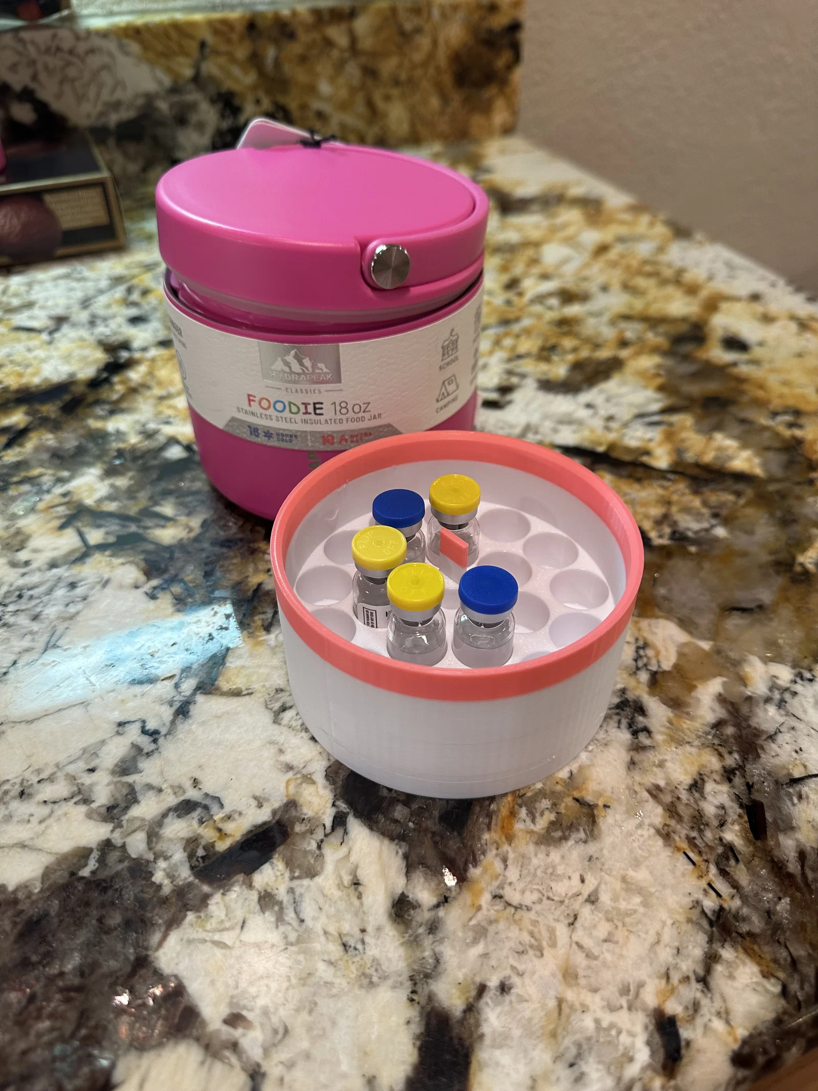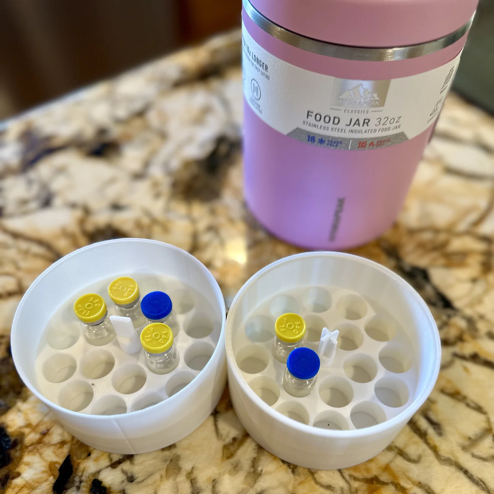 Mình đã thiết kế một khay chứa tùy chỉnh có khả năng giữ chắc chắn 20 lọ thủy tinh (vial). Với bình Hydrapeak loại 32 oz, bạn có thể đặt hai khay này vào trong, nâng tổng số lên đến 40 lọ. Các khay này được thiết kế kỹ lưỡng để vừa vặn hoàn hảo với cả hai dòng bình đựng thực phẩm 18 oz và 32 oz của Hydrapeak. Bản thân chiếc bình có khả năng bảo vệ cực tốt khỏi sương giá và độ ẩm, giúp bảo quản các lọ vial an toàn trong nhiều điều kiện khác nhau. Đây là giải pháp vô cùng thiết thực và hiệu quả để vận chuyển cũng như lưu trữ các loại lọ vial trong môi trường yêu cầu kiểm soát nhiệt độ và độ ẩm nghiêm ngặt.